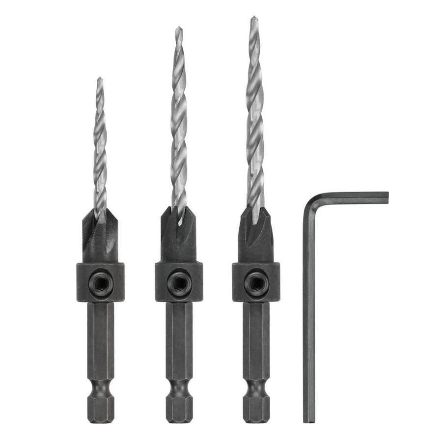 Contains #6, #8 and #10 countersinks Replacement tapered bits offered For fine wood drilling Drill, countersink, and counterbore in one step