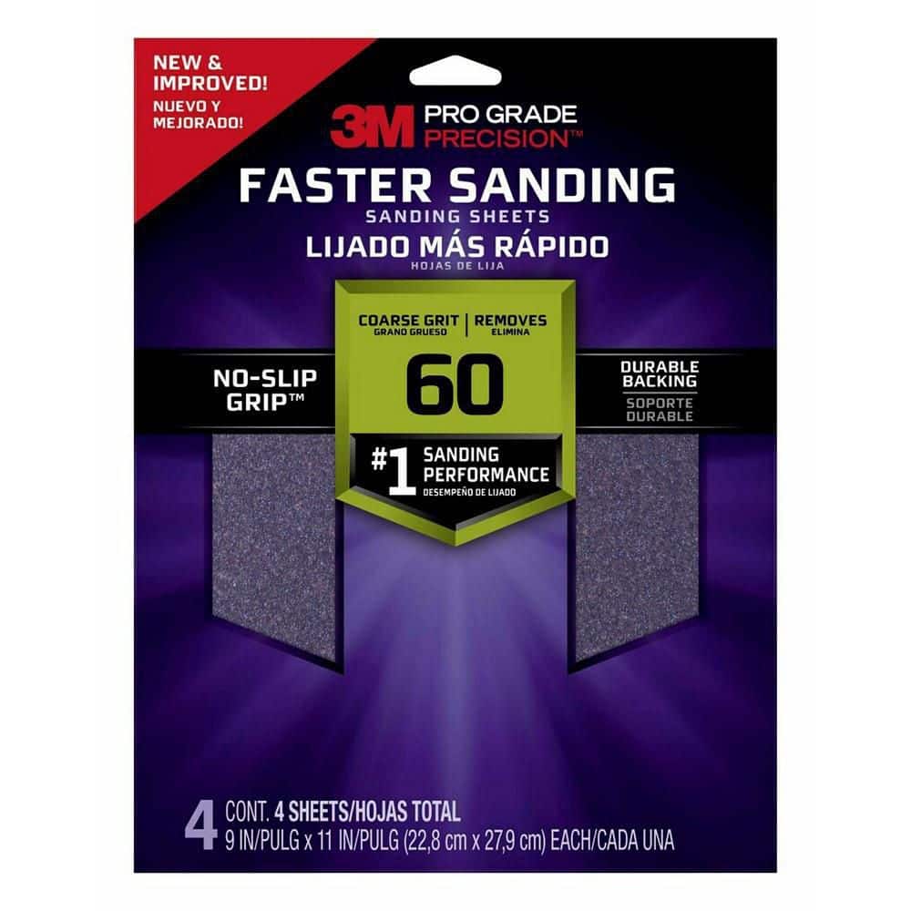 Experience superior sanding performance with 3M's Pro Grade Precision 60-Grit Sandpaper. Featuring enhanced mineral technology for faster results and NO-SLIP GRIP backing, these sheets resist clogging, making them ideal for a variety of surfaces such as wood, metal, and drywall.