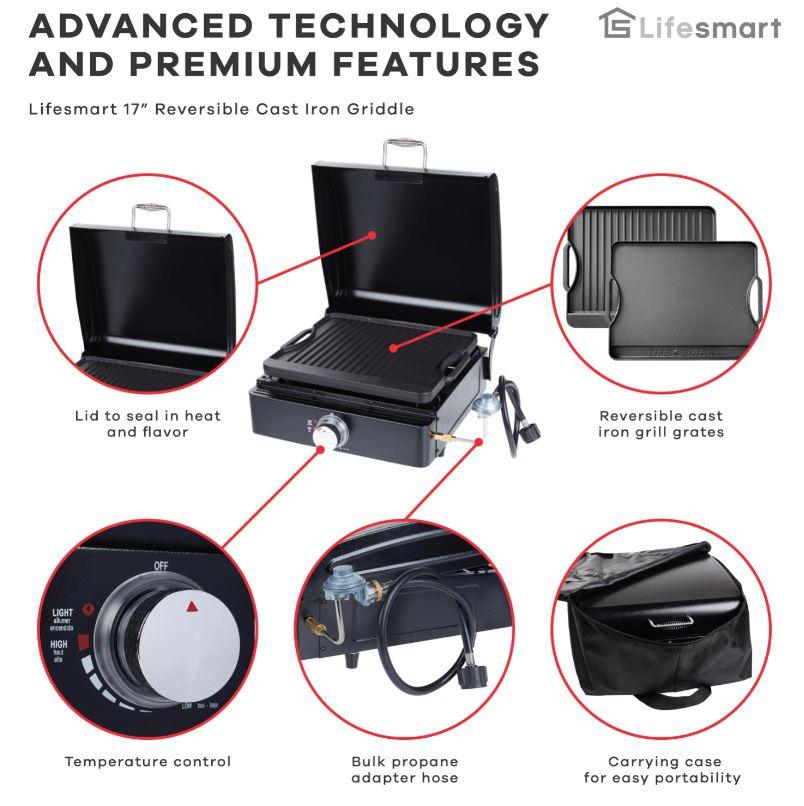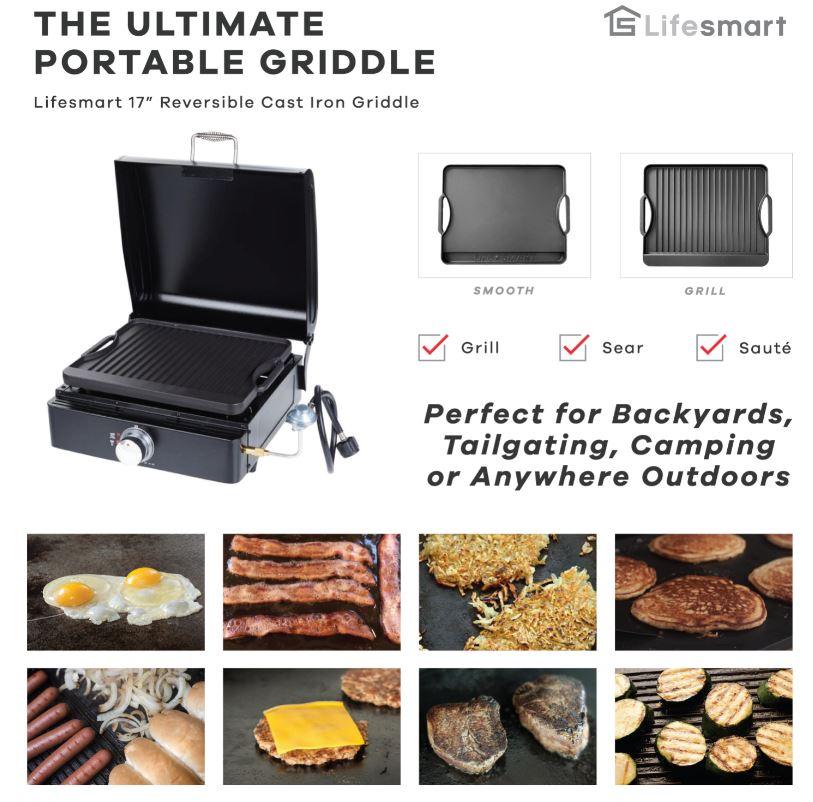 Lifesmart 17" Reversible Cast Iron Flat Top Gas Griddle with Lid and Carry Case