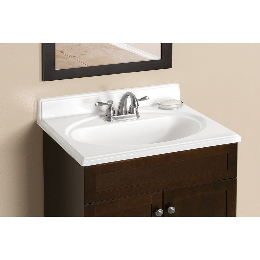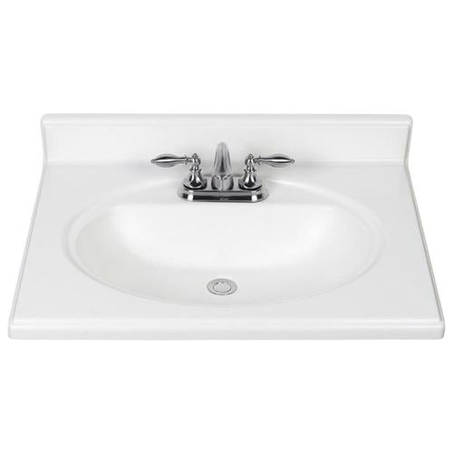 White premium cultured marble vanity top blends well with most bath decor Integral oval bowl for a seamless one-piece design 25-in W x 22-in D vanity top Pre-drilled for 4-in centerset faucets for easy installation (faucet sold separately) Integrated backsplash protects walls from water damage Ogee edge profile offers a classic and traditional look Fits 24-in W x 21-in D vanity cabinets Matching side splash available (sold separately)