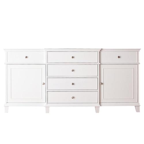 72 W x 22 D x 34 H inches Solid poplar wood frame and birch veneer MDF White finish Brushed nickel finished hardware 2 soft-close doors, 4 soft-close drawers and 2 interior shelves Adjustable height levelers Vanity top, sink and faucet not included