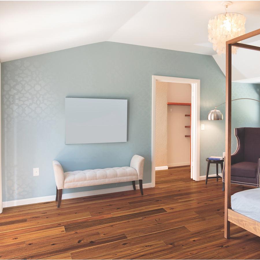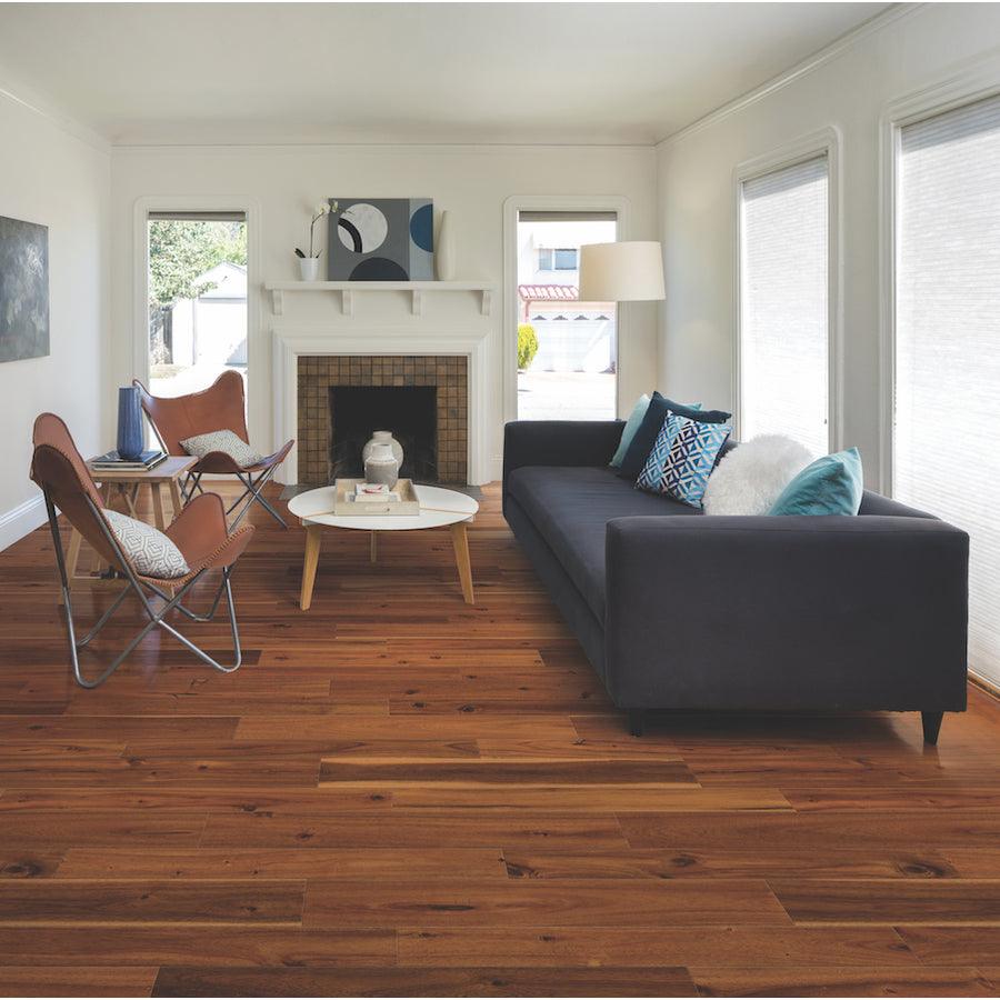 Multi-width, handscraped floor features 2 plank widths in the same box Rustic solid Acacia exotic hardwood with traditional tongue-and-groove installation