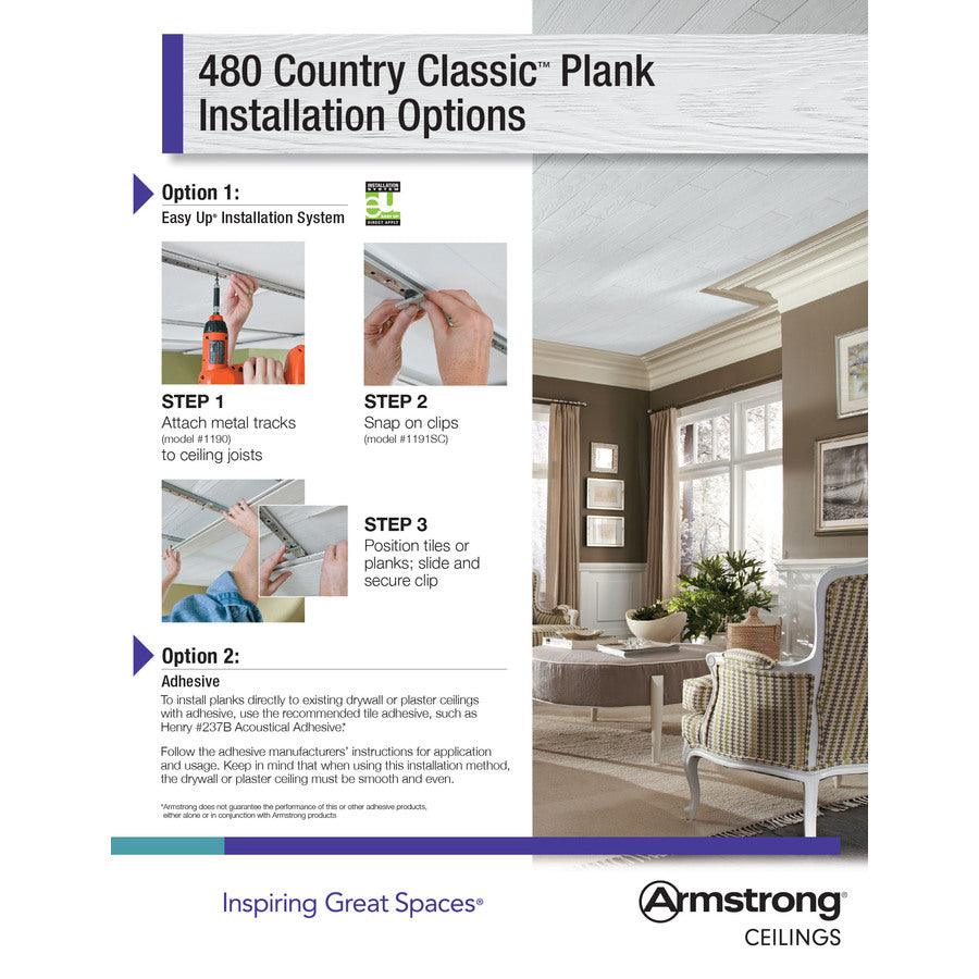 Mineral fiber plank with a real woodgrain appearance at an affordable price Great for covering up damaged drywall, plaster or popcorn ceilings Covers 40 sq ft per carton (20 pieces per carton) Beveled tongue and groove edge detail (no visible grid) Maximizes ceiling height; Installs directly to your existing ceiling or joists with the Armstrong® Easy Up® track (1190) and clip (1191SC) system or adhesive (Henry® 237 adhesive) Acoustical (CAC=30) Class A fire rating Can be painted or stained; check warranty information before making any modifications to product