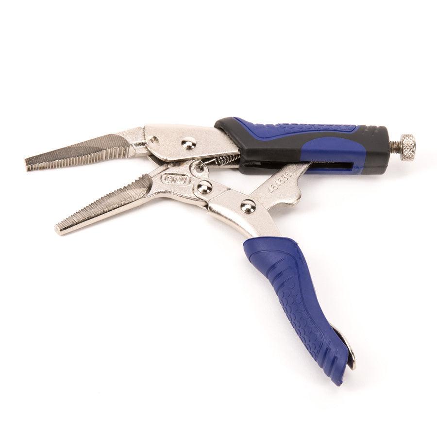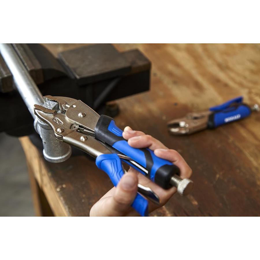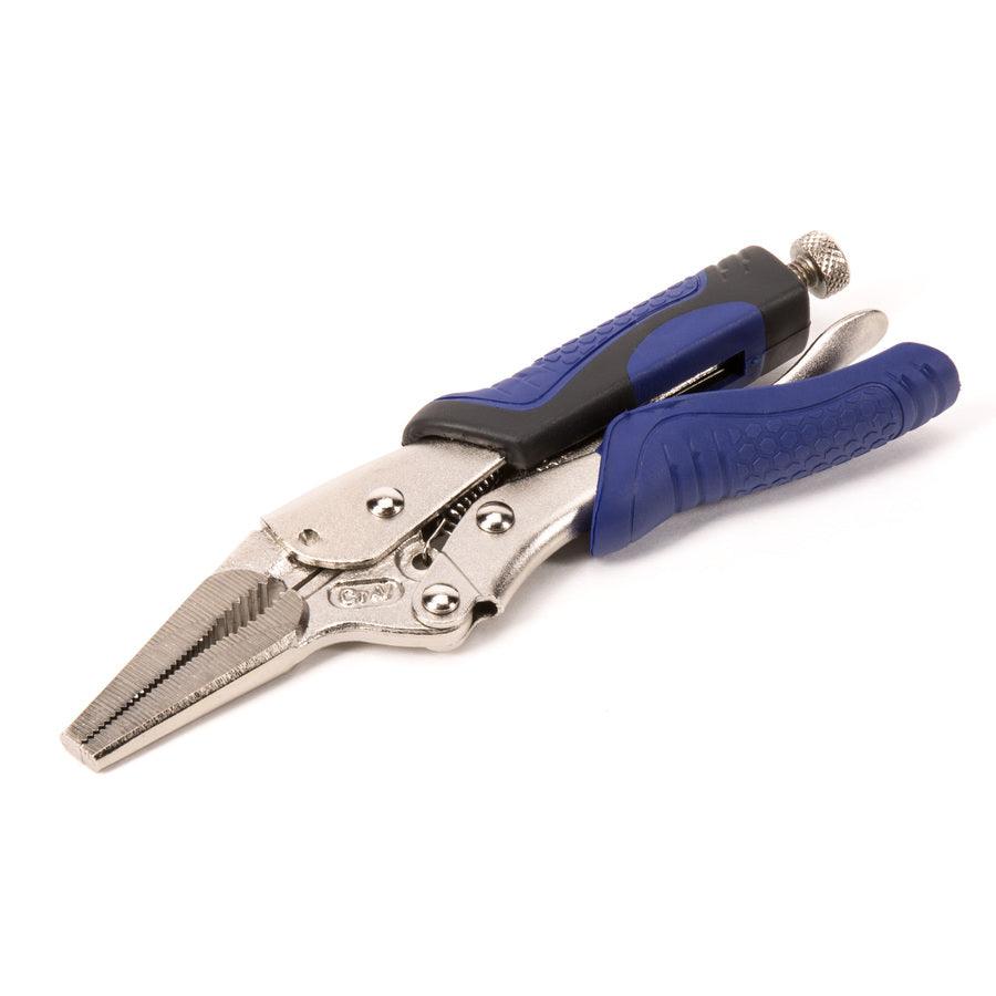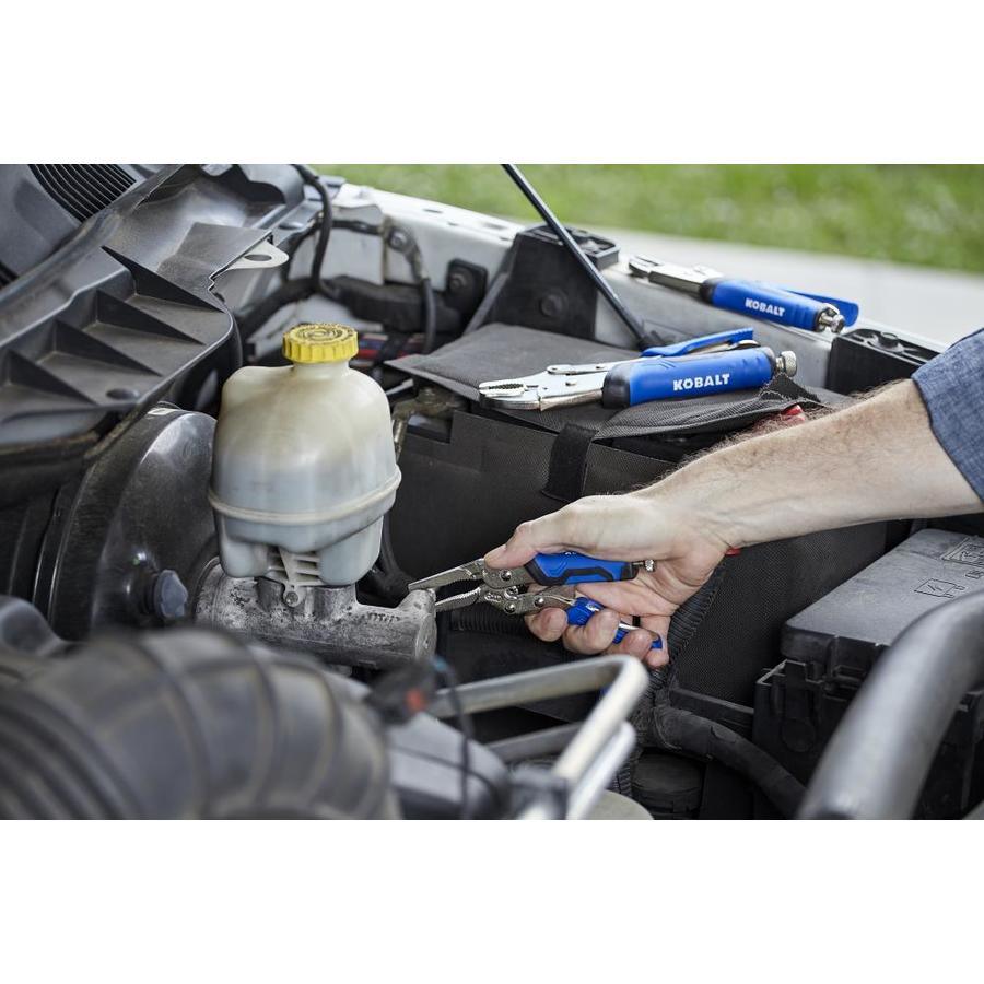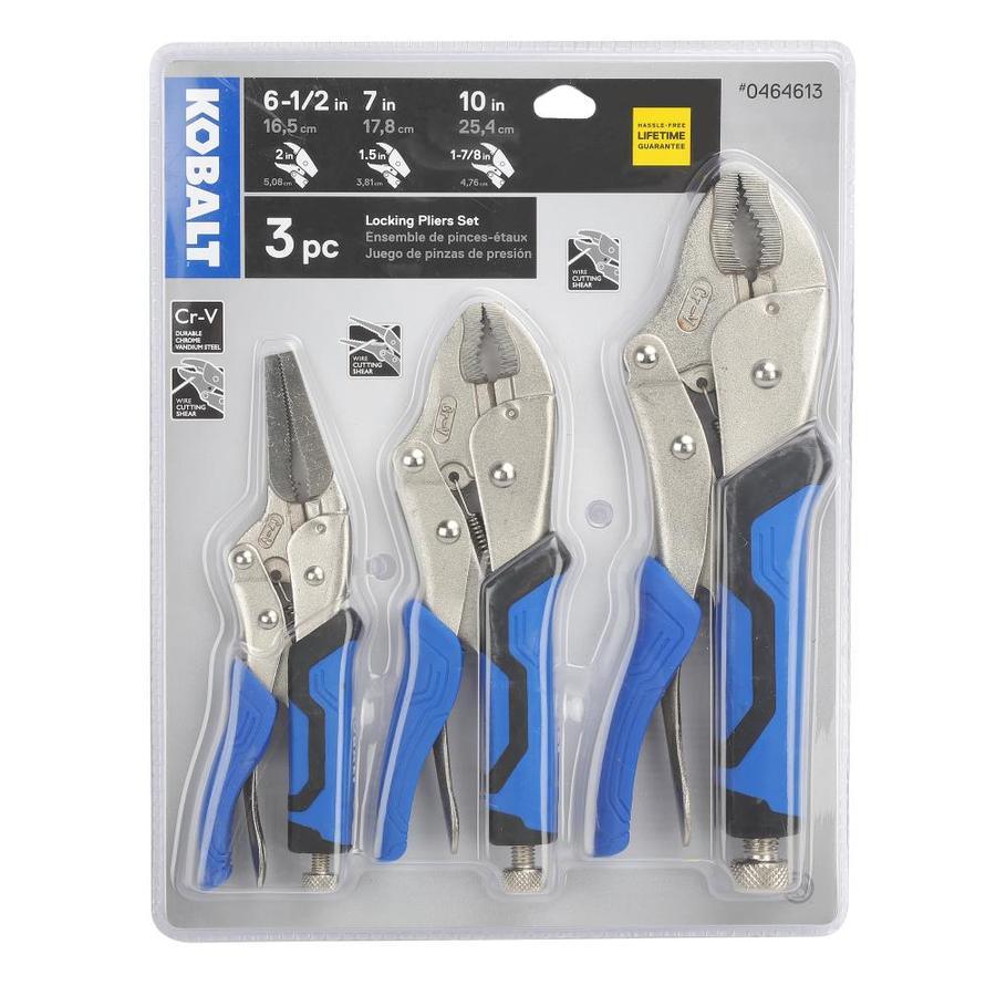 Kobalt 3-piece tool set features 6-1/2-in long-nose locking pliers, 7-in curved-jaw locking pliers and 10-in curved-jaw locking pliers Drop-forged chrome vanadium steel design provides exceptional strength and longevity for frequent use Precision-machined jaws grip objects better and offer long-lasting durability Ergonomic bi-material anti-slip grips offer extended user comfort Ideal for projects around the home, like cutting wire or loosening bolts Nickel plated for longer rust resistance