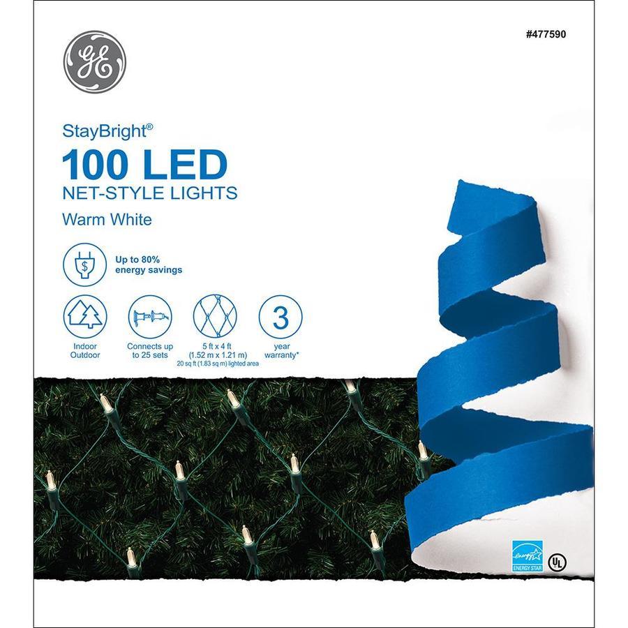 100-Count GE StayBright LED warm white 5.5-mm Christmas net lights Green cord with 20 square feet lighted area matches your Christmas decor and illuminates your home's exterior Can connect with up to 25 sets to make decorating your home a breeze Replacement bulbs and fuses included for added convenience ENERGY STAR qualified products help you save money on utility bills without sacrificing performance, style or comfort UL safety listing demonstrates this product has met minimum requirements of widely accepted product safety standards 3-Year limited warranty gives you peace of mind Available only at ARB265W