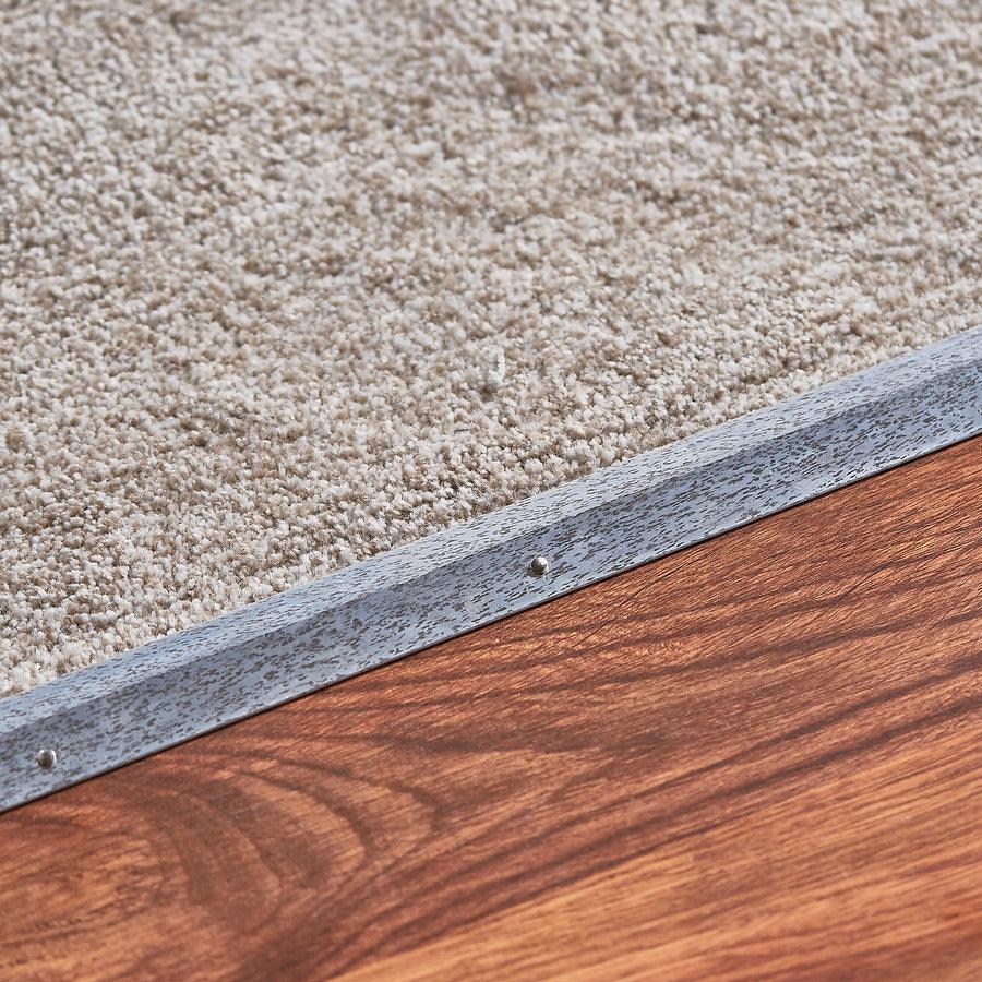 Transitions medium-high pile carpet to other surfaces of lesser height Covers seam and protects edges of flooring Hammered product design with an anodized silver finish Includes pre-drilled holes