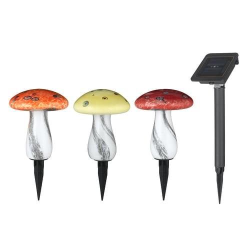 Includes 3 solar-powered LED path lights and a rechargeable battery Mushroom-shaped bulbs are vibrant and sturdy Up to 8 hours of light on one charge 1.2 lumens provide bright light 1-year base warranty on the parts gives you peace of mind Photocell control feature automatically turns the lights on at dusk and off at dawn for convenience and energy savings Easy, no-wire installation Perfect for garden lighting