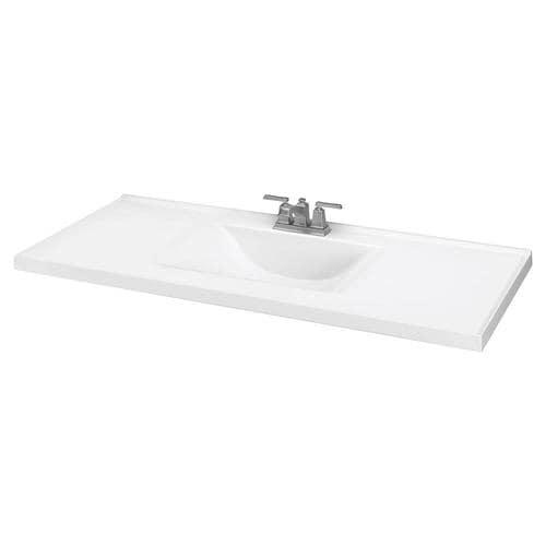 White premium cultured marble vanity top blends well with most bath decor Integral rectangular bowl for a seamless one-piece design 49-in W x 22-in D vanity top Pre-drilled for 4-in centerset faucets for easy installation (faucet sold separately) Dripless edge keeps water from running off top Fits 48-in W x 21-in D vanity cabinets
