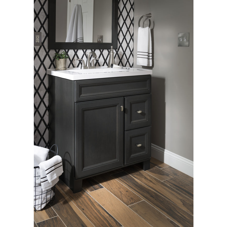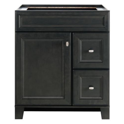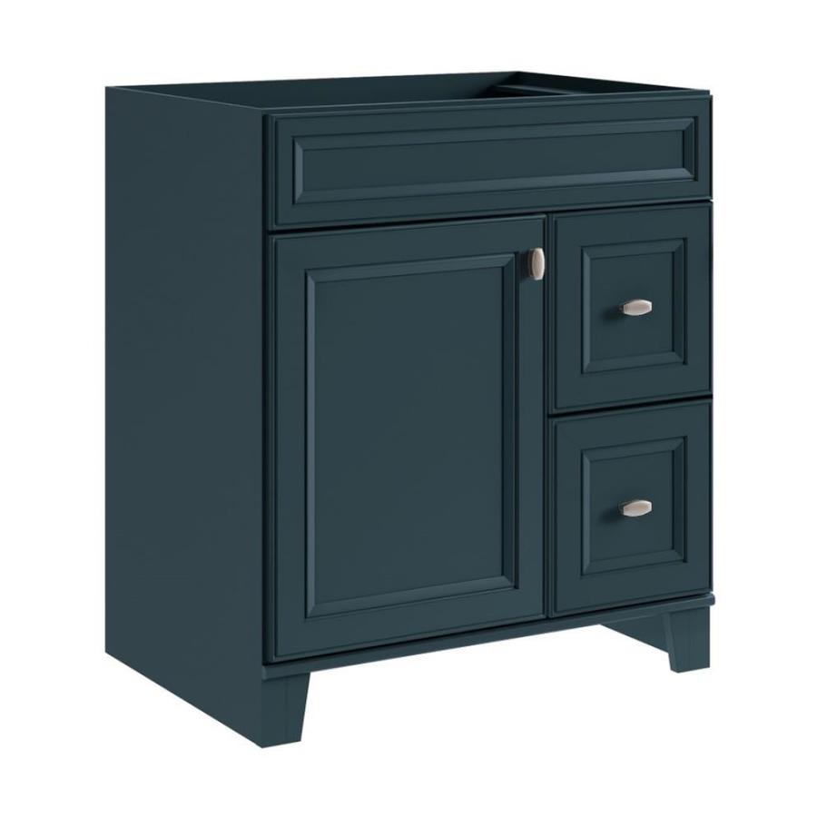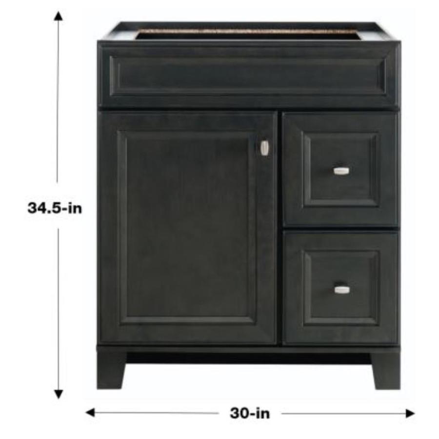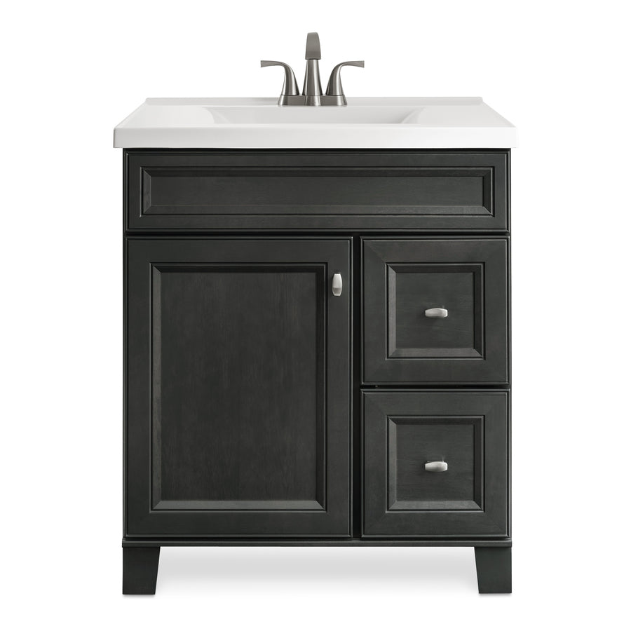 Dark storm finish vanity from the Goslin collection blends well with most bath decor Features 2 full-extension drawers and a cabinet door Great for transitional style decor Compatible with 31-in W x 22-in D vanity tops (sold separately) 30-In W x 21-in D bathroom vanity Brushed-nickel finish hardware adds a touch of shine Fully assembled and ready to be installed Select sizes available for pickup today in stores All collections and sizes available for delivery to store within 7 days or less