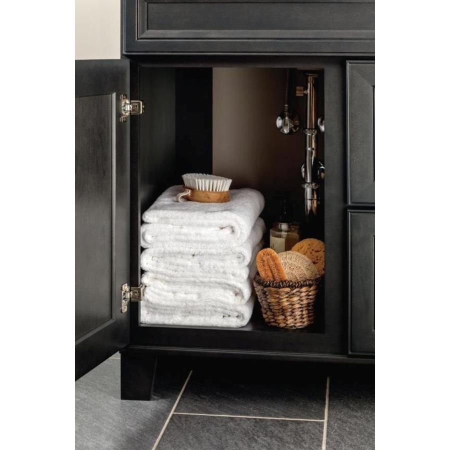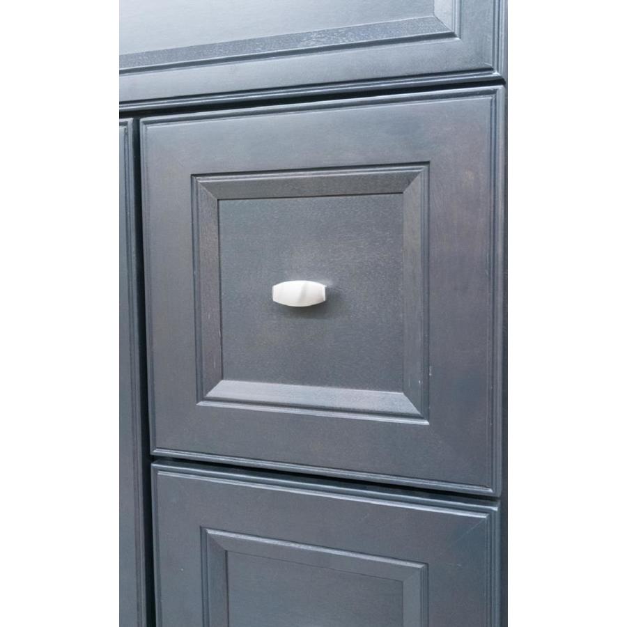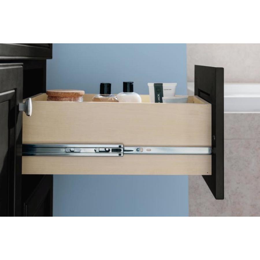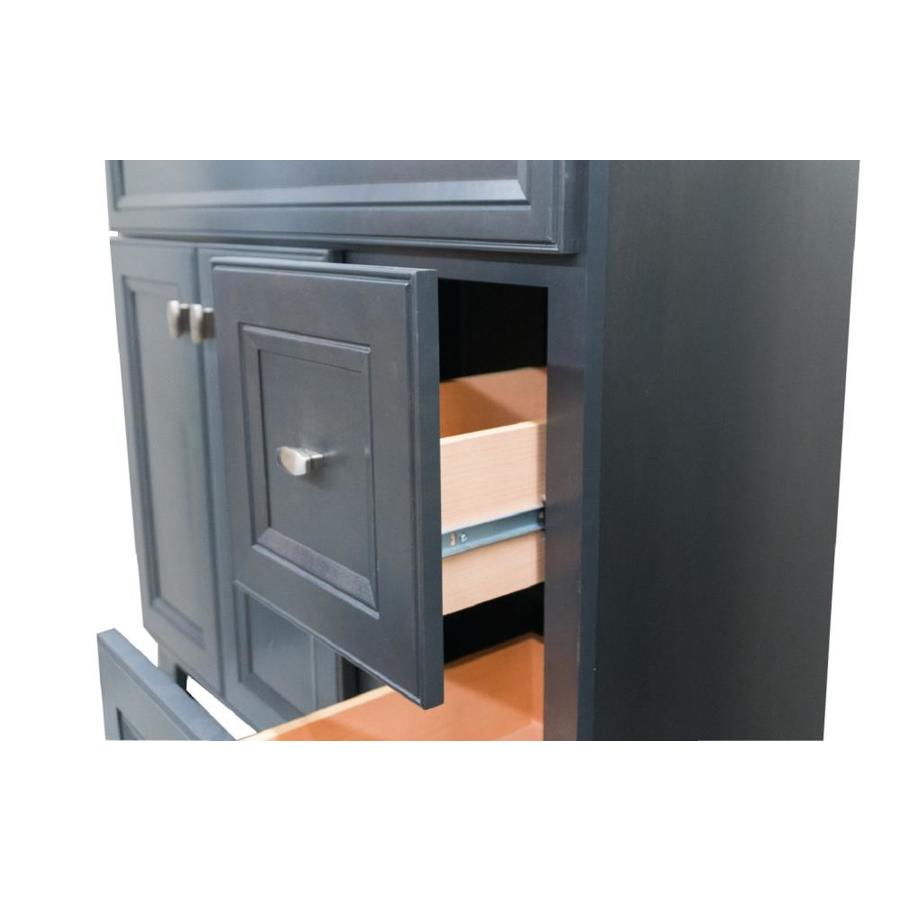Dark storm finish vanity from the Goslin collection blends well with most bath decor Features 2 full-extension drawers and a cabinet door Great for transitional style decor Compatible with 31-in W x 22-in D vanity tops (sold separately) 30-In W x 21-in D bathroom vanity Brushed-nickel finish hardware adds a touch of shine Fully assembled and ready to be installed Select sizes available for pickup today in stores All collections and sizes available for delivery to store within 7 days or less