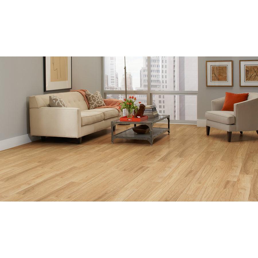 This light-tone hickory flooring offers a smooth finish, medium gloss and square edge to brighten any decor To make your room appear larger, install planks parallel to the longest wall Limited Lifetime Warranty with AC4 wear layer provides excellent scratch and scuff resistance 10mm thickness for greater stability and sound control Easy to install locking system requires no glue and makes installing a laminate floor an easy DIY project - coordinated mouldings available Underlayment is attached, but for enhanced performance we recommend Pergo Gold for increased thermal comfort and sound insulation plus it has a built-in moisture barrier CARB Phase 2 Compliant Manufactured in the USA with materials from USA and Europe Planks per carton: 8. Carton weight: 28.37 lbs