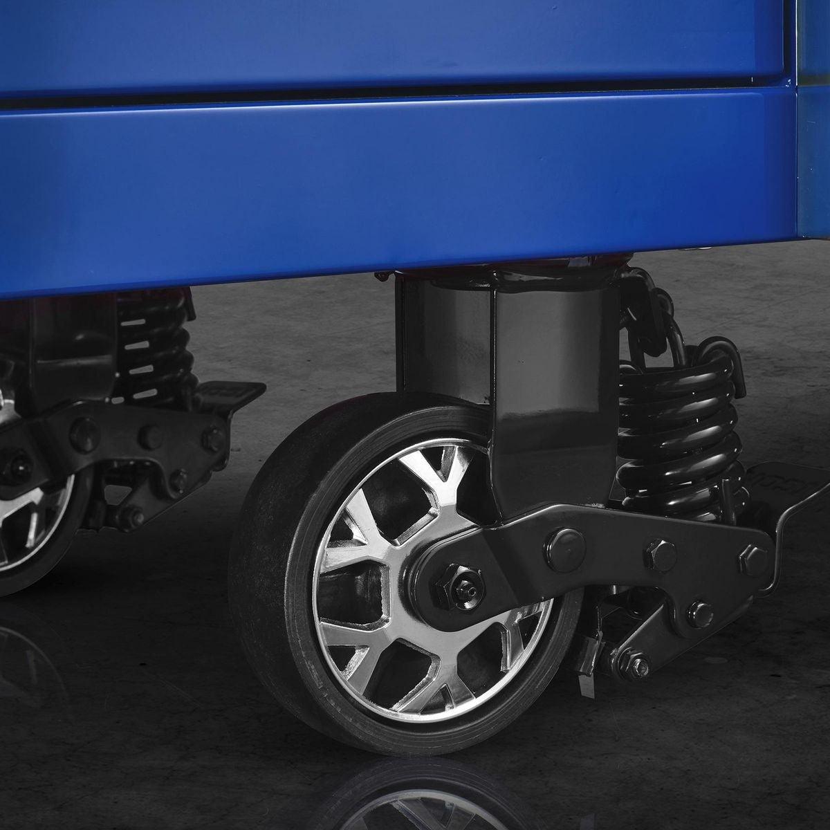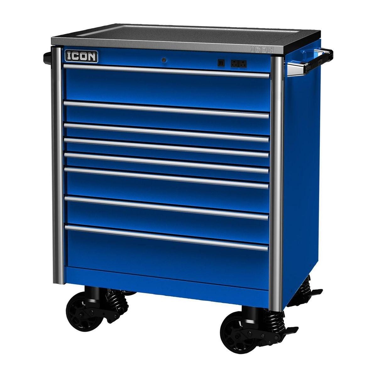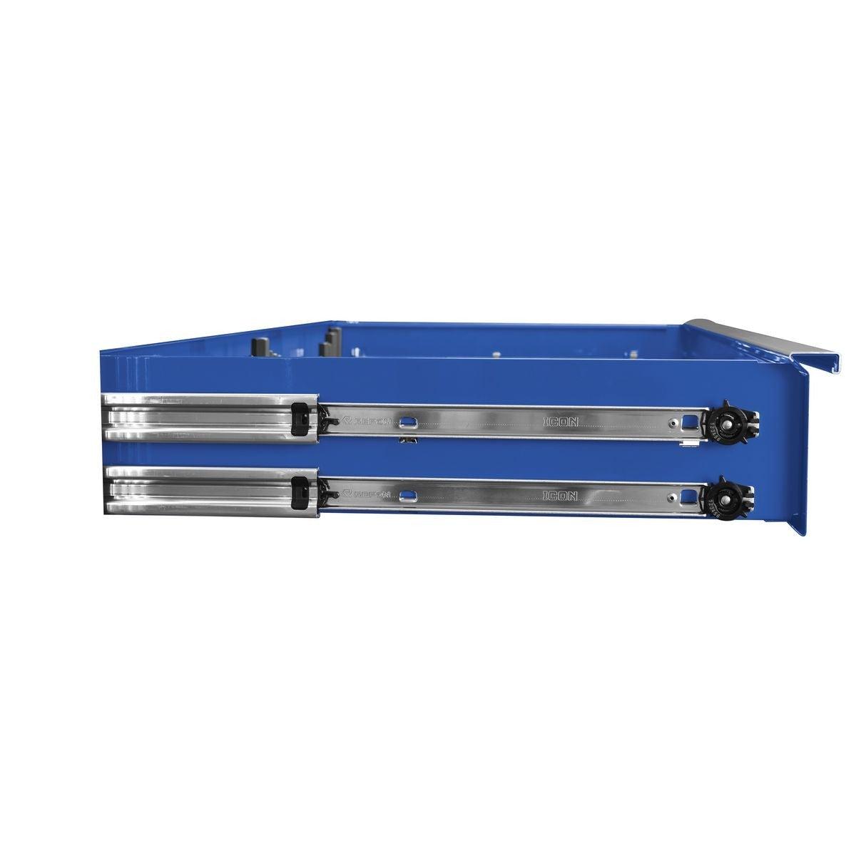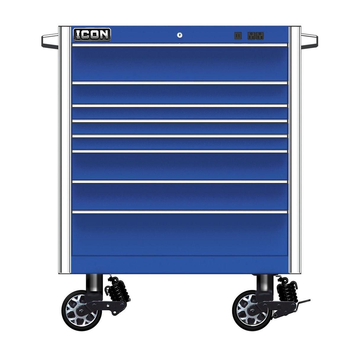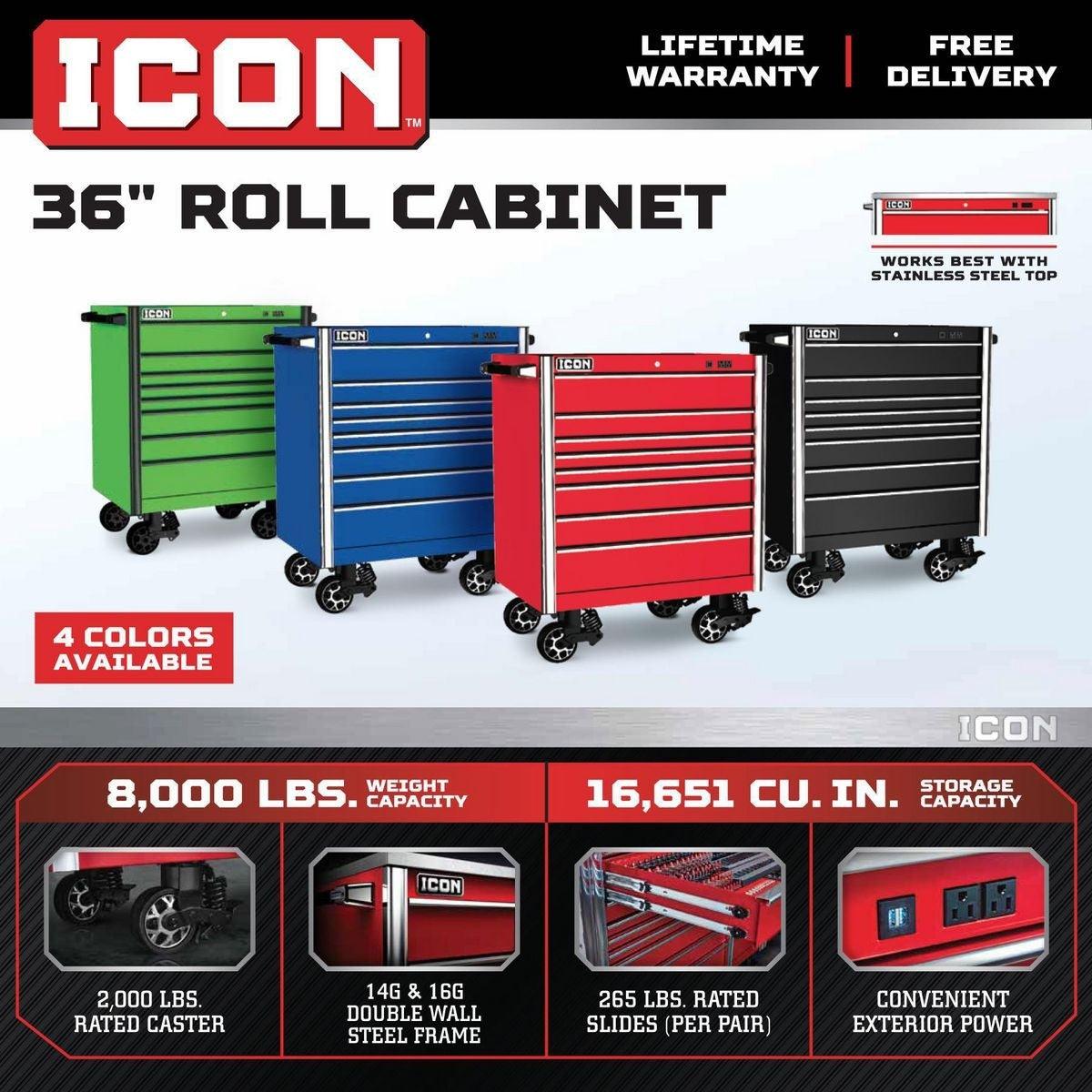 Built with the strongest steel and precision reinforced welds, Icon™ storage is tough enough for the daily grind of a busy shop…and you don’t have to break the bank to get the tool cabinet you deserve. Every Icon™ cabinet features a double-wall steel frame for ultimate strength. Industry-leading 16-gauge top and outside panels prevent dents and withstand the demands of daily use, and 18-gauge inside panels evenly support drawer and slide weight. Structural corner brackets prevent cabinet twist and racking. Under every Icon™ roller cabinet, three 14-gauge U channels distribute weight evenly to the industry-leading 2,000-pound-rated suspension casters with easy locks, so these boxes glide into place easily and stay in place securely. With a staggering 8,000-pound capacity, Icon™ roller cabinets are more than double the overall weight capacity of comparably sized Snap-On cabinets. These boxes are beautiful. Their premium ultra-tough powder-coat finish will withstand harsh chemicals and provide a showroom finish that looks like new, even after years of punishing use. Every drawer features the highest-quality ball bearing full extension drawer slides that support up to 265 pounds per set—or 530 pounds for drawers with double slides—even more than Snap-On’s Masters Series. An adjustable-force drawer latch system lets you dial-in just the right amount of force to keep drawers from opening when they should be closed. And heavy-duty non-slip drawer liners will keep your tools in place...right where you put them. Icon™ storage features an integrated power system. The convenient exterior power is equipped with two fast-charging USBs and two 110V outlets. An advanced locking system turns your tool cabinet into a vault to keep your valuable tools safe and secure. The interchangeable core lock comes with security milled keys that allow you to key-alike all your Icon™ storage units as you expand. The base cabinets are offered in three sizes - 36, 56 and 73 inches. And all Icon™ storage comes in four colors: Red, Blue, Black and Green. All Icon™ storage comes with free door-to-door delivery and a lifetime warranty - plus, a full line of replacement parts is available. It’s the only storage solution you’ll ever need.