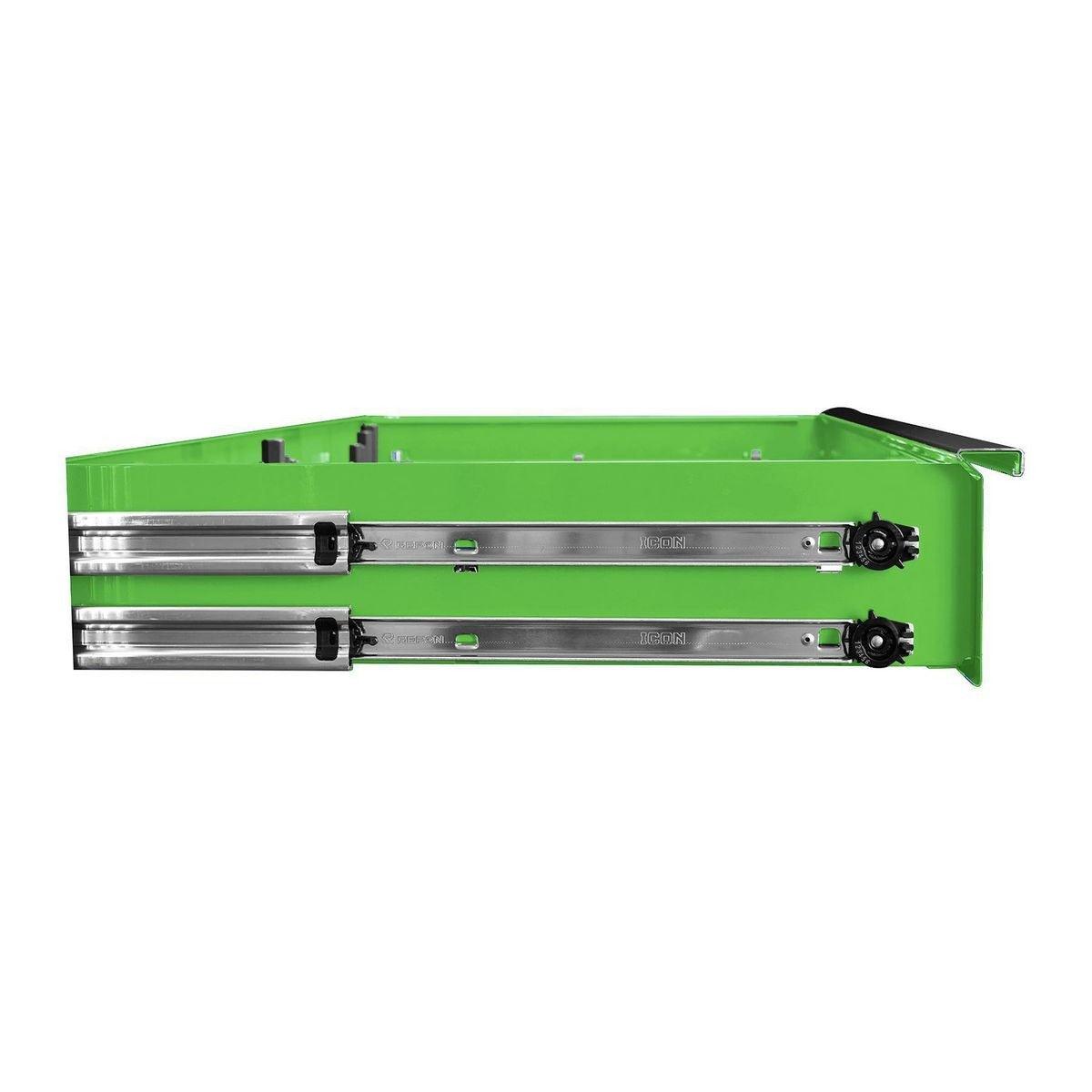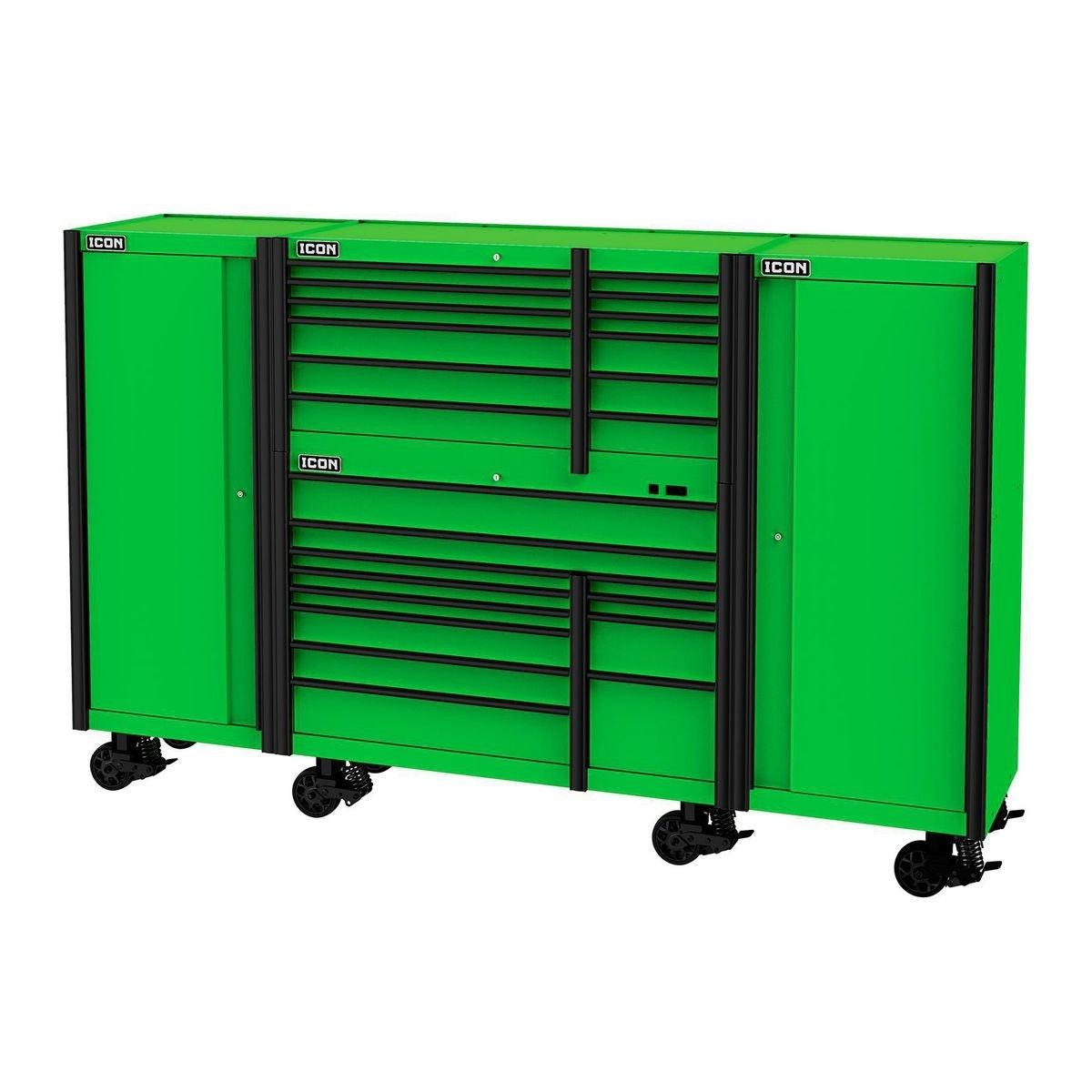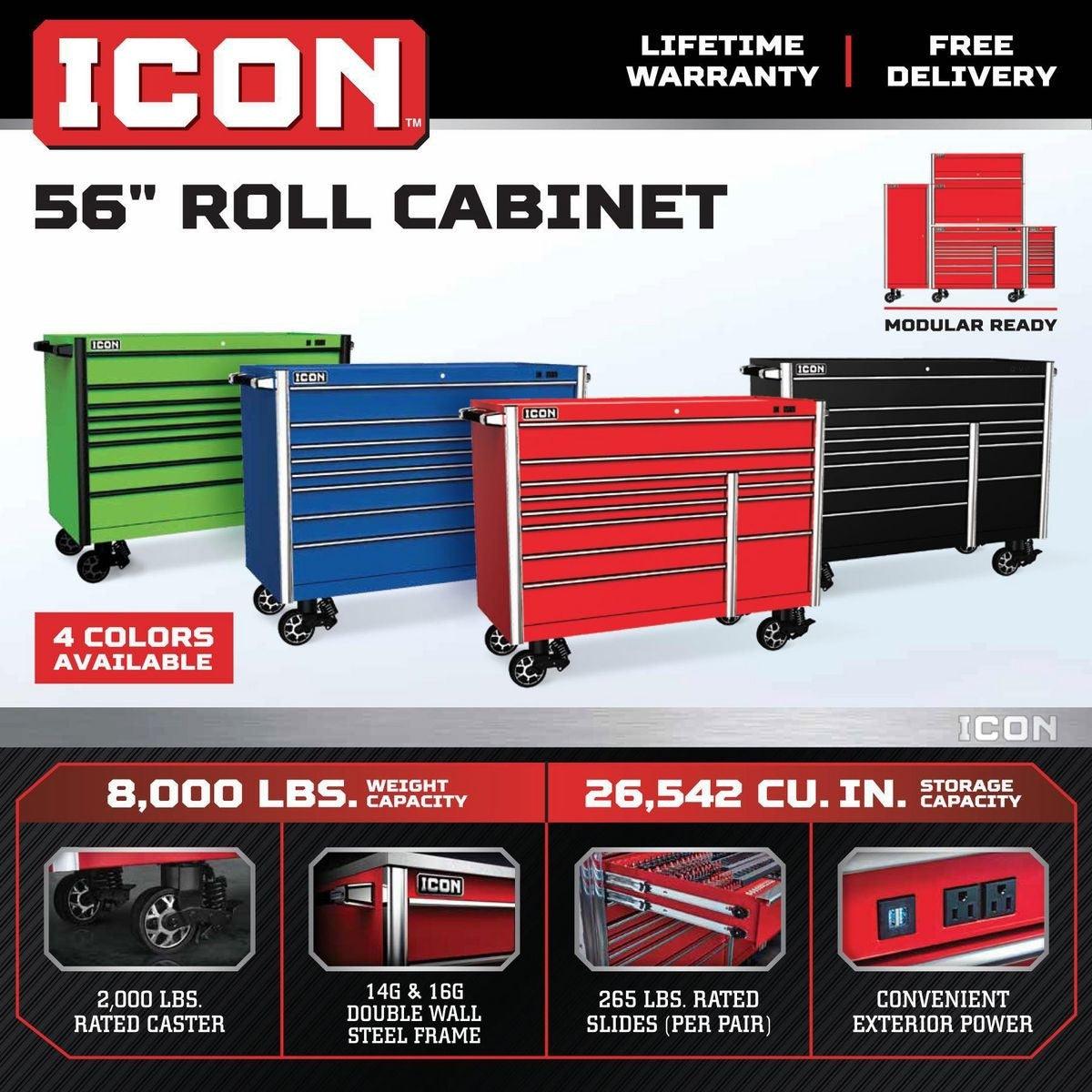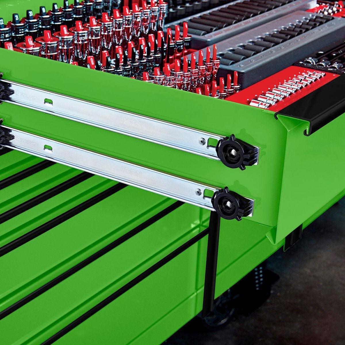 Built with the strongest steel and precision reinforced welds, Icon™ storage is tough enough for the daily grind of a busy shop…and you don’t have to break the bank to get the tool cabinet you deserve. Every Icon™ cabinet features a double-wall steel frame for ultimate strength. Industry-leading 16-gauge top and outside panels prevent dents and withstand the demands of daily use, and 18-gauge inside panels evenly support drawer and slide weight. Structural corner brackets prevent cabinet twist and racking. Under every Icon™ roller cabinet, three 14-gauge U channels distribute weight evenly to the industry-leading 2,000-pound-rated suspension casters with easy locks, so these boxes glide into place easily and stay in place securely. With a staggering 8,000-pound capacity, Icon™ roller cabinets are more than double the overall weight capacity of comparably sized Snap-On cabinets. These boxes are beautiful. Their premium ultra-tough powder-coat finish will withstand harsh chemicals and provide a showroom finish that looks like new, even after years of punishing use. Every drawer features the highest-quality ball bearing full extension drawer slides that support up to 265 pounds per set - or 530 pounds for drawers with double slides - even more than Snap-On’s Masters Series. An adjustable-force drawer latch system lets you dial-in just the right amount of force to keep drawers from opening when they should be closed. And heavy-duty non-slip drawer liners will keep your tools in place...right where you put them. Icon™ storage features an integrated power system. The power charging drawer has two fast-charging USBs and six 110v outlets with extendable chain-style power management. The deep power tool drawer includes six adjustable height holsters for easy access to air and power tools. Interior and exterior electrical outlets and USB ports give you easy access to power when and where you need it. We even designed a detachable power supply so you can move the cabinet without dragging the cord. And a Y-cord comes with the base cabinet so when you add a work center, you only have to plug in the cabinet once. An advanced locking system turns your tool cabinet into a vault to keep your valuable tools safe and secure. The interchangeable core lock comes with security milled keys that allow you to key-alike all your Icon™ storage units as you expand. Icon™’s modular design offers endless configurations for maximum flexibility so the system can grow with your needs. Customize your storage with expansion options like work centers, end lockers, end cabinets, overhead storage and top chests. The base cabinets are offered in three sizes - 36, 56 and 73 inches. And all Icon™ storage comes in four colors: Red, Blue, Black and Green. All Icon™ storage comes with free door-to-door delivery and a lifetime warranty—plus, a full line of replacement parts is available. It’s the only storage solution you’ll ever need.