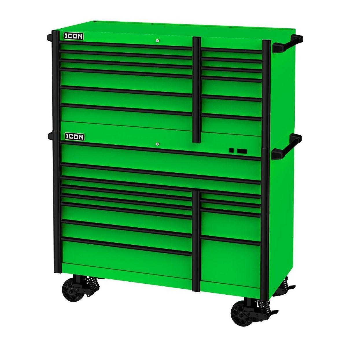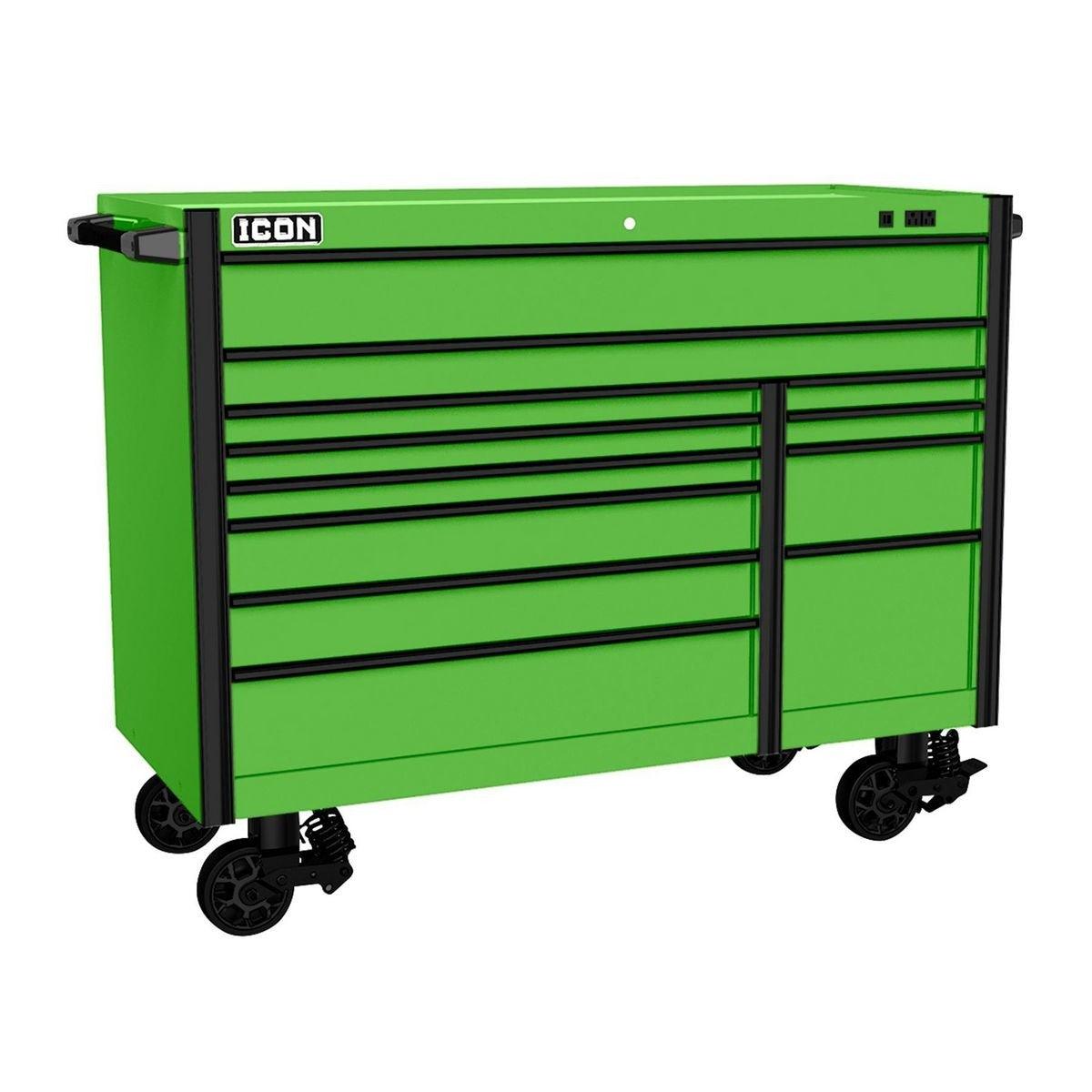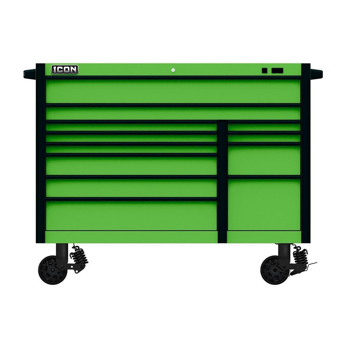 Built with the strongest steel and precision reinforced welds, Icon™ storage is tough enough for the daily grind of a busy shop…and you don’t have to break the bank to get the tool cabinet you deserve. Every Icon™ cabinet features a double-wall steel frame for ultimate strength. Industry-leading 16-gauge top and outside panels prevent dents and withstand the demands of daily use, and 18-gauge inside panels evenly support drawer and slide weight. Structural corner brackets prevent cabinet twist and racking. Under every Icon™ roller cabinet, three 14-gauge U channels distribute weight evenly to the industry-leading 2,000-pound-rated suspension casters with easy locks, so these boxes glide into place easily and stay in place securely. With a staggering 8,000-pound capacity, Icon™ roller cabinets are more than double the overall weight capacity of comparably sized Snap-On cabinets. These boxes are beautiful. Their premium ultra-tough powder-coat finish will withstand harsh chemicals and provide a showroom finish that looks like new, even after years of punishing use. Every drawer features the highest-quality ball bearing full extension drawer slides that support up to 265 pounds per set - or 530 pounds for drawers with double slides - even more than Snap-On’s Masters Series. An adjustable-force drawer latch system lets you dial-in just the right amount of force to keep drawers from opening when they should be closed. And heavy-duty non-slip drawer liners will keep your tools in place...right where you put them. Icon™ storage features an integrated power system. The power charging drawer has two fast-charging USBs and six 110v outlets with extendable chain-style power management. The deep power tool drawer includes six adjustable height holsters for easy access to air and power tools. Interior and exterior electrical outlets and USB ports give you easy access to power when and where you need it. We even designed a detachable power supply so you can move the cabinet without dragging the cord. And a Y-cord comes with the base cabinet so when you add a work center, you only have to plug in the cabinet once. An advanced locking system turns your tool cabinet into a vault to keep your valuable tools safe and secure. The interchangeable core lock comes with security milled keys that allow you to key-alike all your Icon™ storage units as you expand. Icon™’s modular design offers endless configurations for maximum flexibility so the system can grow with your needs. Customize your storage with expansion options like work centers, end lockers, end cabinets, overhead storage and top chests. The base cabinets are offered in three sizes - 36, 56 and 73 inches. And all Icon™ storage comes in four colors: Red, Blue, Black and Green. All Icon™ storage comes with free door-to-door delivery and a lifetime warranty—plus, a full line of replacement parts is available. It’s the only storage solution you’ll ever need.