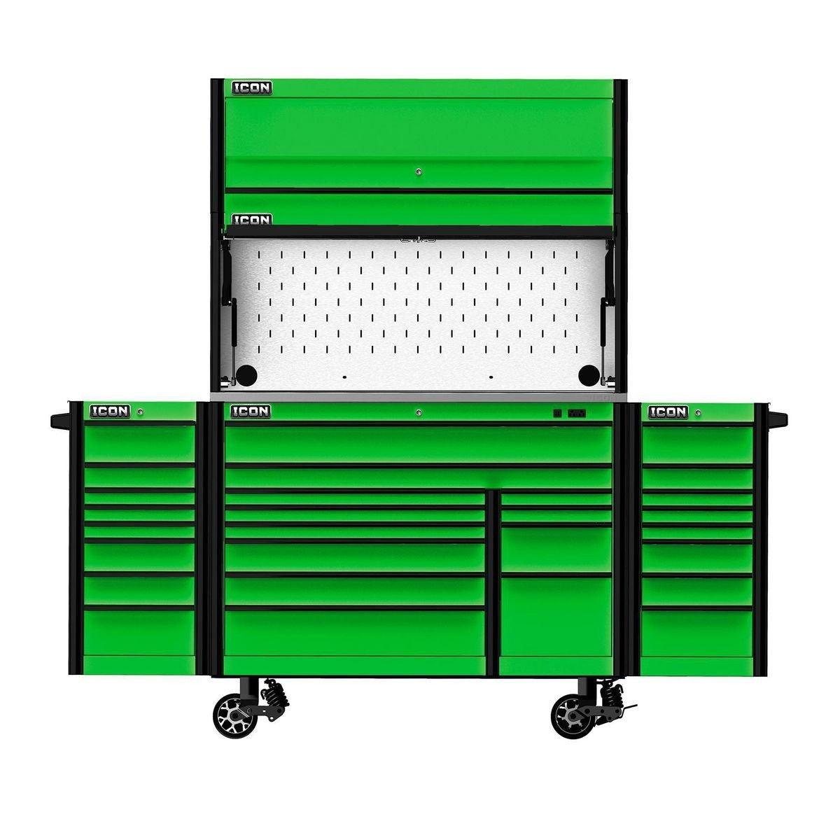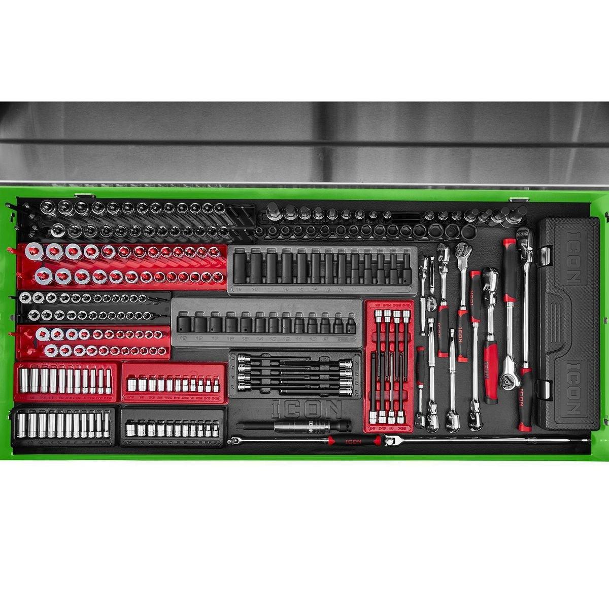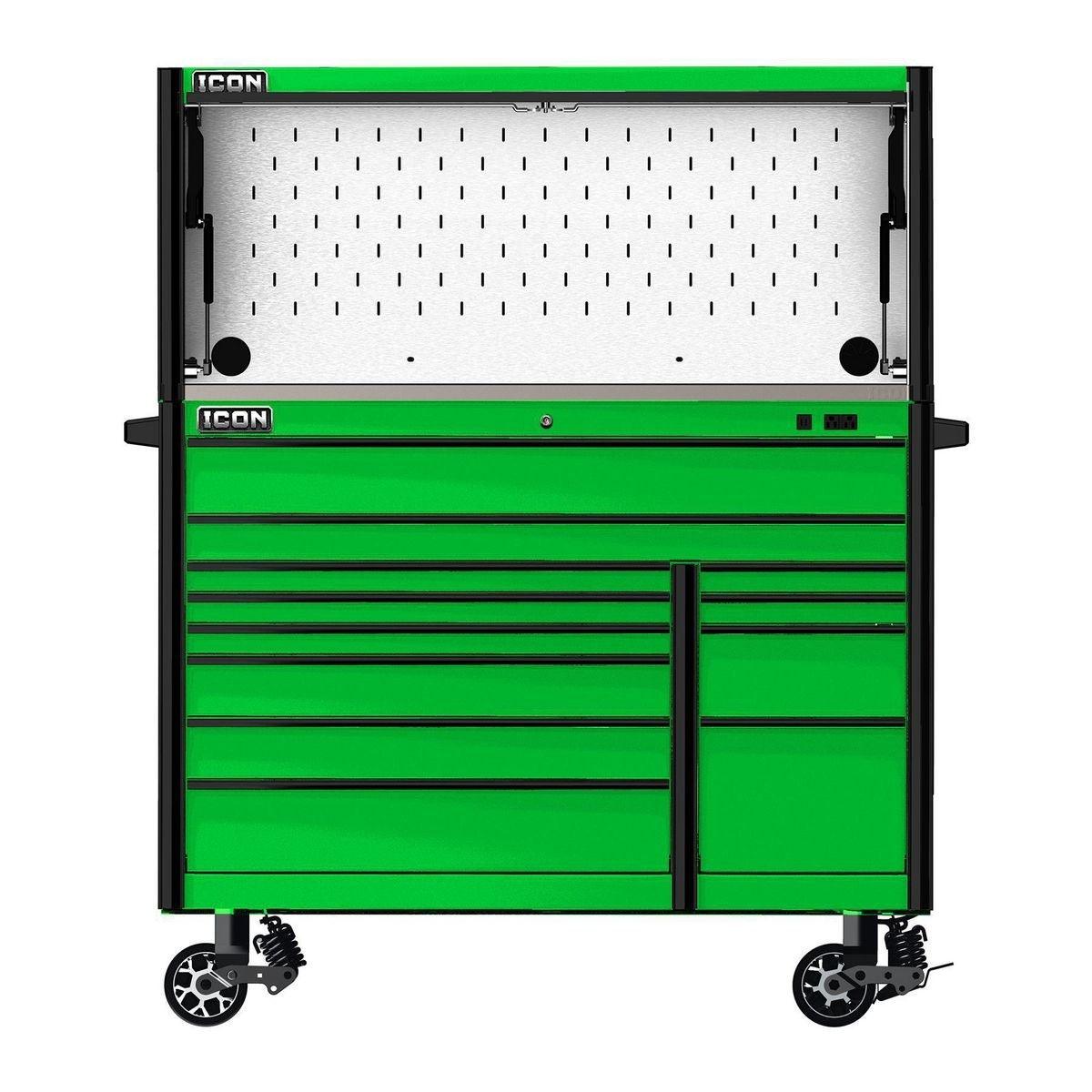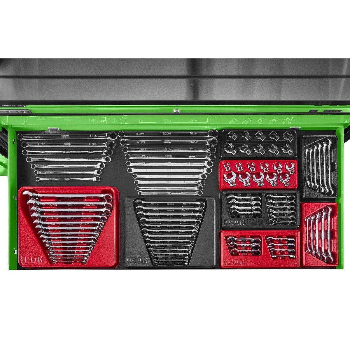 Built with the strongest steel and precision reinforced welds, Icon™ storage is tough enough for the daily grind of a busy shop…and you don’t have to break the bank to get the tool cabinet you deserve. Every Icon™ cabinet features a double-wall steel frame for ultimate strength. Industry-leading 16-gauge top and outside panels prevent dents and withstand the demands of daily use, and 18-gauge inside panels evenly support drawer and slide weight. Structural corner brackets prevent cabinet twist and racking. Under every Icon™ roller cabinet, three 14-gauge U channels distribute weight evenly to the industry-leading 2,000-pound-rated suspension casters with easy locks, so these boxes glide into place easily and stay in place securely. With a staggering 8,000-pound capacity, Icon™ roller cabinets are more than double the overall weight capacity of comparably sized Snap-On cabinets. These boxes are beautiful. Their premium ultra-tough powder-coat finish will withstand harsh chemicals and provide a showroom finish that looks like new, even after years of punishing use. Every drawer features the highest-quality ball bearing full extension drawer slides that support up to 265 pounds per set - or 530 pounds for drawers with double slides - even more than Snap-On’s Masters Series. An adjustable-force drawer latch system lets you dial-in just the right amount of force to keep drawers from opening when they should be closed. And heavy-duty non-slip drawer liners will keep your tools in place...right where you put them. Icon™ storage features an integrated power system. The power charging drawer has two fast-charging USBs and six 110v outlets with extendable chain-style power management. The deep power tool drawer includes six adjustable height holsters for easy access to air and power tools. Interior and exterior electrical outlets and USB ports give you easy access to power when and where you need it. We even designed a detachable power supply so you can move the cabinet without dragging the cord. And a Y-cord comes with the base cabinet so when you add a work center, you only have to plug in the cabinet once. An advanced locking system turns your tool cabinet into a vault to keep your valuable tools safe and secure. The interchangeable core lock comes with security milled keys that allow you to key-alike all your Icon™ storage units as you expand. Icon™’s modular design offers endless configurations for maximum flexibility so the system can grow with your needs. Customize your storage with expansion options like work centers, end lockers, end cabinets, overhead storage and top chests. The base cabinets are offered in three sizes - 36, 56 and 73 inches. And all Icon™ storage comes in four colors: Red, Blue, Black and Green. All Icon™ storage comes with free door-to-door delivery and a lifetime warranty—plus, a full line of replacement parts is available. It’s the only storage solution you’ll ever need.