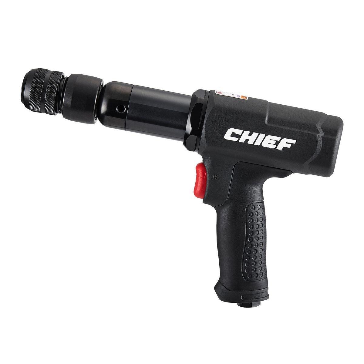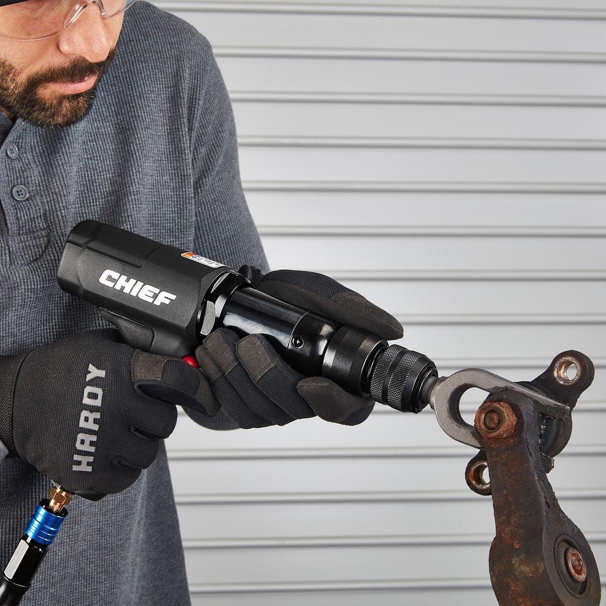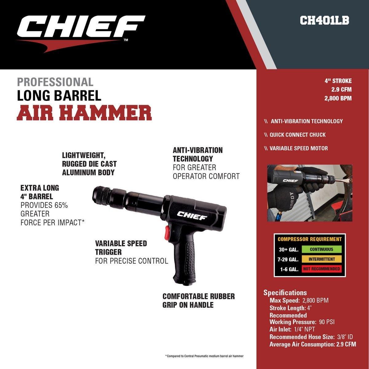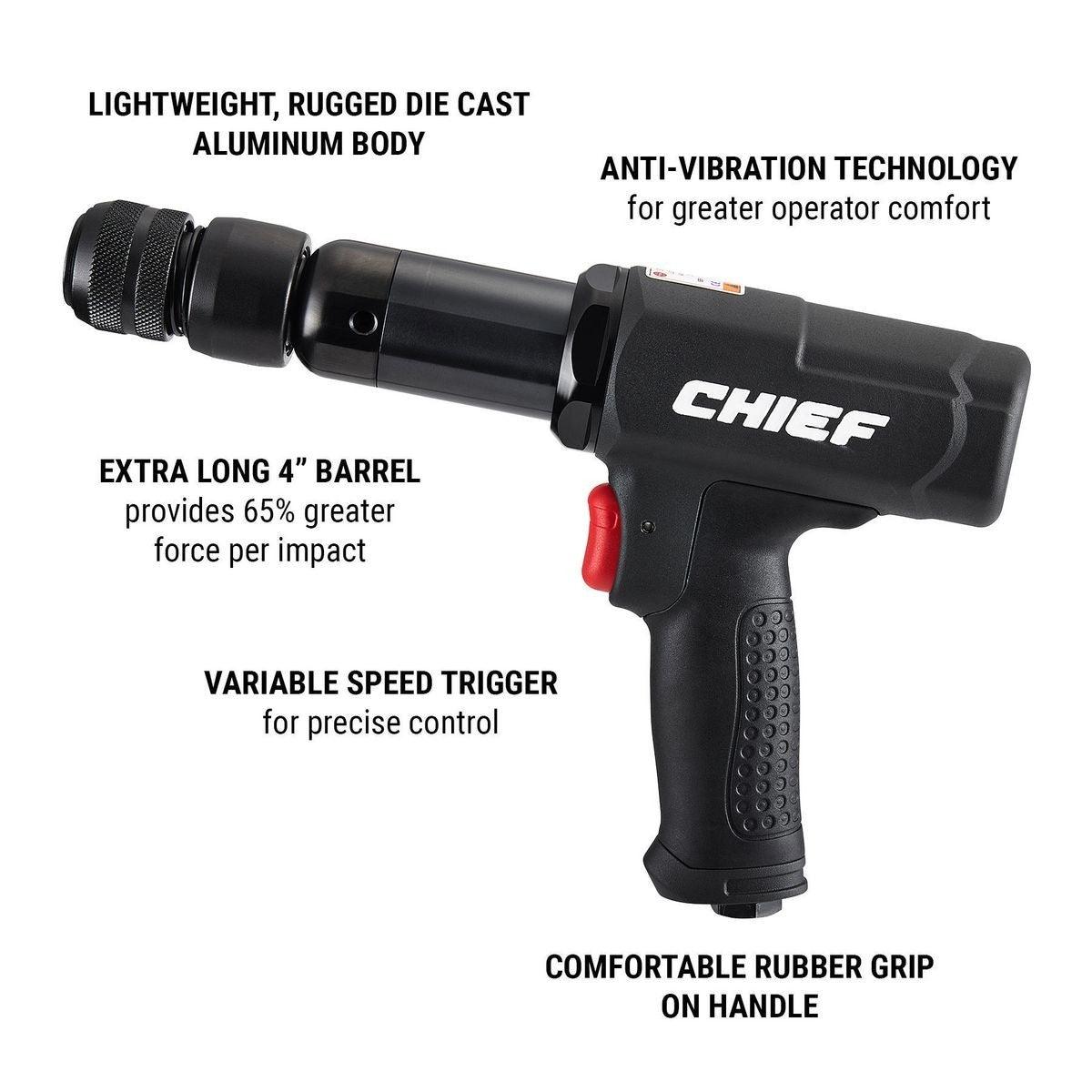 This professional air impact hammer quickly cuts sheet metal, shears straps, and removes fastener heads along with other fabrication jobs. Anti-vibration technology provides operator comfort. The quick-connect chuck makes bit changes fast and easy.