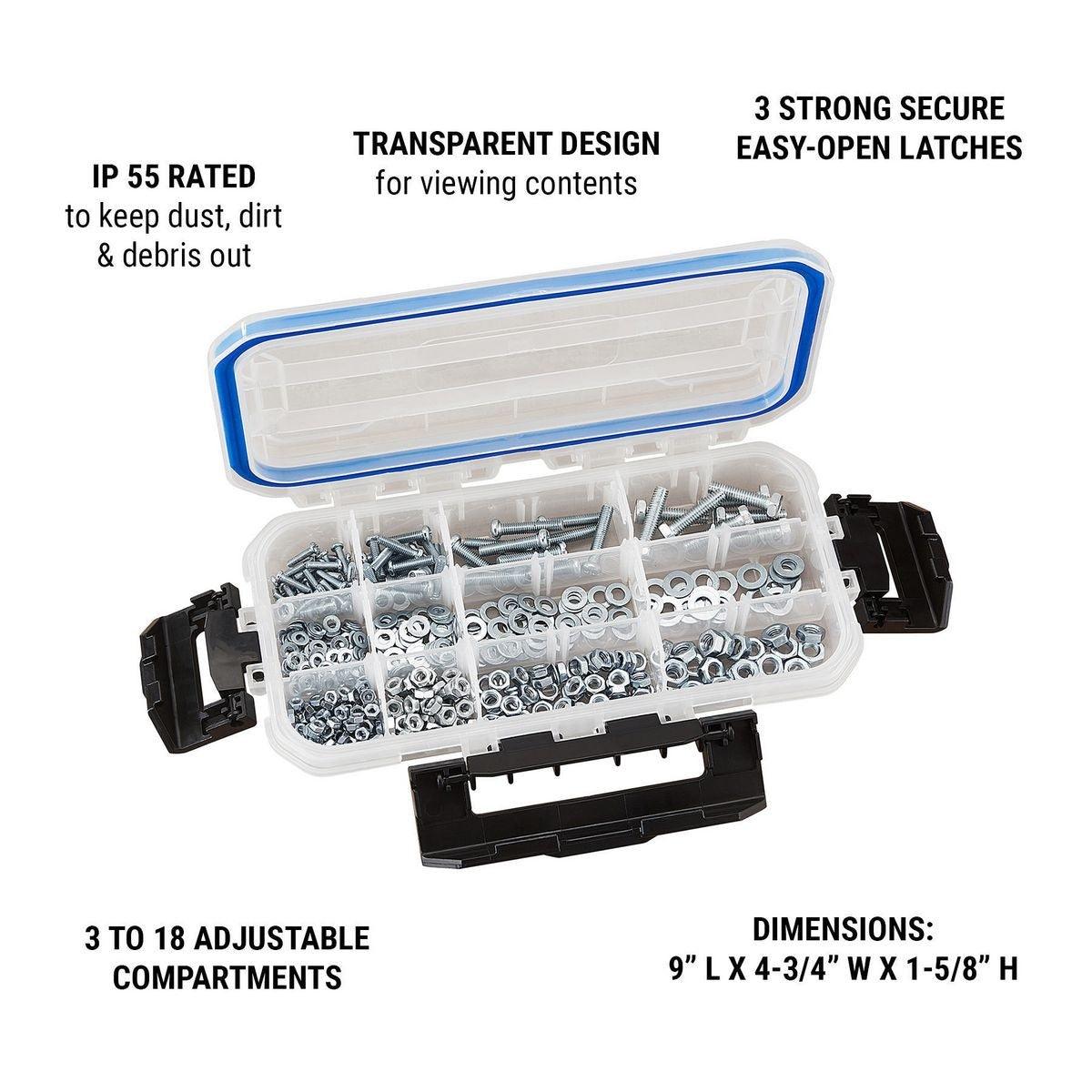 This clear small organizer has up to 18 individual compartments for storing small parts or supplies. Three strong easy-open latches keep the lid sealed tight to keep out dirt, dust and debris. This small organizer is transparent so the contents can be easily viewed. Ideal for fasteners, fishing tackle, craft supplies, and more!