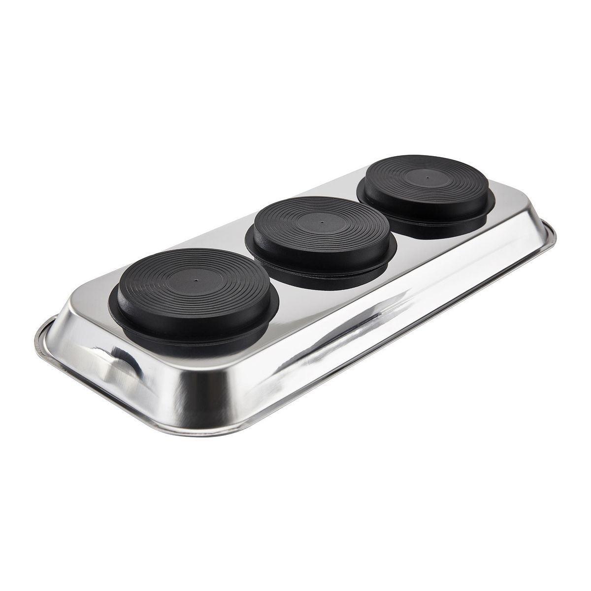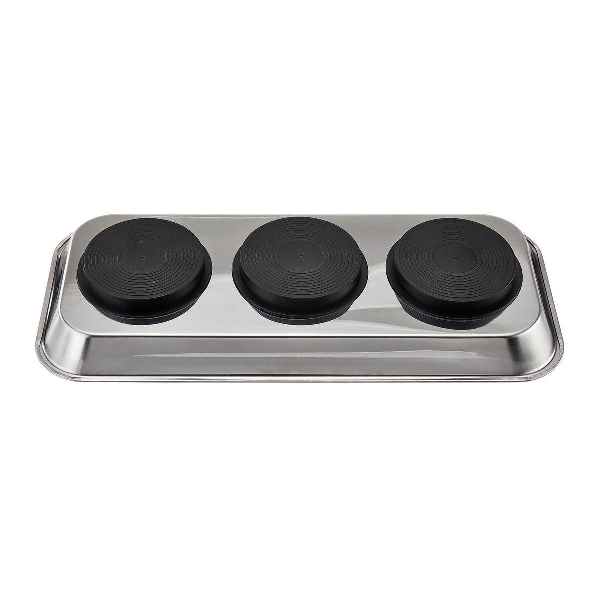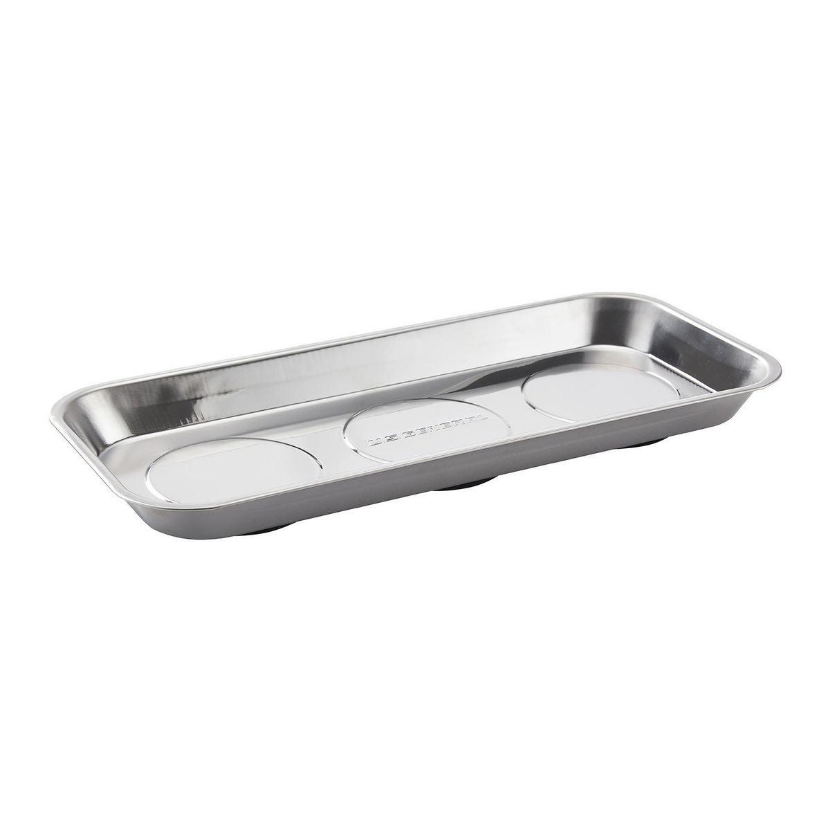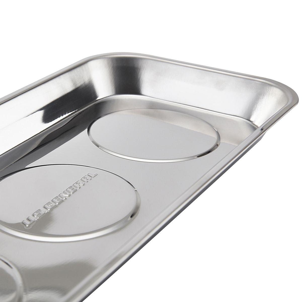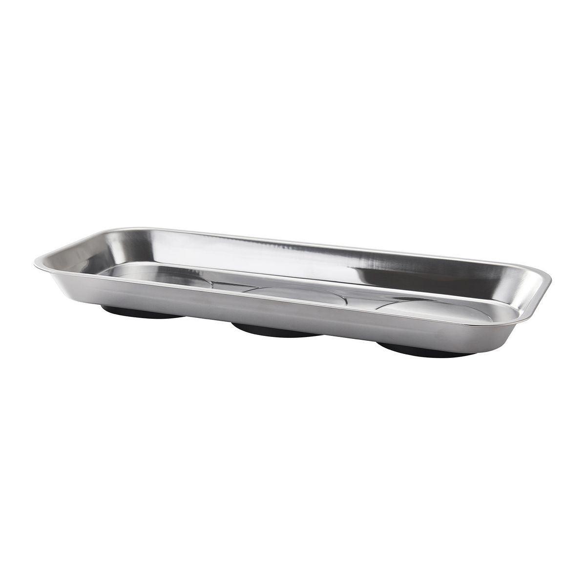 Keep loose metal parts and small tools close at hand with this durable Magnetic Stainless Steel Parts Tray. Three rubber-coated magnets clamp tight to any iron or steel flat surface. The magnets also keep tools and small metal parts in place. Durable stainless steel construction, wipes clean easily.