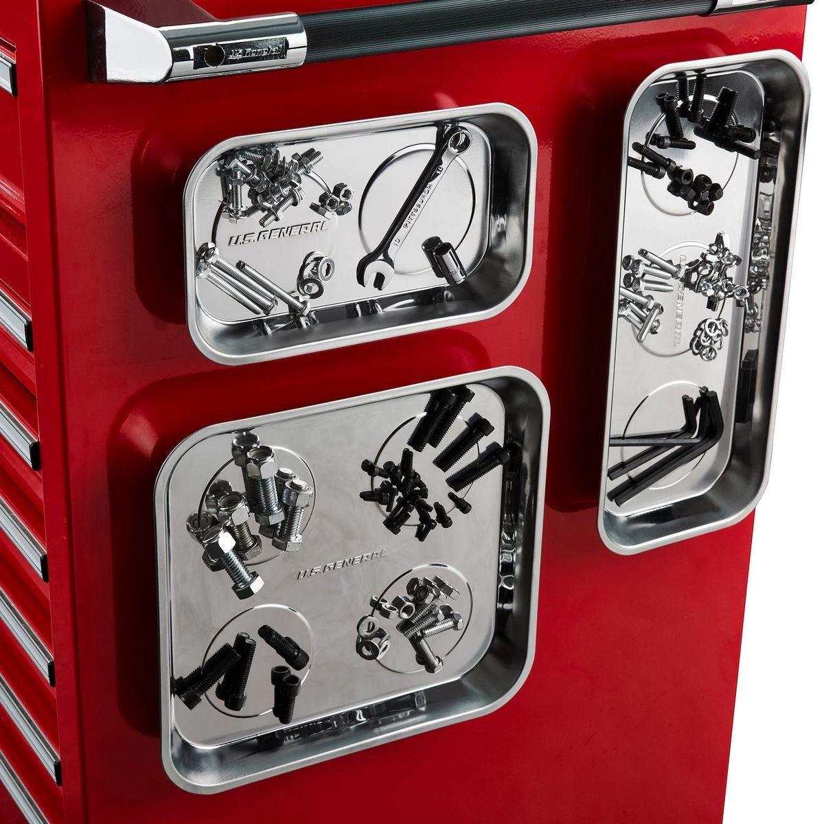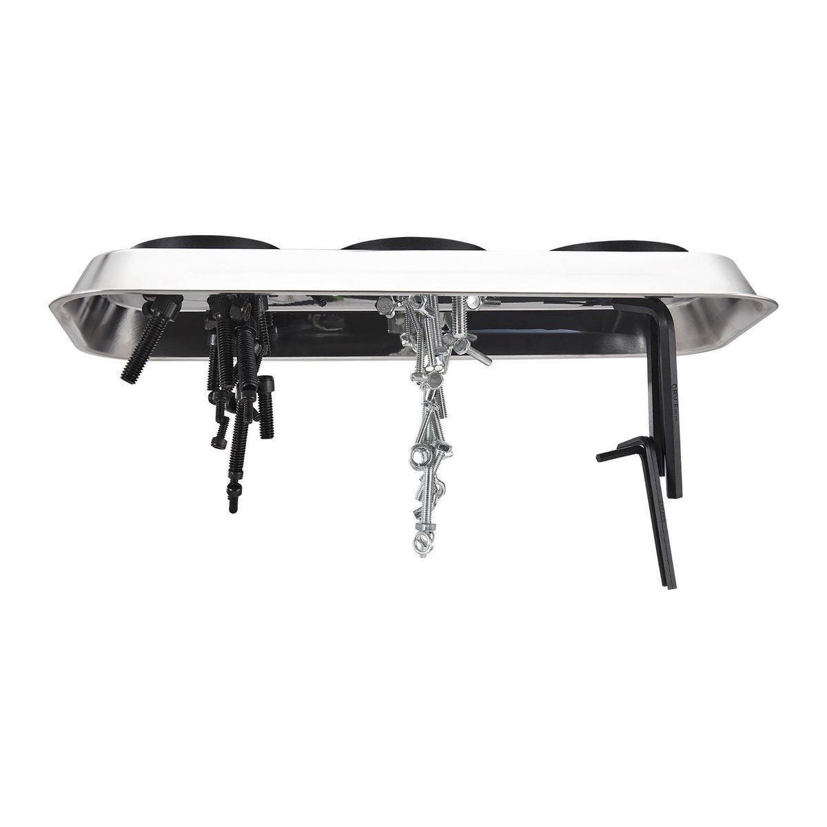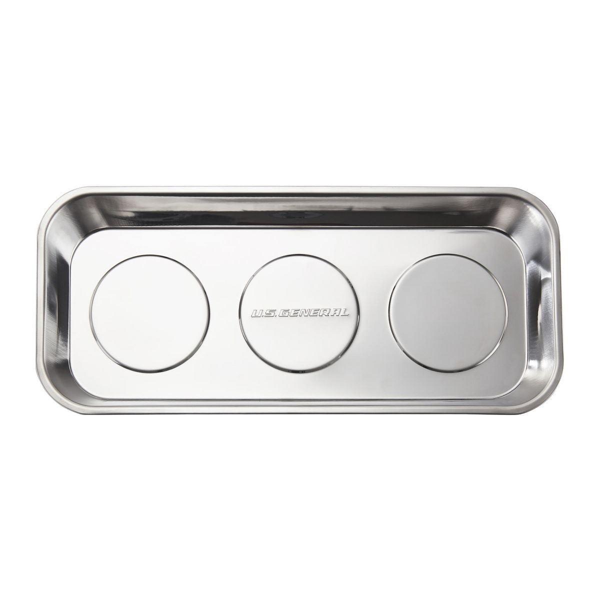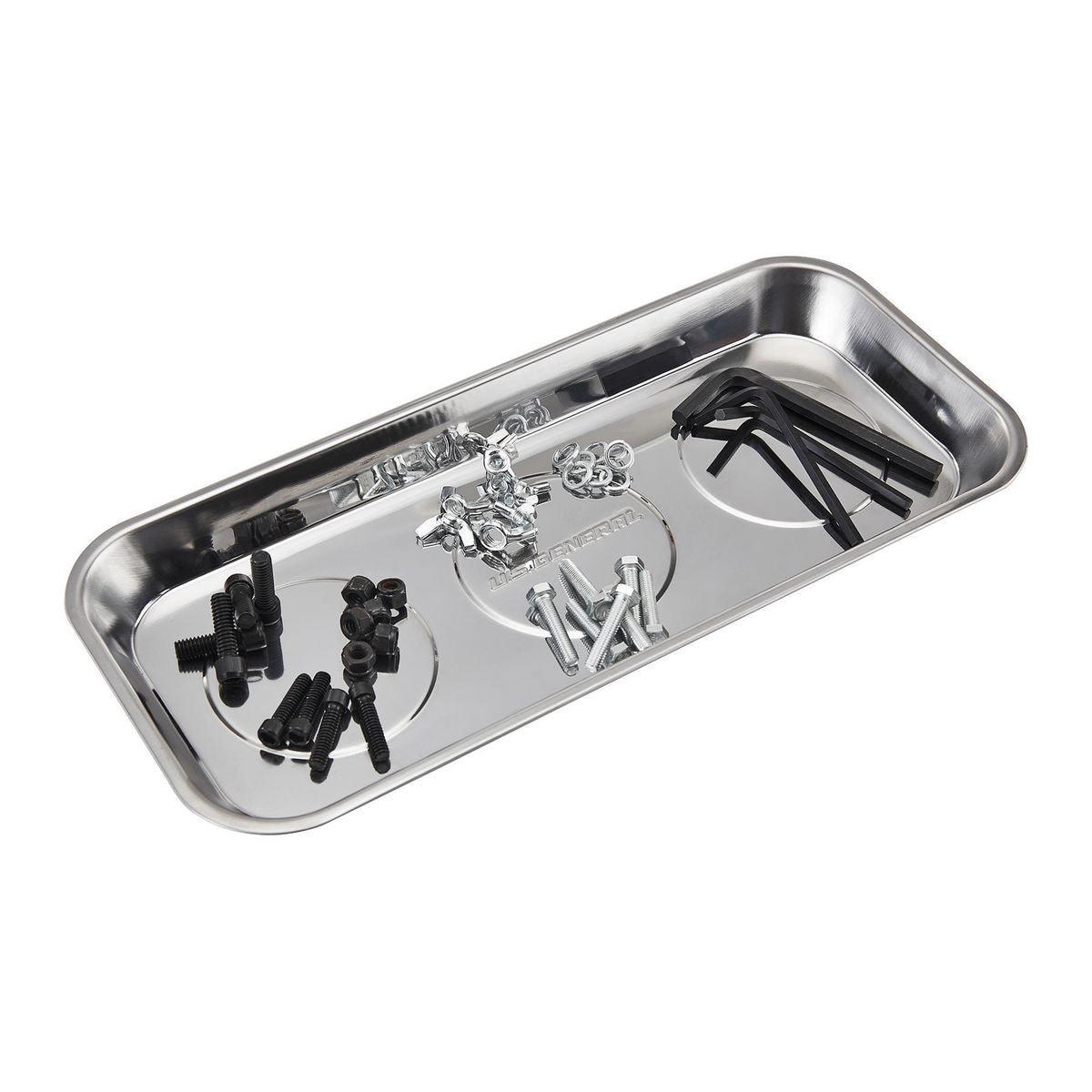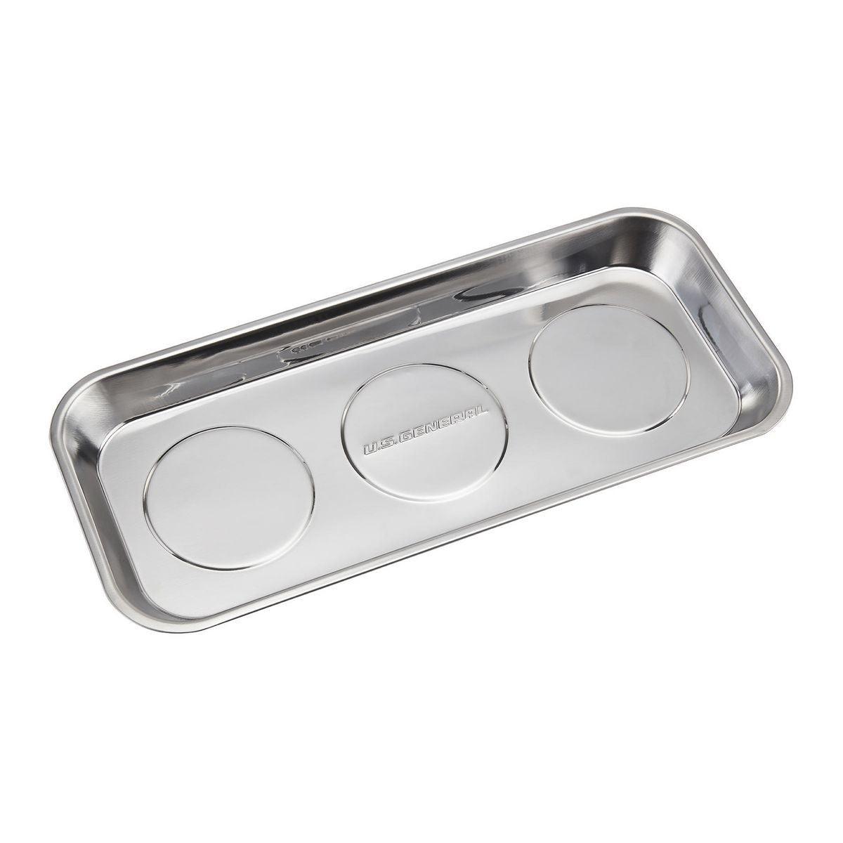 Keep loose metal parts and small tools close at hand with this durable Magnetic Stainless Steel Parts Tray. Three rubber-coated magnets clamp tight to any iron or steel flat surface. The magnets also keep tools and small metal parts in place. Durable stainless steel construction, wipes clean easily.