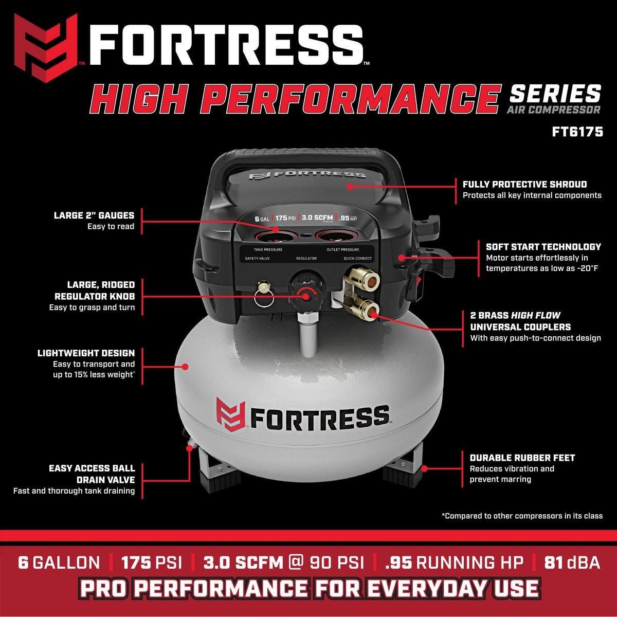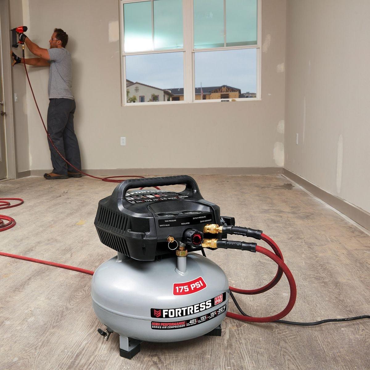 This Fortress™ Air Compressor delivers up to 40% more runtime and is 15% lighter than other compressors in its class. Don't let the small size fool you - this professional quality air compressor delivers up to 15% more SCFM. Featuring an integrated control panel with easy-to-read gauges and two built-in quick connect couplers for running multiple tools.