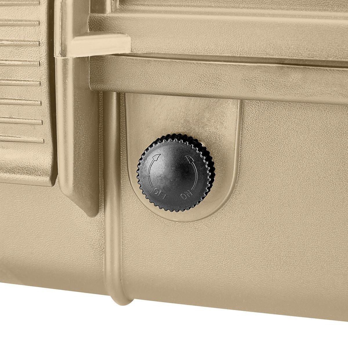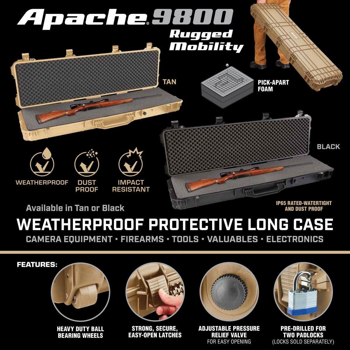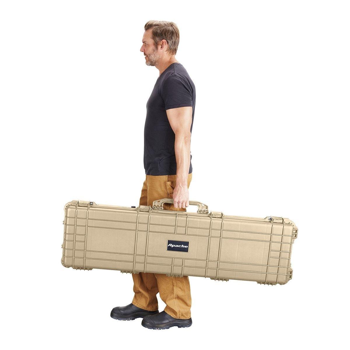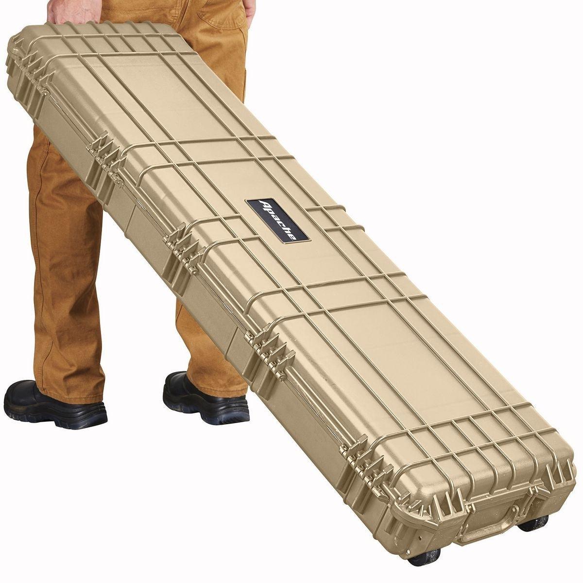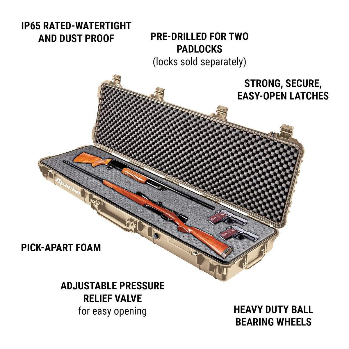 Protect rifles, shotguns, handguns and other specialized equipment with this exceptionally rugged Apache® weatherproof storage case. Constructed from extremely durable polypropylene, this professional quality hard case takes a beating while protecting the contents from impact, moisture and microscopic dust. The built-in purge valve equalizes pressure so you can open the case after changing elevations.