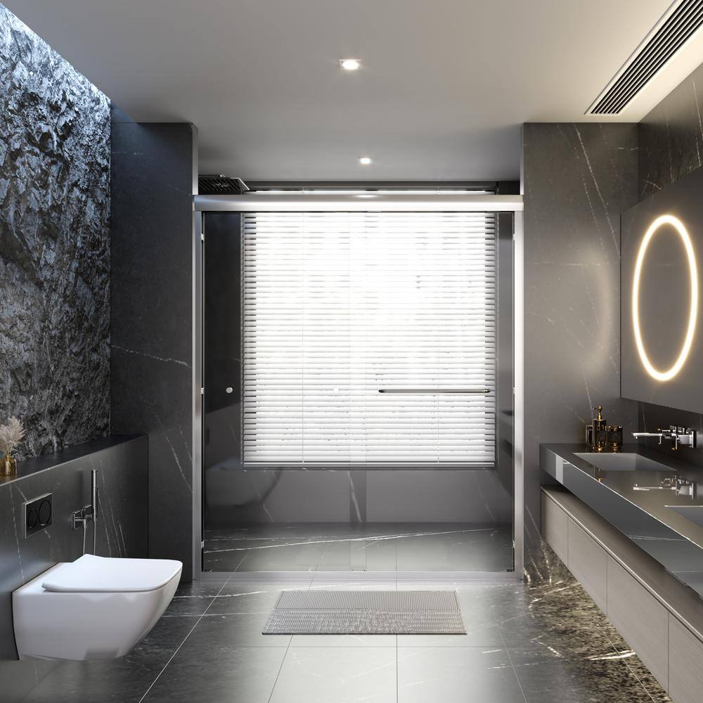 Transform your morning routine with the luxurious appeal of a semi-frameless sliding shower door. This model's tempered glass and chrome finish create an air of understated elegance, perfect for both modern and transitional bathrooms. Highlight its reflective qualities by pairing with glossy tile or chic matte black fixtures. It's not just a functional feature, it's an invitation to indulge in everyday luxury, making your bathroom not just a utility, but an escape.