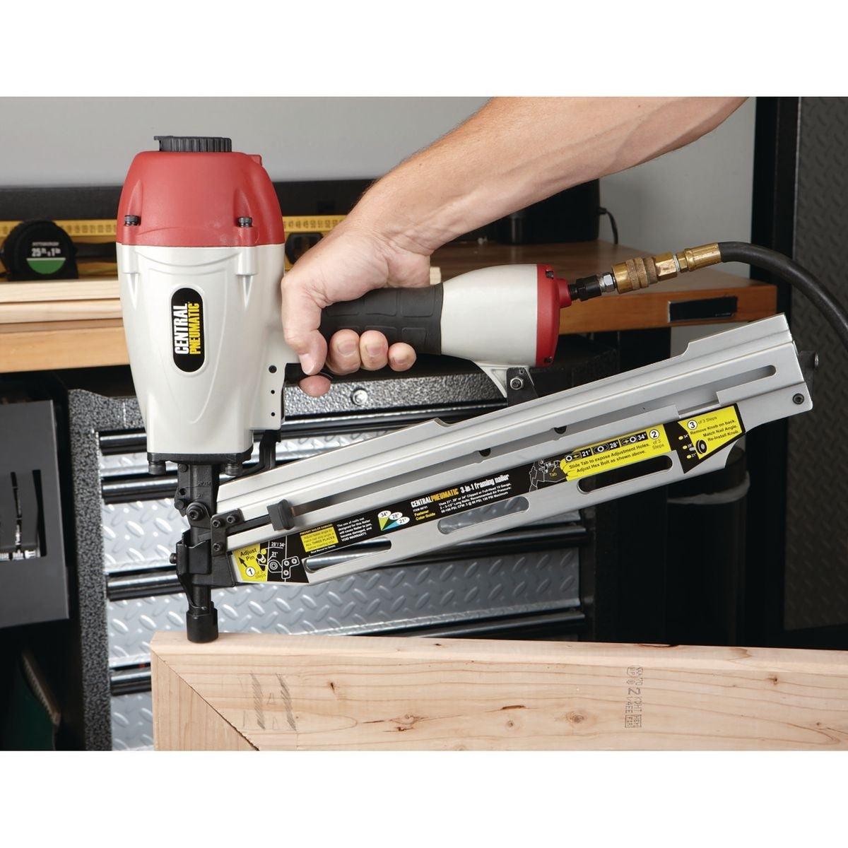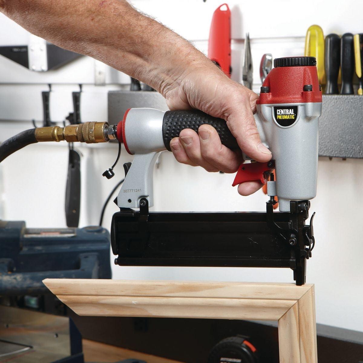 This vertical air compressor can be connected to a variety of air hoses with a built-in universal quick-connect coupler. With 2.5 horsepower, this solid air compressor will power your tools or inflate tires with energy to spare. Roll this portable air compressor on two 6 in. wheels, while two rubber foot stabilizers reduce vibration during use.