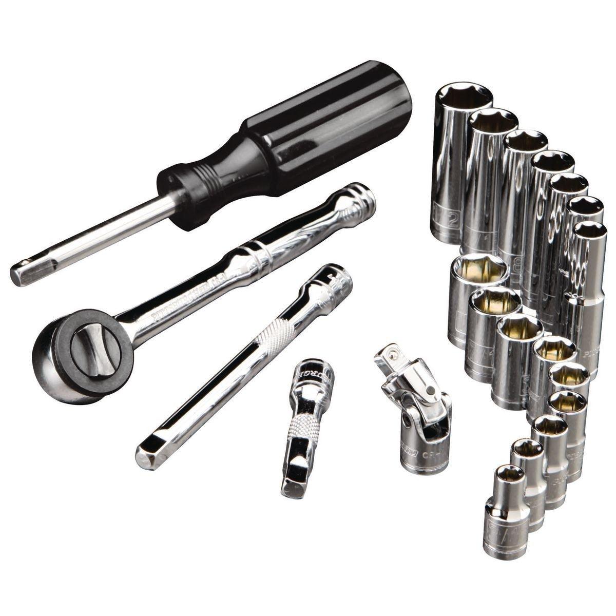 This socket set comes with a ratchet, breaker bar and the most popular sized sockets. Chrome vanadium construction for durability and longevity.