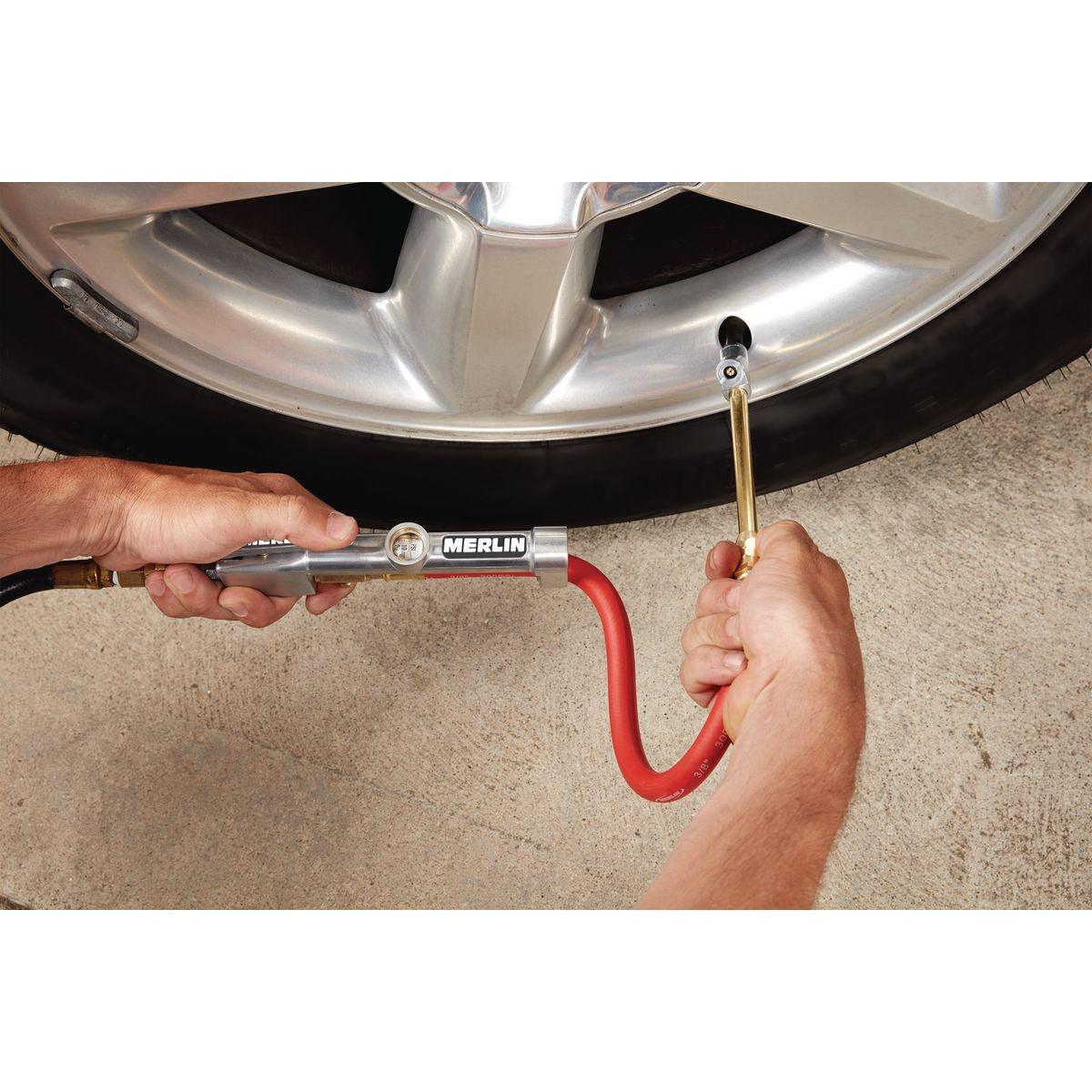 This durable tire inflator has a dual head chuck to easily reach inner dual wheels. The 15 in. flexible rubber hose offers plenty of reach. The 160 PSI inline gauge is easy to read and is extra rugged for professional shop use.