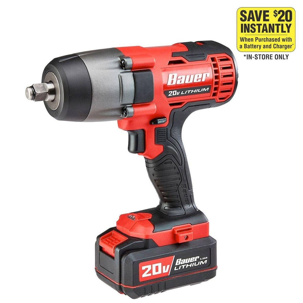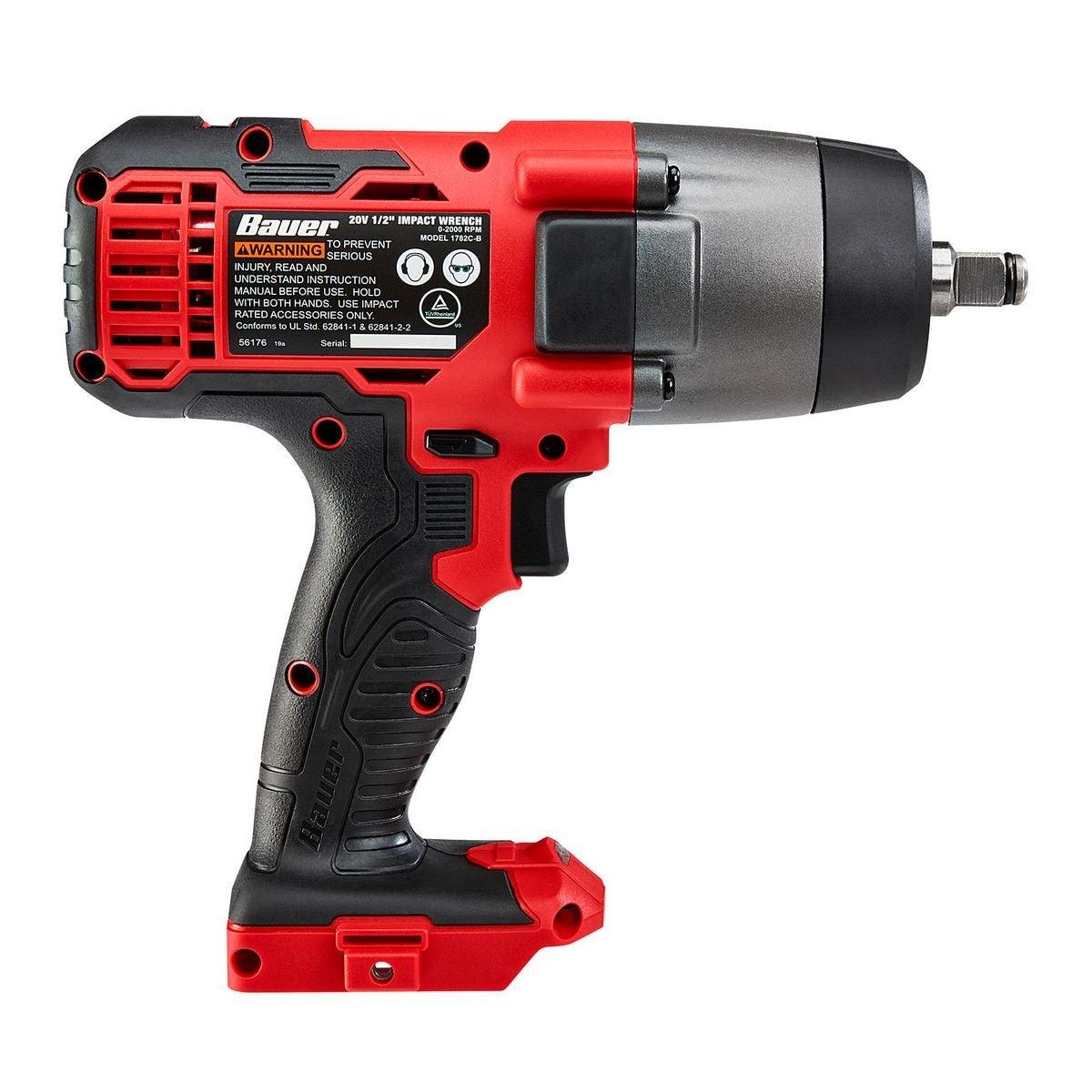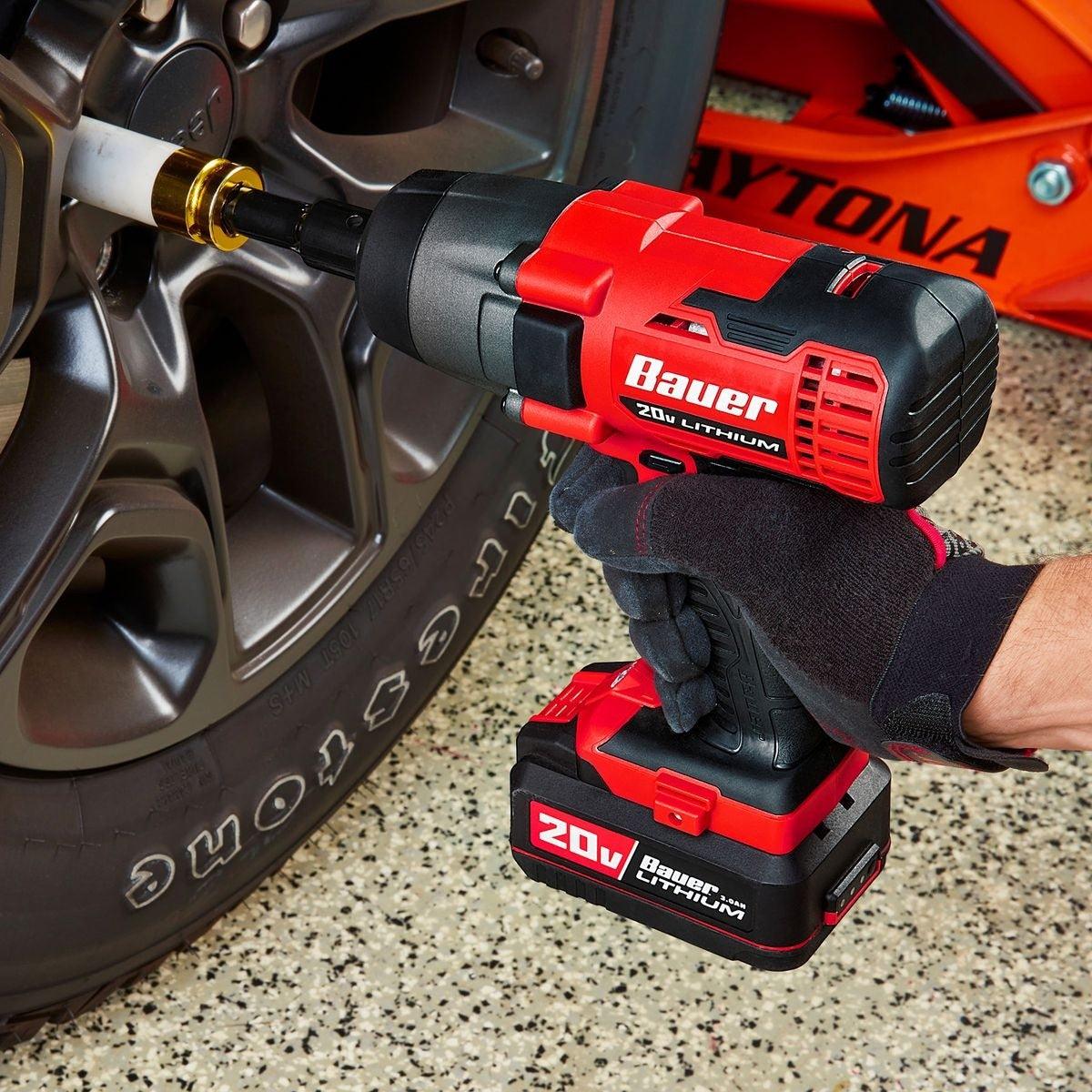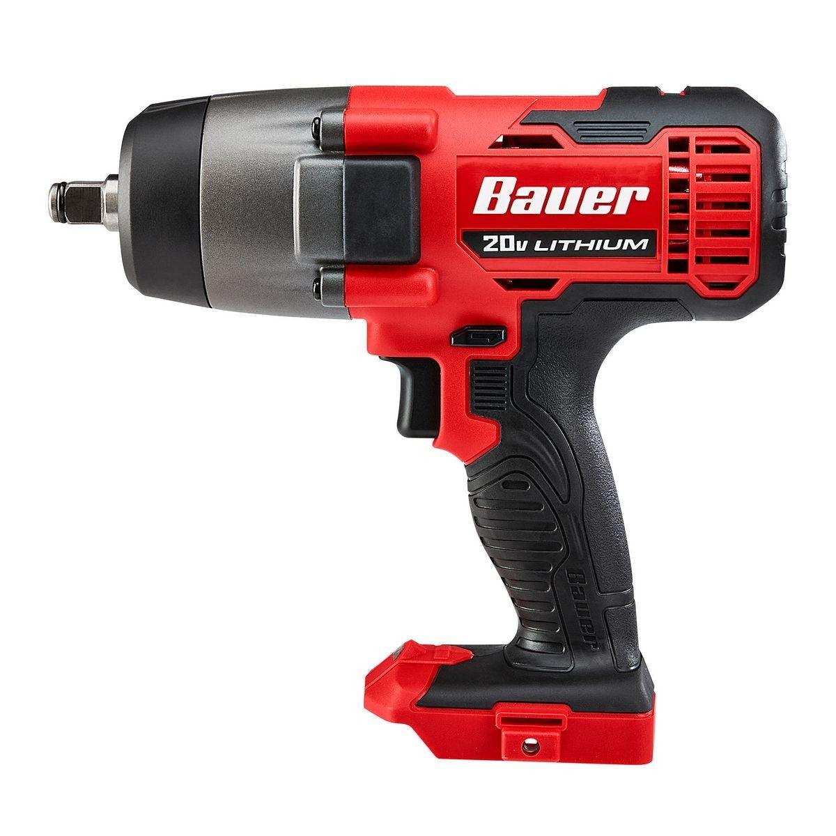 The Bauer™ 20v Hypermax™ Lithium-Ion Cordless 1/2 in. Impact Wrench is designed to deliver superior performance and durability. Powered by a high performance motor to produce 450 ft. lbs. of breakaway torque for removing lug nuts and head bolts with ease. Combined with the Hypermax™ Lithium battery system for fast charging and longer run times. Buy with confidence with an included no-questions-asked risk-free trial, extendable for up to 2 years.