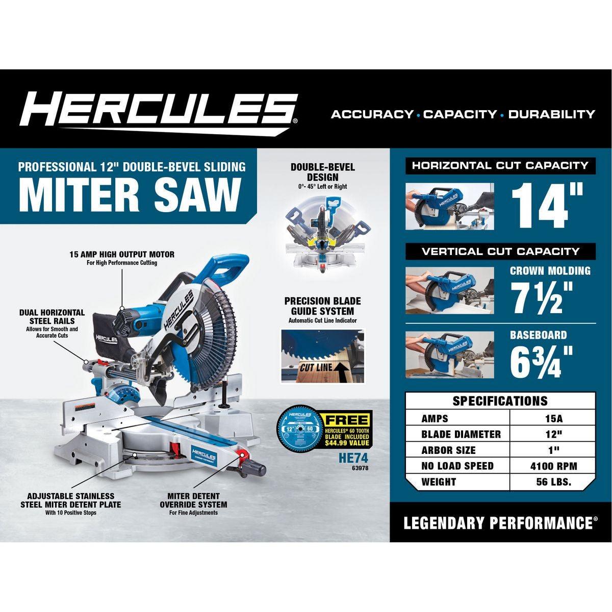 The Hercules® Professional 12 in. Dual Bevel Sliding Miter Saw was engineered to deliver Legendary Performance in your shop or on the jobsite. Designed with the same cutting capacity, precision, accuracy and durability as the best-selling professional miter saws on the market. The Hercules® Miter Saw is packed with features for the professional at an unbeatable price. Buy with confidence with an included no-questions-asked risk-free trial, with additional coverage up to 2 years.