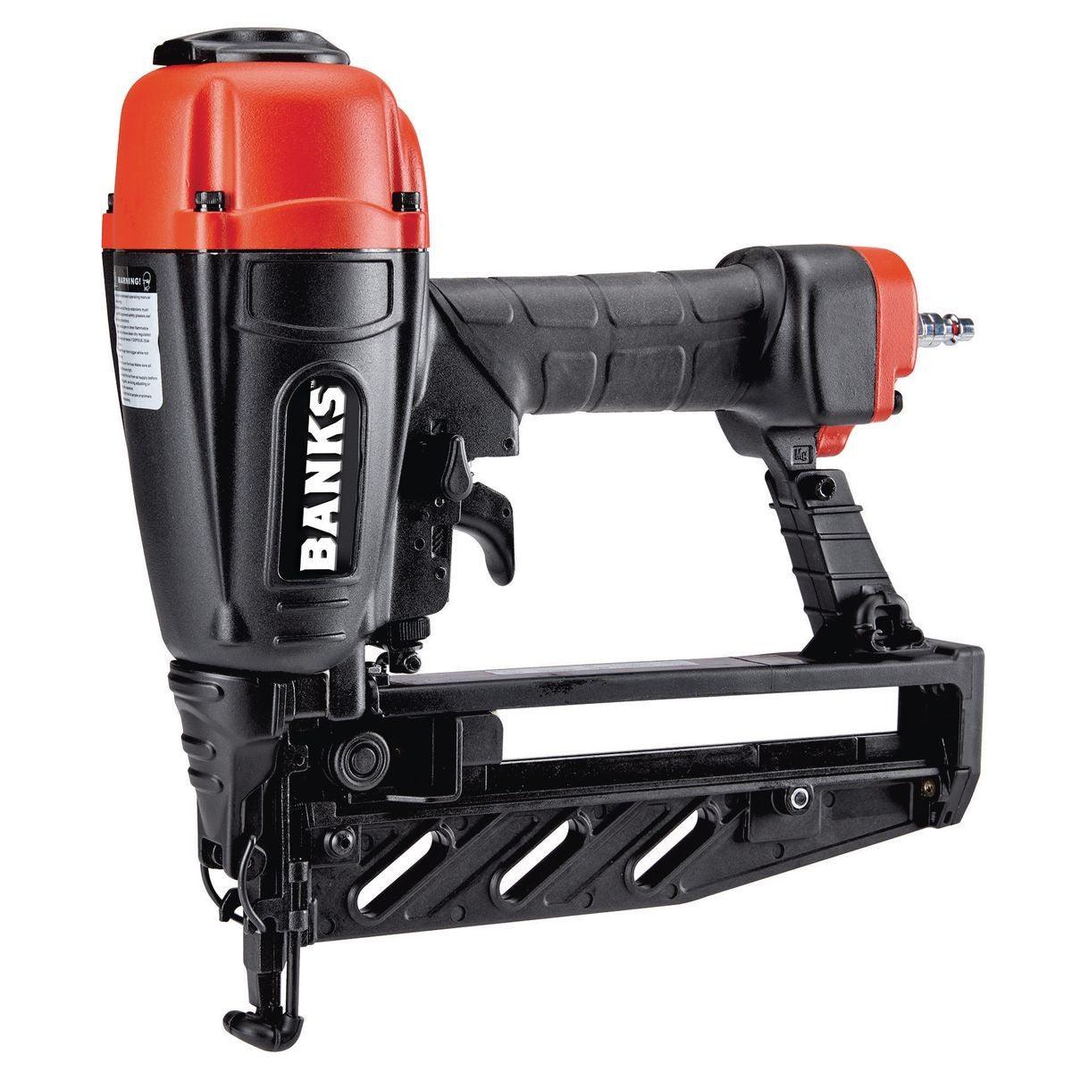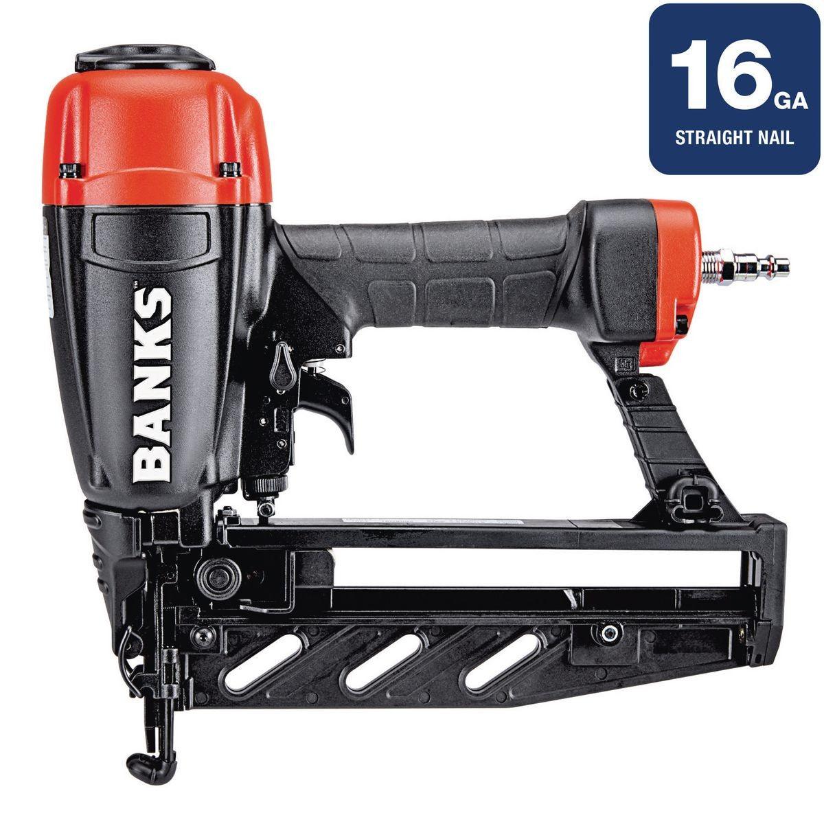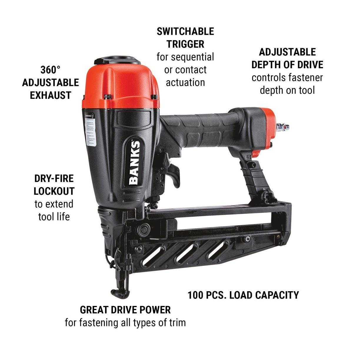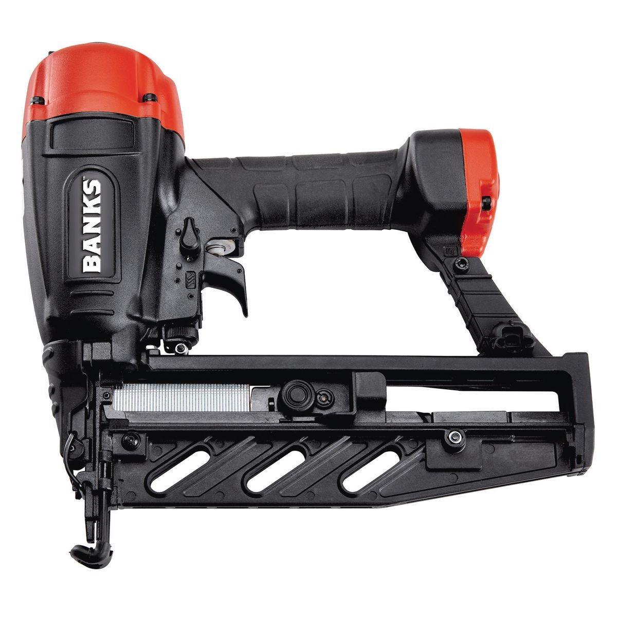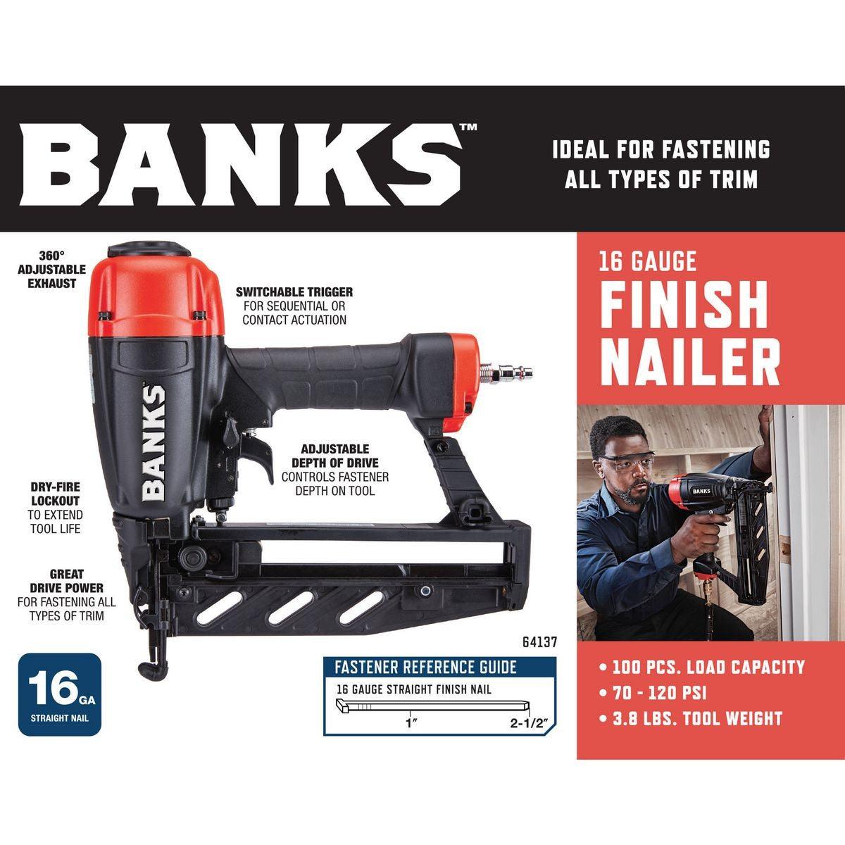 The Banks™ 16 GA Finish Nailer gets the job done - driving 2-1/2 in. nails through solid oak. Tool-free depth adjustment makes it easy to work with various dimensions of trim and molding. The easy-to-clear nosepiece has a high-strength latch spring for durability. A switchable trigger gives you the option of single sequential or contact actuation so that you can change trigger operation without hassle. Handles fasteners from 1 in. to 2-1/2 in. long.