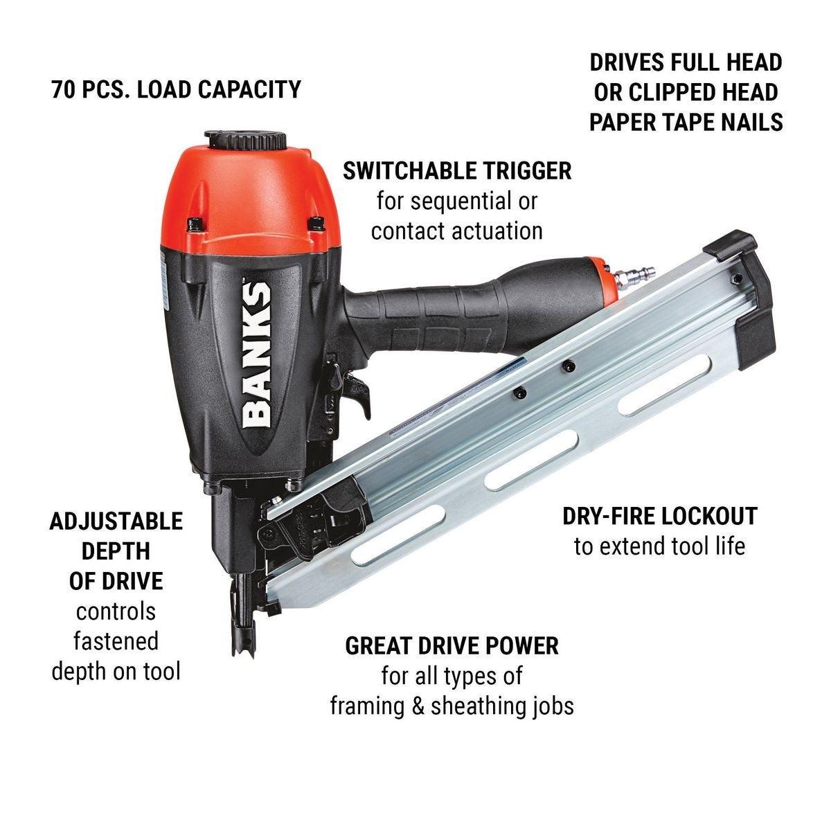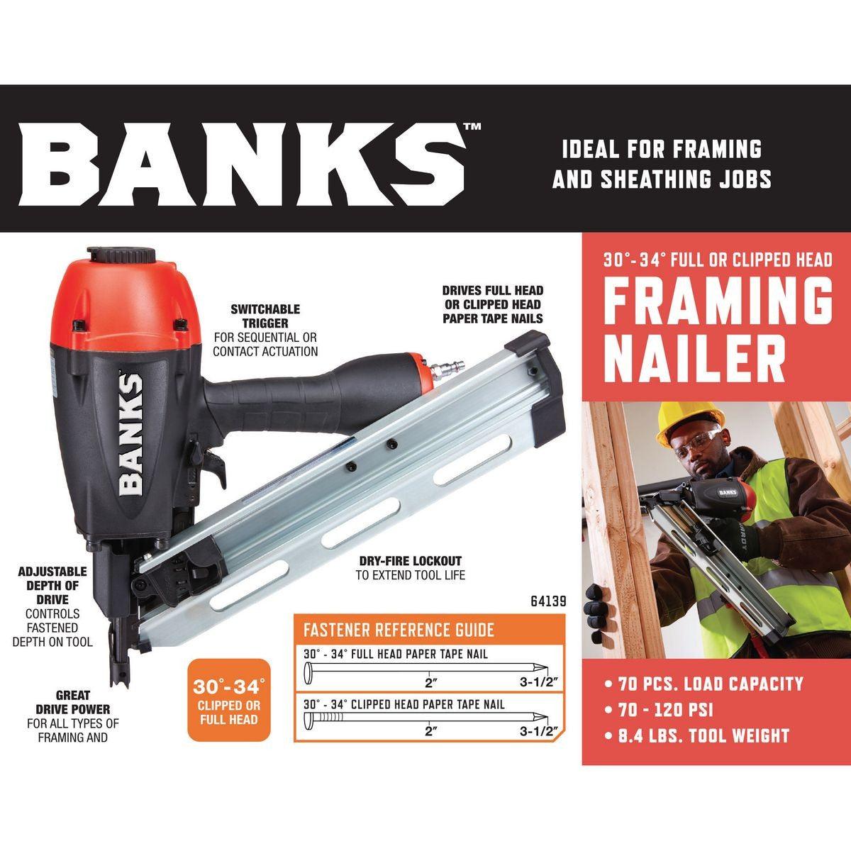 The Banks 30°-34° Framing Nailer is designed to handle all types of framing and sheathing. This rugged nailer shoots full head or clipped head paper tape nails from 2 in. to 3-1/2 in. long. The trigger mechanism can be switched easily from sequential to contact actuation and a dry-fire lockout prevents damage to the piston driver.