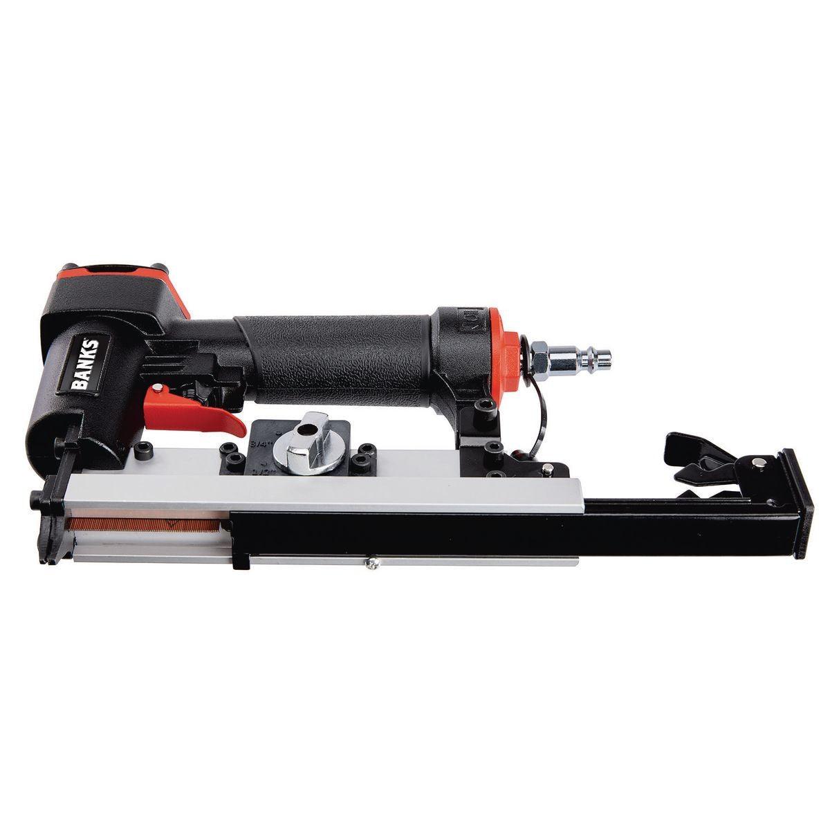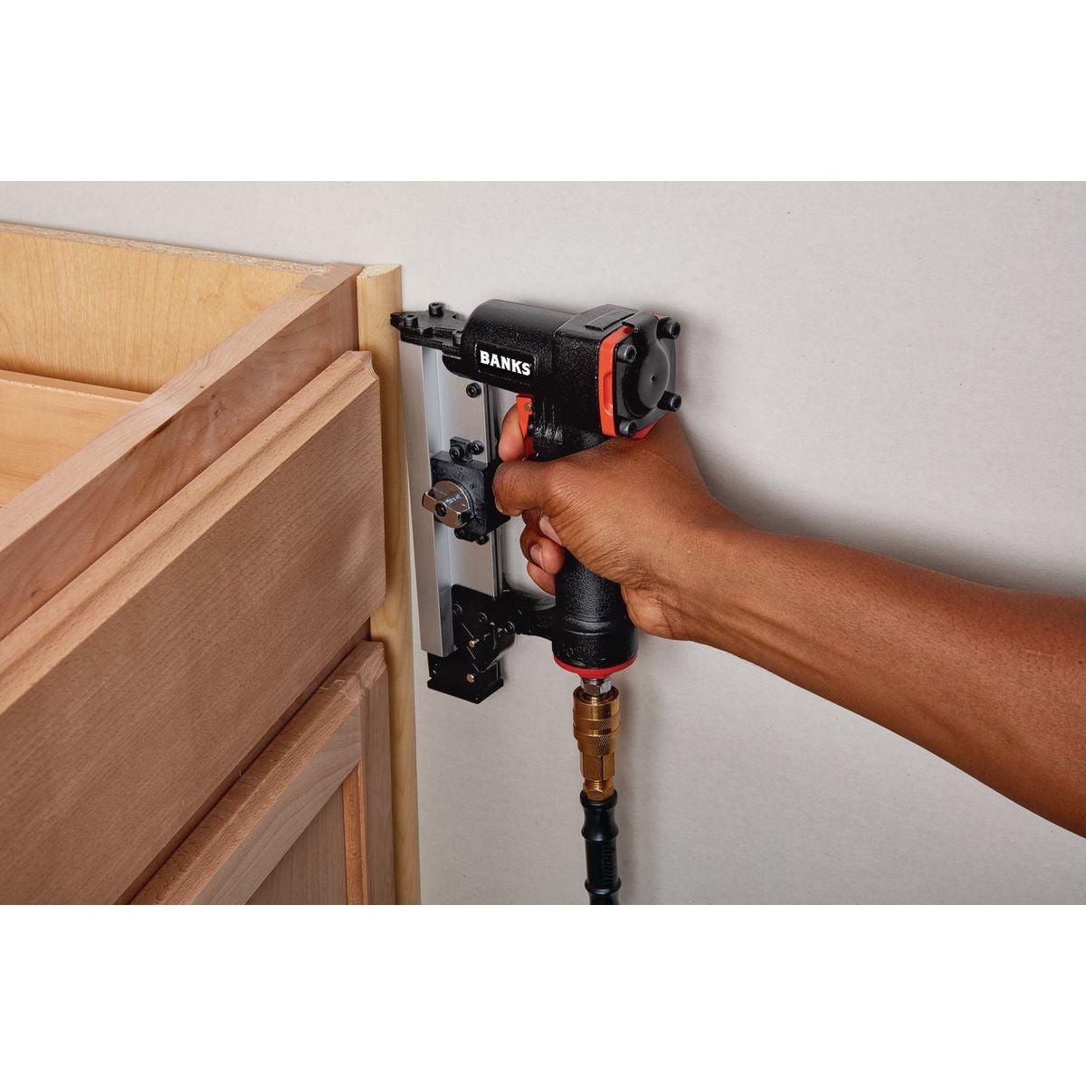 The Banks™ 23 GA Pin Nailer is ideal for fastening all types of trim and molding without splitting the wood. The lightweight, narrow body tool is easy to handle, making it ideal for cabinet trim. The brad nailer has 100 brad magazine with an easy adjustment dial for precise depth setting. Fires 23 gauge pins from 1/2 in. to 1 in..