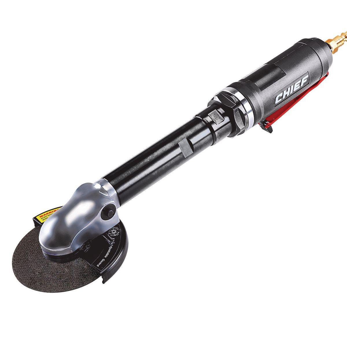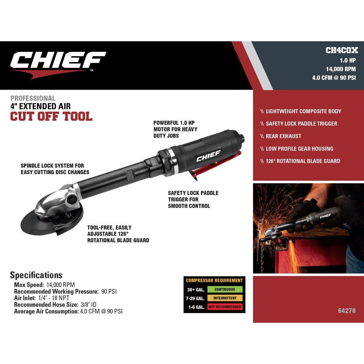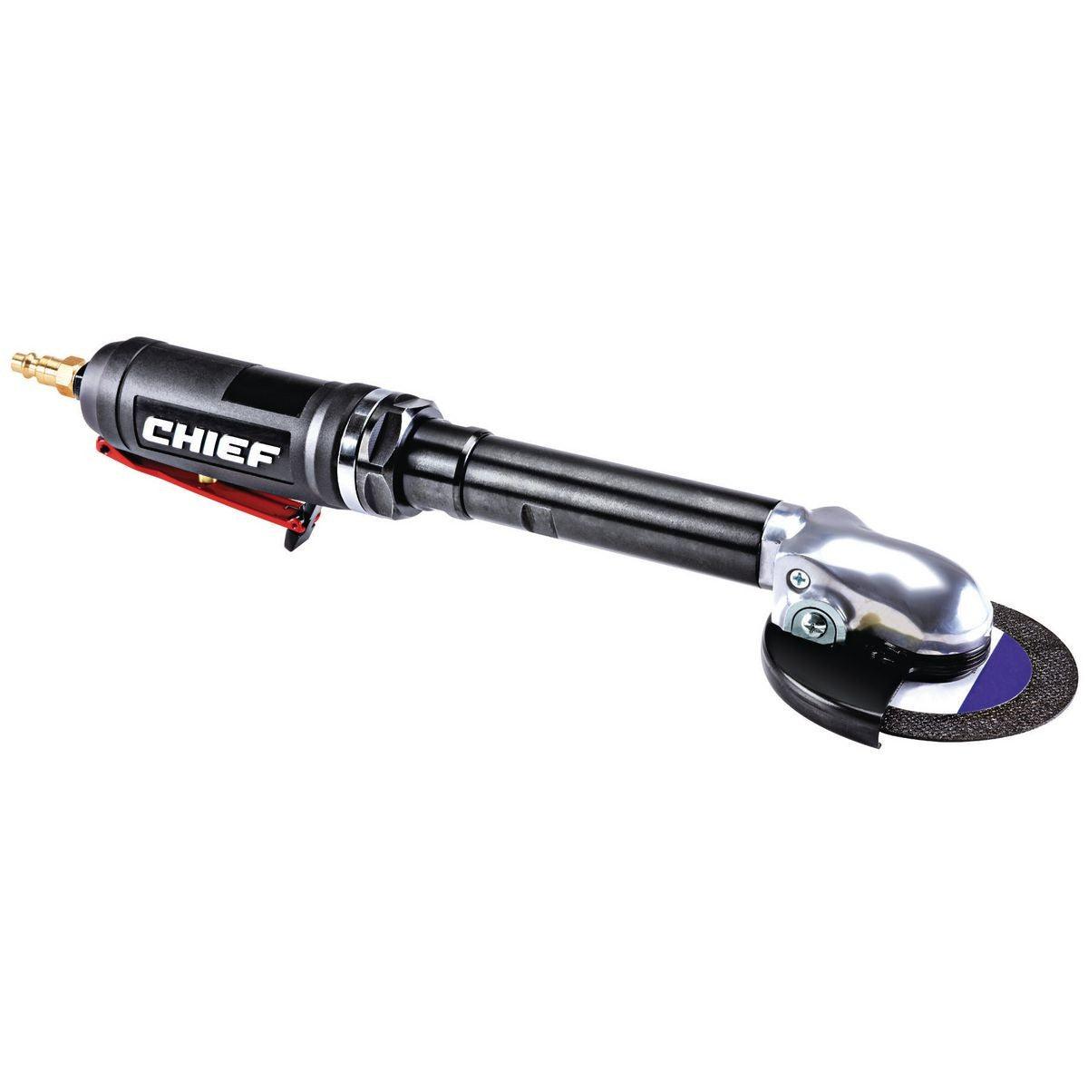The Chief™ 4 in. Professional High Speed Extended Reach Air Cut-Off Tool has an extra long shaft to reach muffler hangers, broken studs in engine bays and other obstructed components. With a lightweight composite body the cut-off tool is rugged and easy to handle for precise control. Features include rear exhaust and a steel wheel guard for added safety.