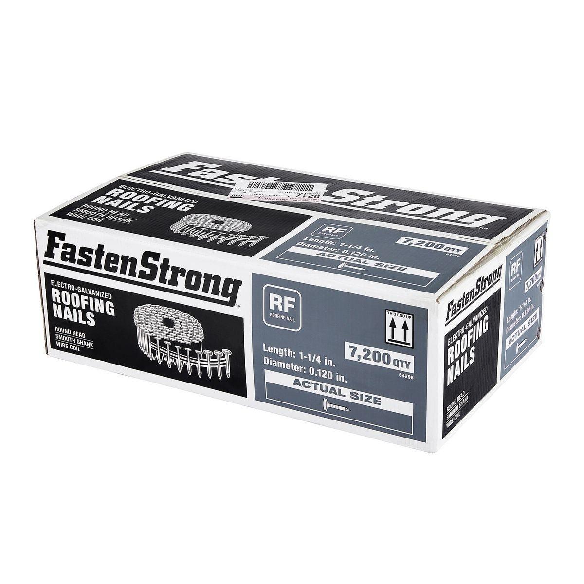 FastenStrong™ 1-1/4 in. coiled roofing nails have a full round head and are electro-galvanized to resist rust. Designed for use with most 15° coil roofing nailers.