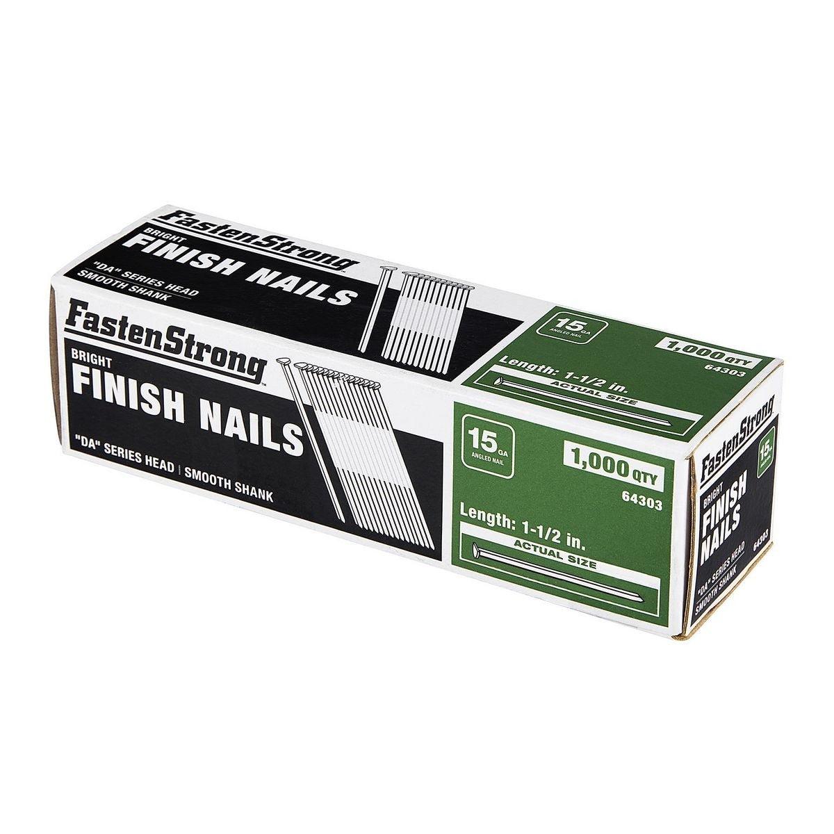 FastenStrong™ finish nails are angled for use in standard 15 GA nailers. The nails feature adhesive collation and a smooth shank.