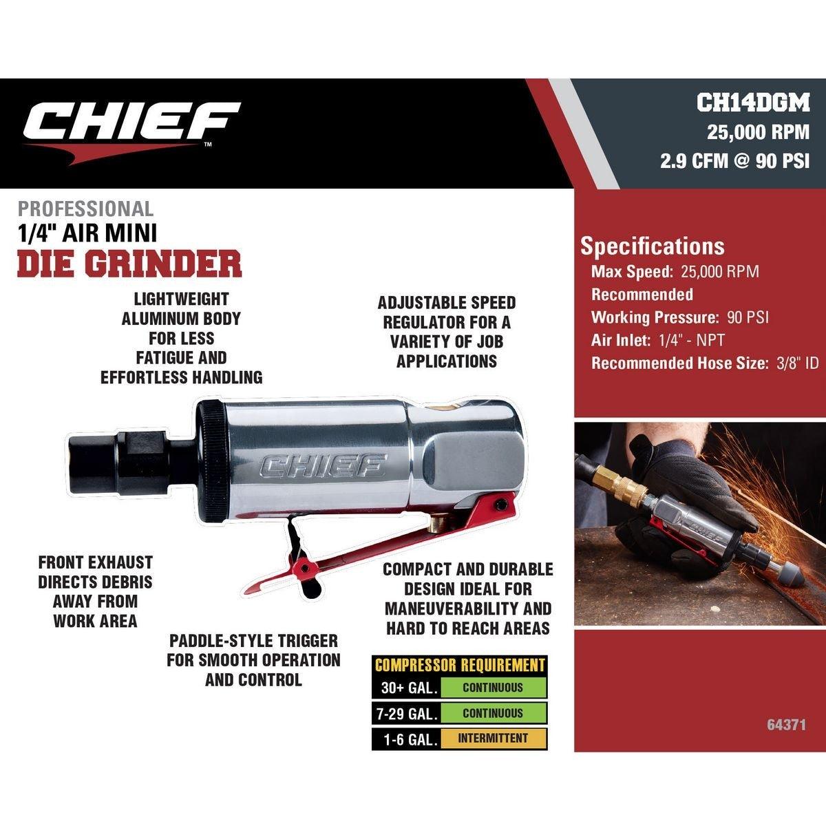 The Chief™ Professional Air Mini Die Grinder is compact and easy to maneuver in tight areas. The adjustable speed regulator makes it easy to work with a wide variety of materials. The paddle-style trigger is designed for easy, precise control.