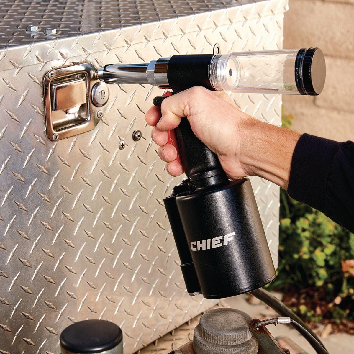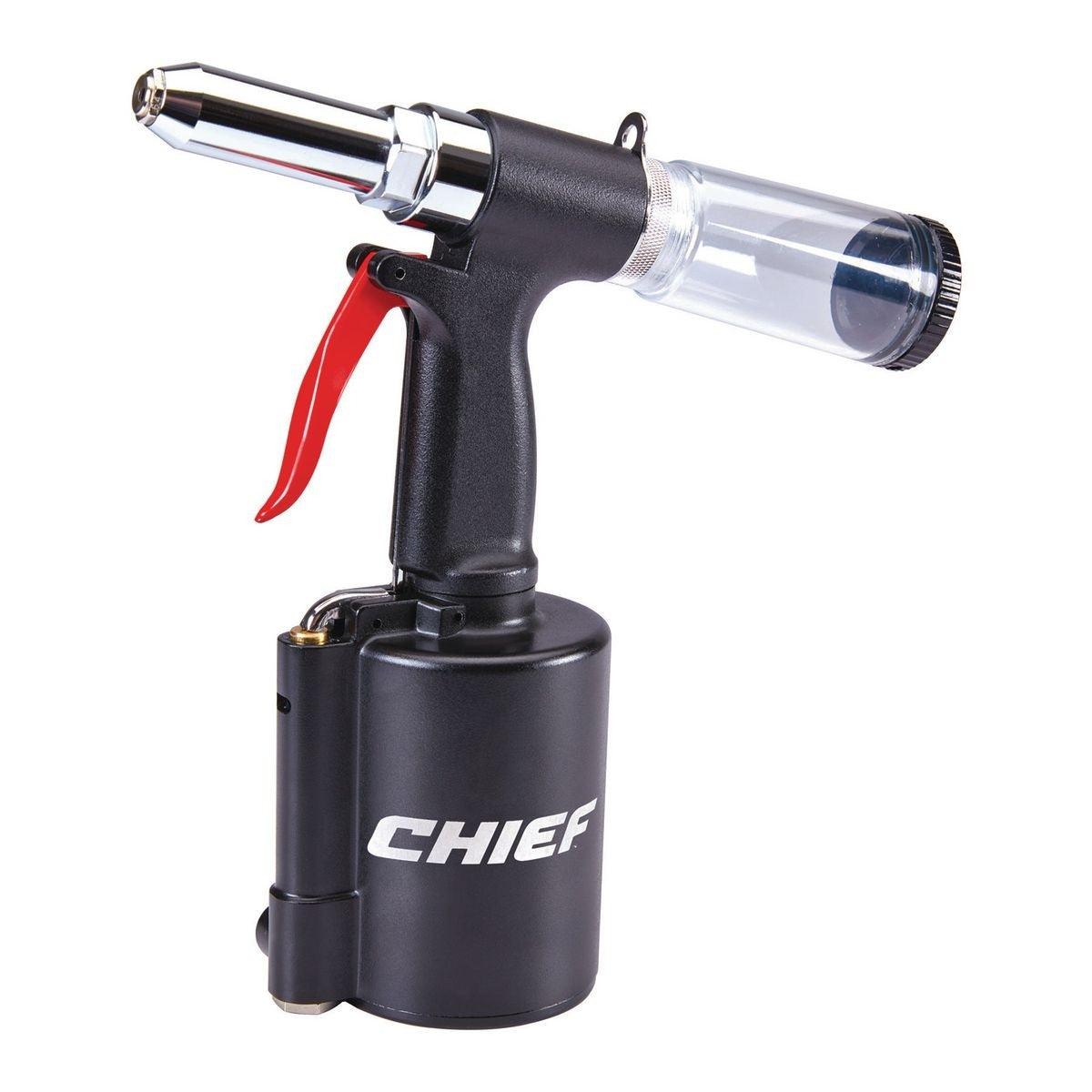 This Professional Air Hydraulic Riveter generates up to 3,400 lbs. of pull force for quick, precise riveting. The lightweight body is easy to handle and tough enough to take a beating. Six nosepieces let you work with a wide range of rivet sizes. Features include a safety cap to collect spent rivet pins and an air relief valve to prevent overloading.
