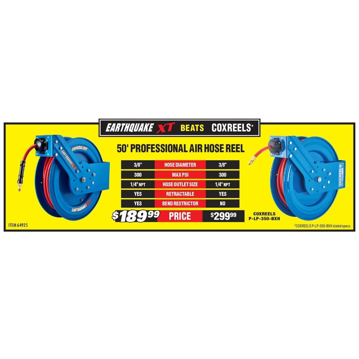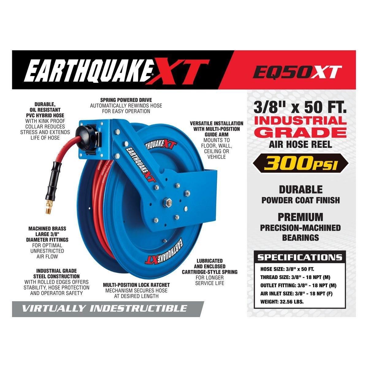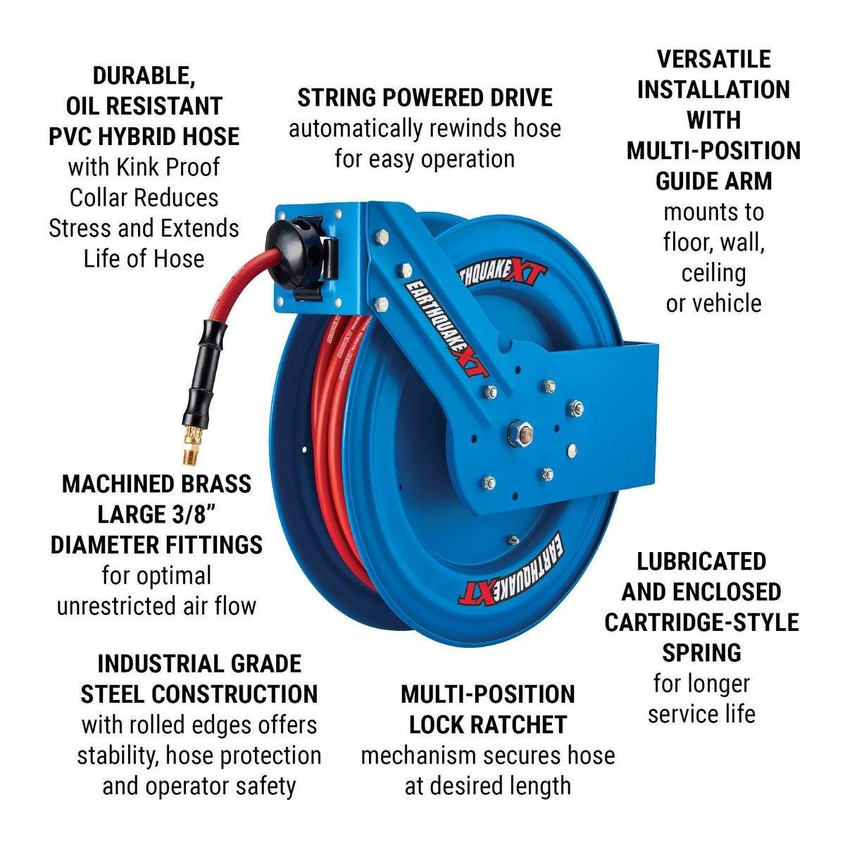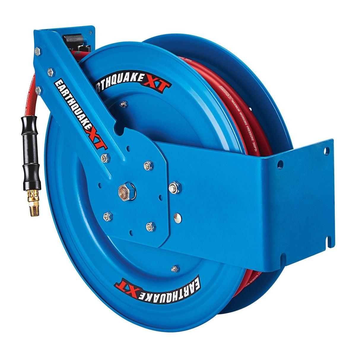 The Earthquake® XT Industrial Grade Air Hose Reel features a virtually indestructible design with high strength steel construction and rolled edges for safety. Tough precision machined bearings deliver smooth action for easy use and extended hose life. A ratchet gear locks the hose at the desired length.