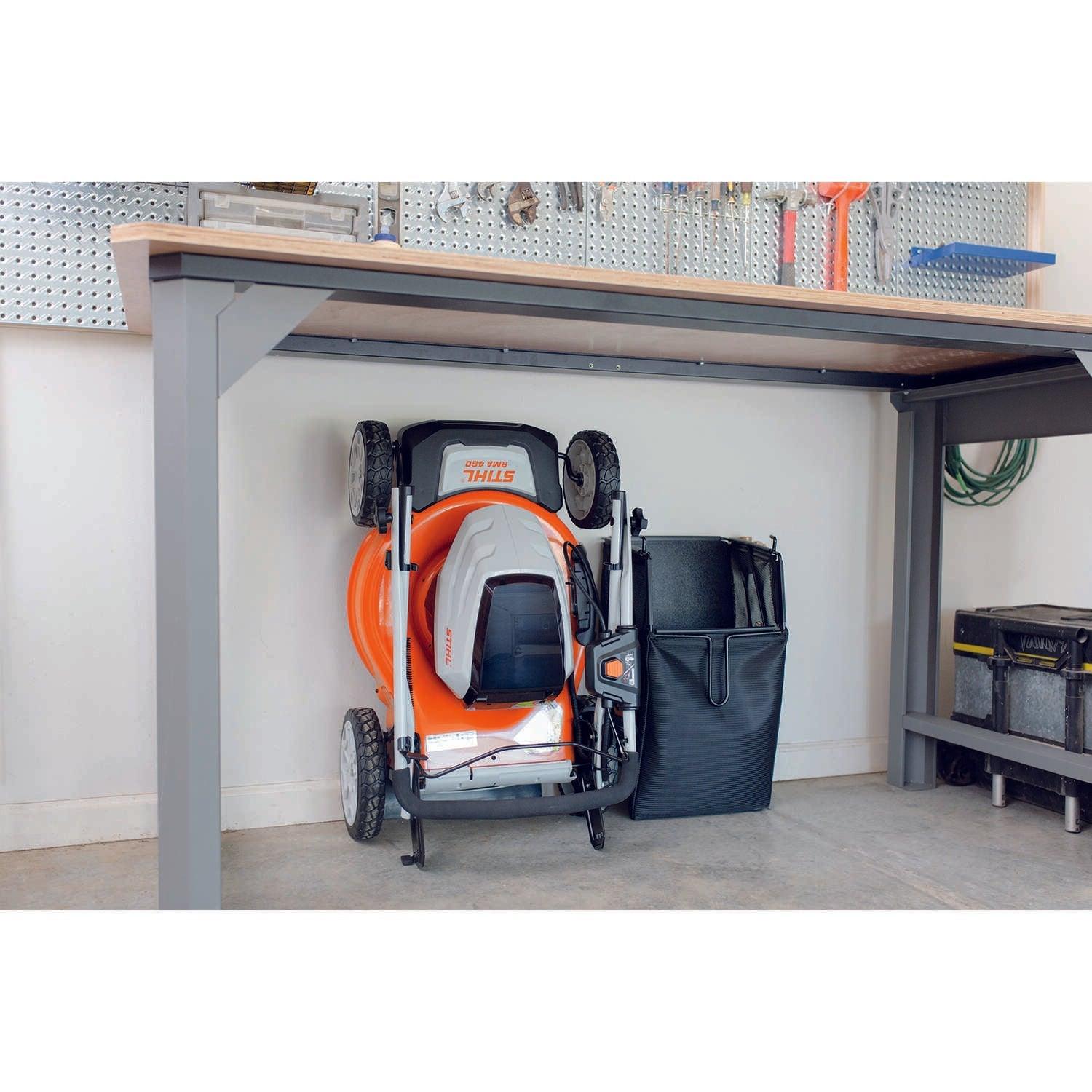 • Allows mower to be stowed in three positions: folded or unfolded on all four wheels or upright and folded in the cleaning position with blades facing the wall to save floor space