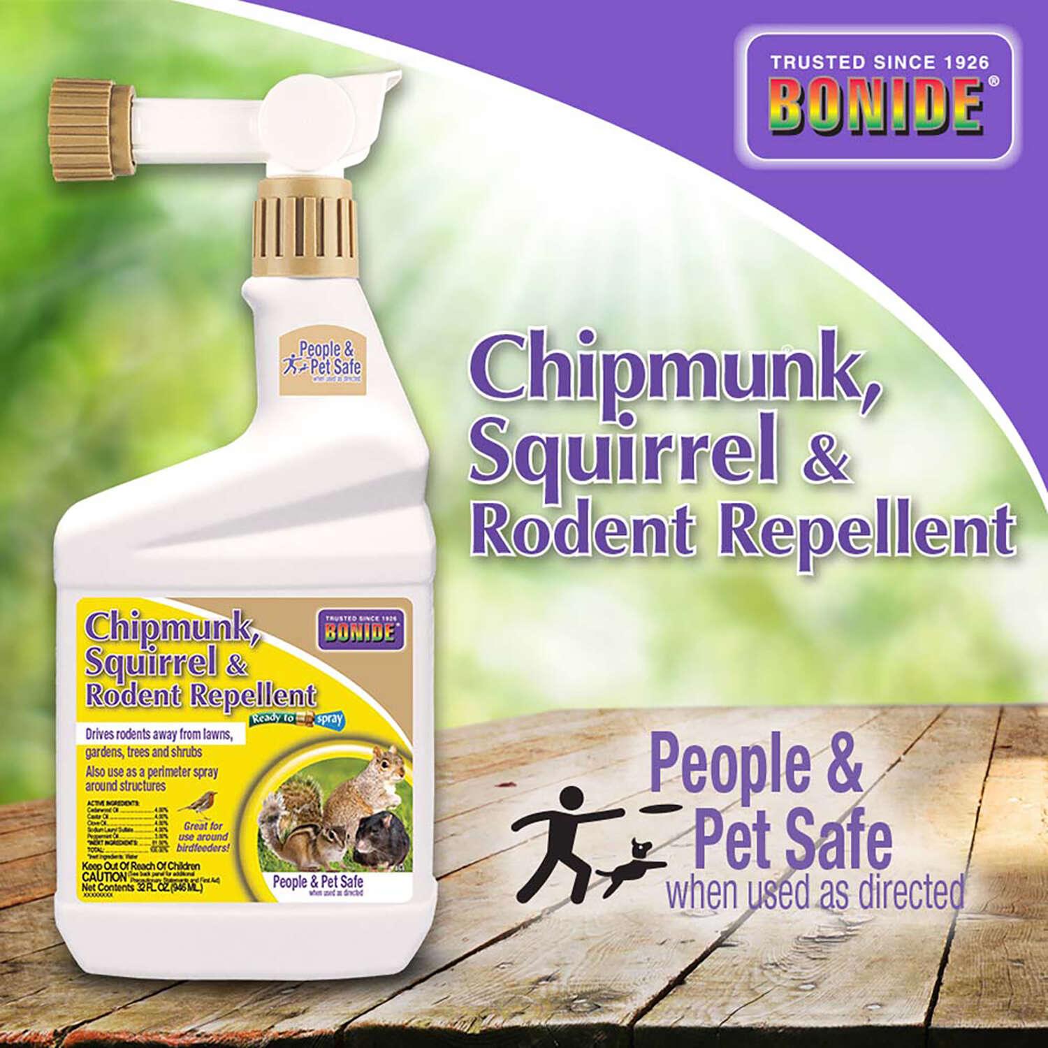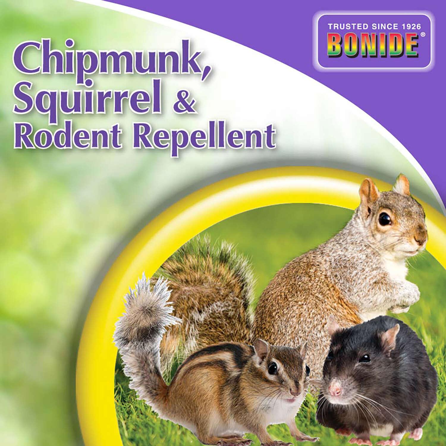 BONIDE Chipmunk, Squirrel & Rodent Repellent is used to repel chipmunks, squirrels, and other listed rodents from your yard. Made with natural ingredients. People & pet safe, when used as directed