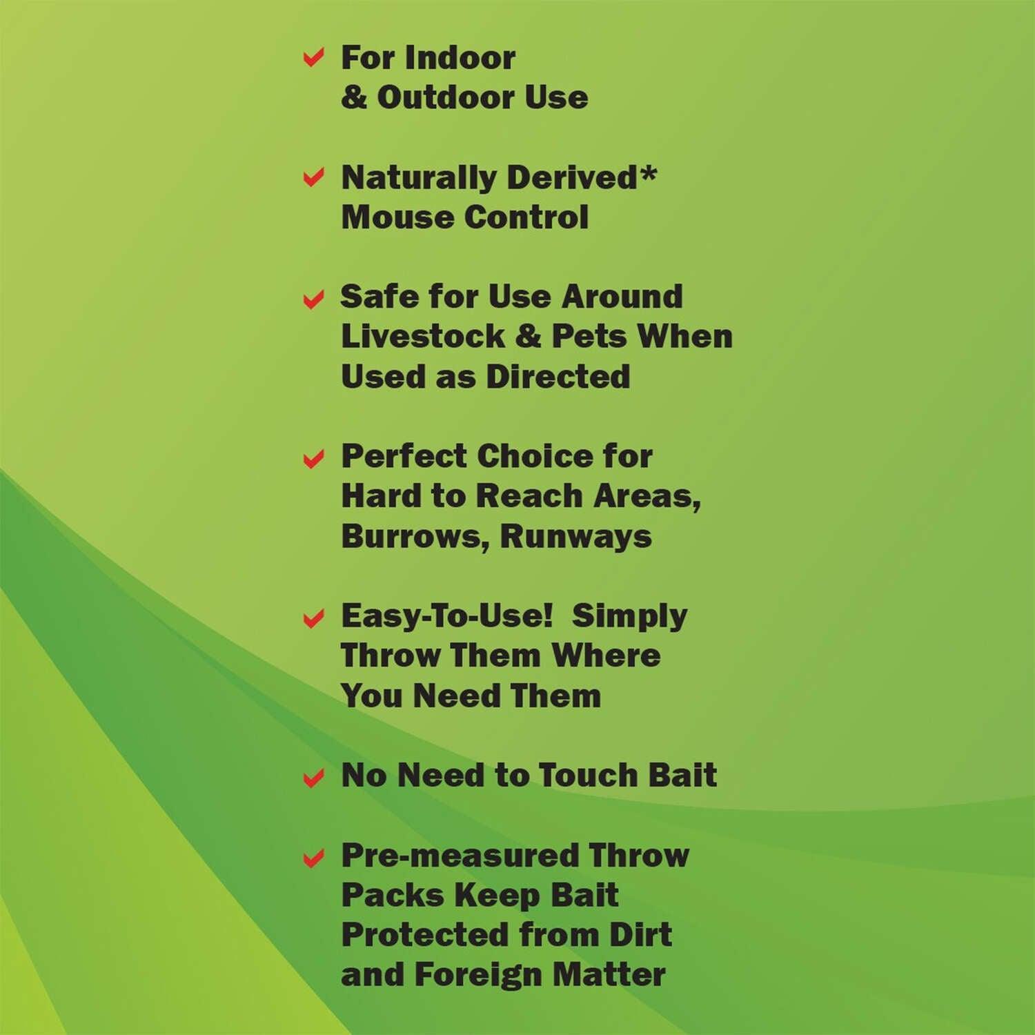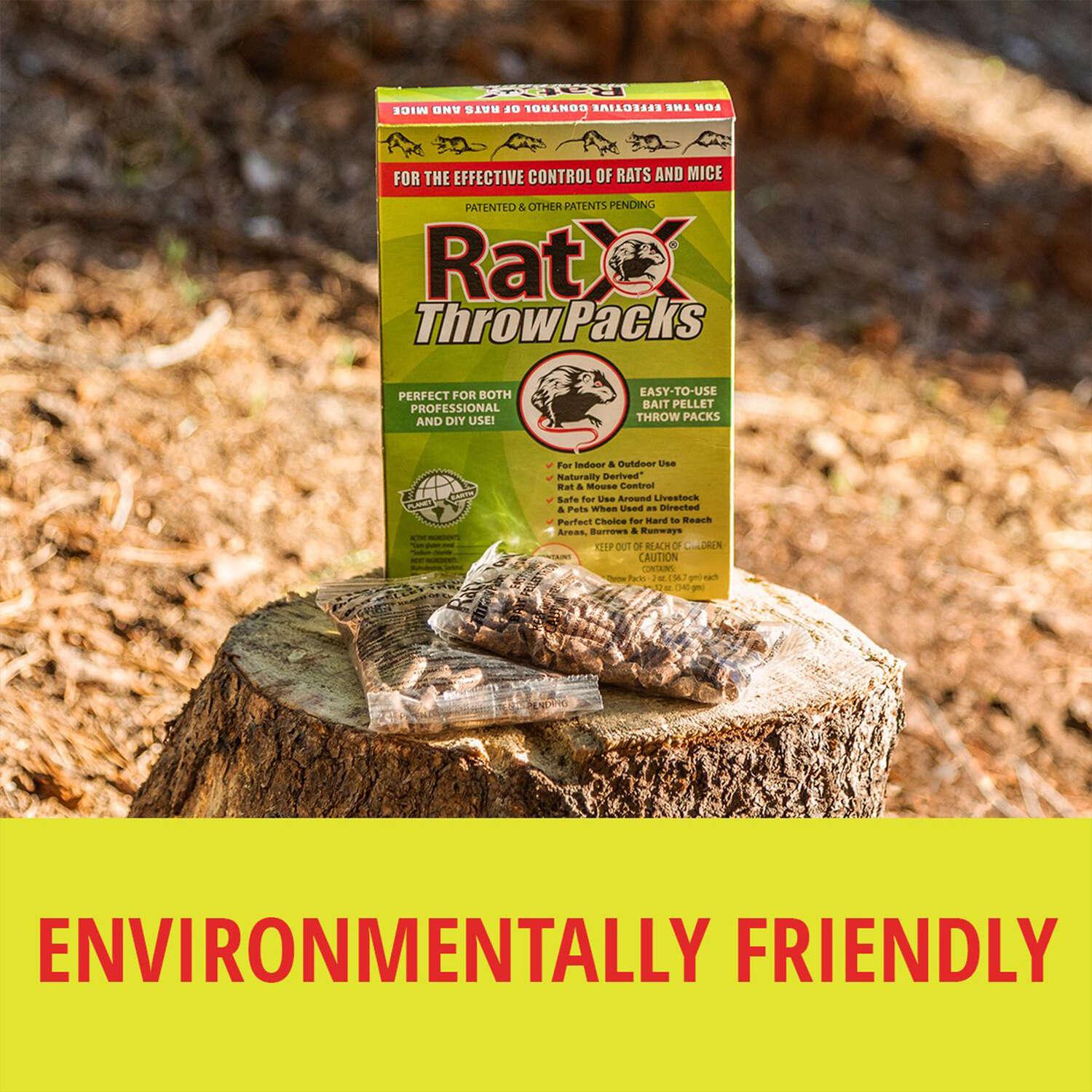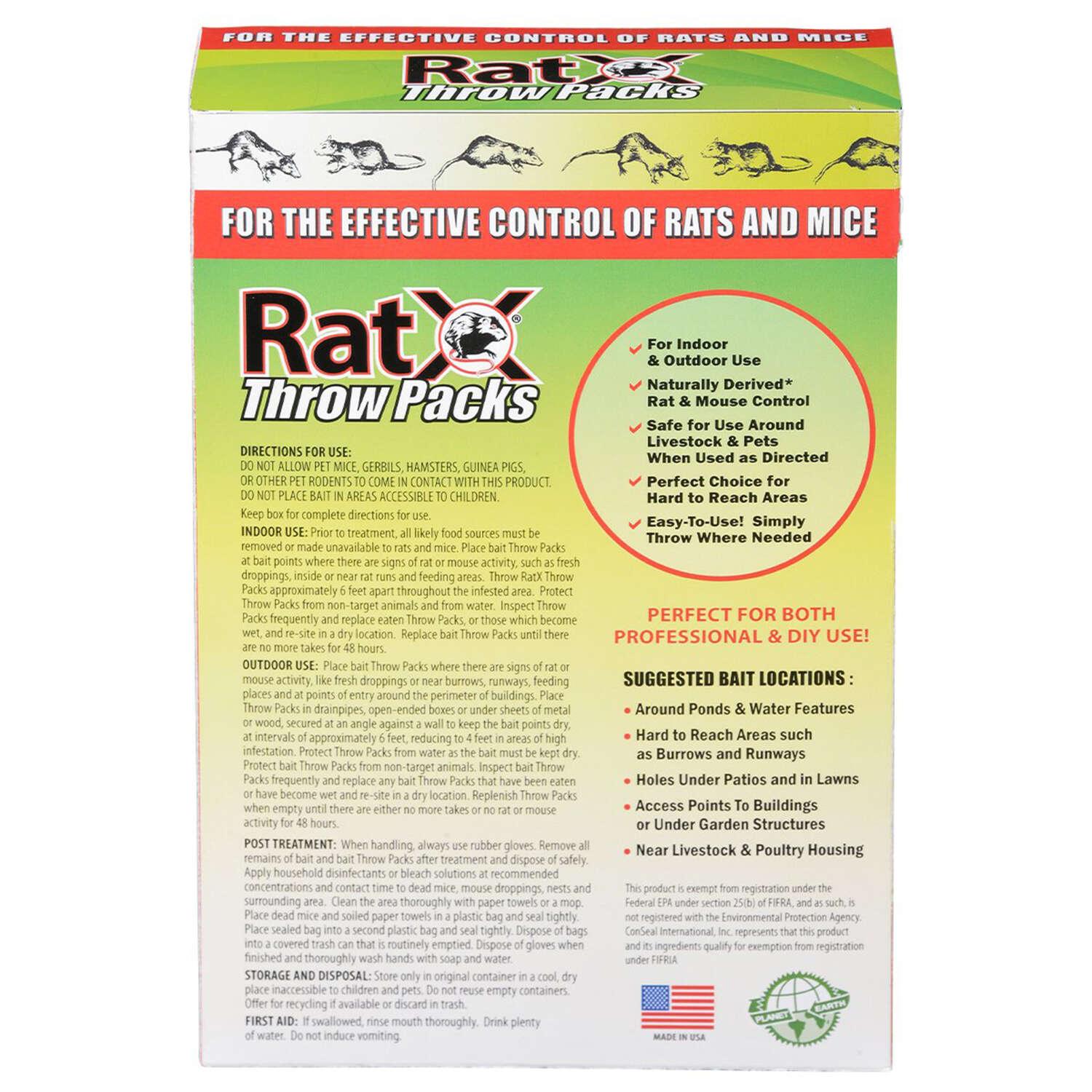 RatX Throw Packs are a new approach to effectively kill unwanted rats and mice from industrial buildings, livestock premises, homes, barnyards and any area where the unwanted pests inhabit. Using non-toxic ingredients, RatX Throw Packs are safe even if accidentally ingested by pets or wildlife. RatX Throw Packs are also safe for birds of prey with no risk of secondary kill. RatX Throw Packs are premeasured packs that make baiting easy, just throw where you see rat or mouse activity.
