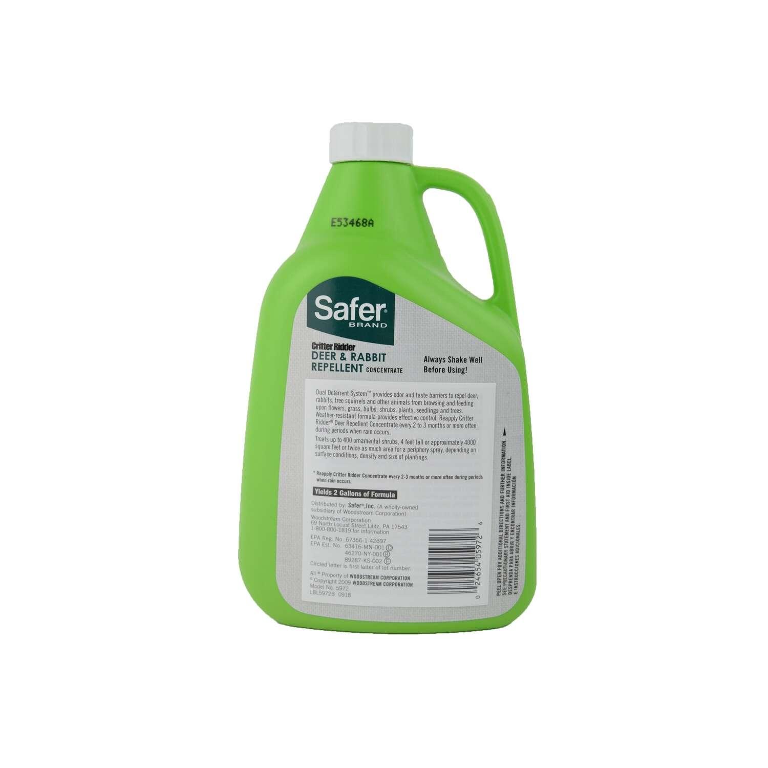 Safer Brand Critter Ridder Deer & Rabbit Repellent Concentrate contains a blend of ingredients to repel deer, rabbits, and squirrels from your yard. The unique concentrate repels by overwhelming the animals senses of scent and taste. The formula contains putrescent egg, which resembles the odor of a decaying prey. As a second layer of protection, Critter Ridder contains spicy peppers and garlic, causing an unpleasant taste. These ingredients signal a flight response and train the animals to stay away from the area. Critter Ridder Deer & Rabbit Repellent Concentrate Repellent is weather resistant, and can be used outdoors in places such as lawns, gardens, near trash cans, and more. To use, mix a small amount of concentrate with water in a reusable spray bottle until you reach your desired amount of solution. The 32 oz bottle can protect up to 4,000 sq ft for up to 90 days- providing you with long-lasting protection.