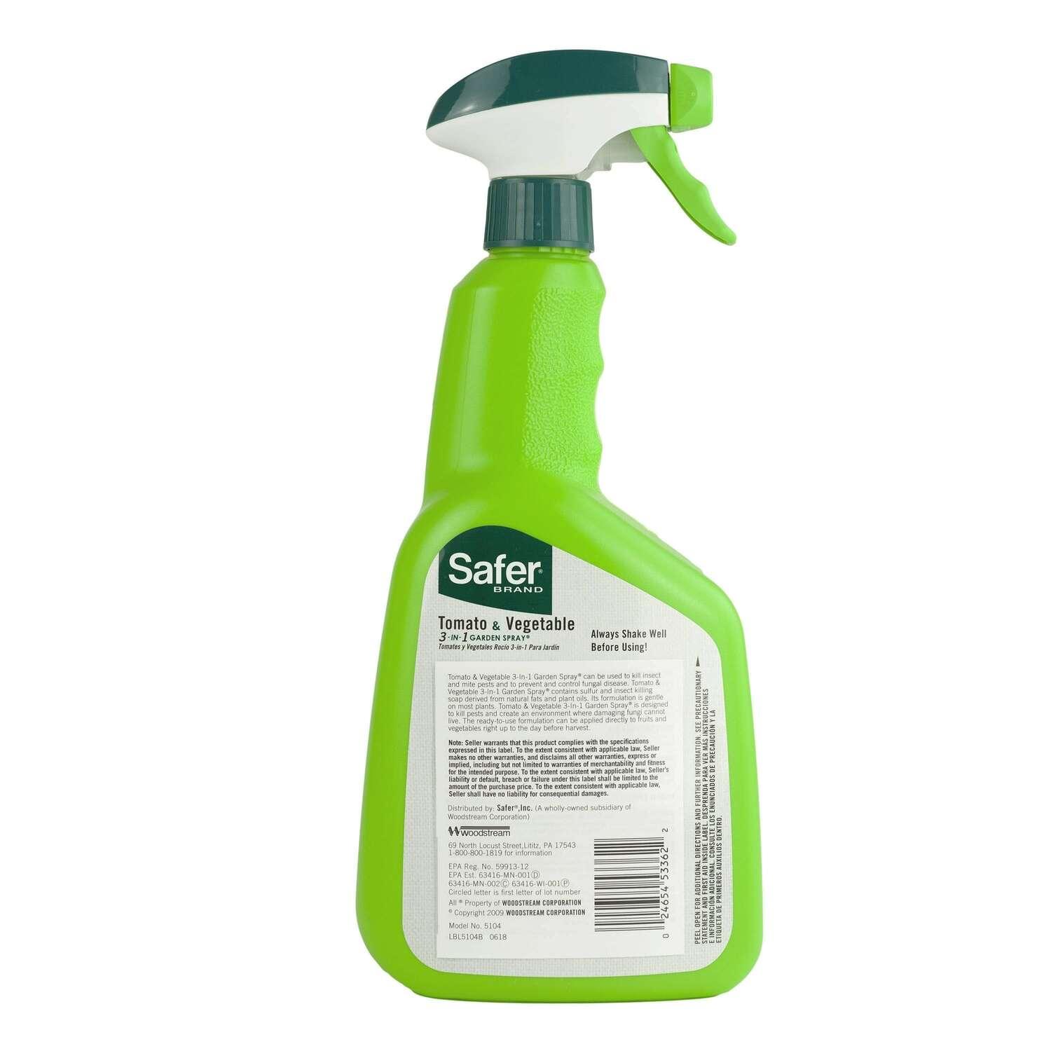 Safer Brand Tomato & Vegetable 3-in-1 Garden Spray contains sulfur and insect killing soap to work as a fungicide, insecticide and miticide, providing a 1-2-3 punch to knock out your garden problems. With the 3-in-1 Garden Spray, you no longer have to be a gardening expert to have a healthy garden! The multi-purpose nature of this 3-in-1 Garden Spray makes caring for your tomato and vegetable plants easy. This product eliminates mites and insects, as well as a large number of plant diseases. Its formulation is gentle on most plants and can be used up until the day before harvest.
