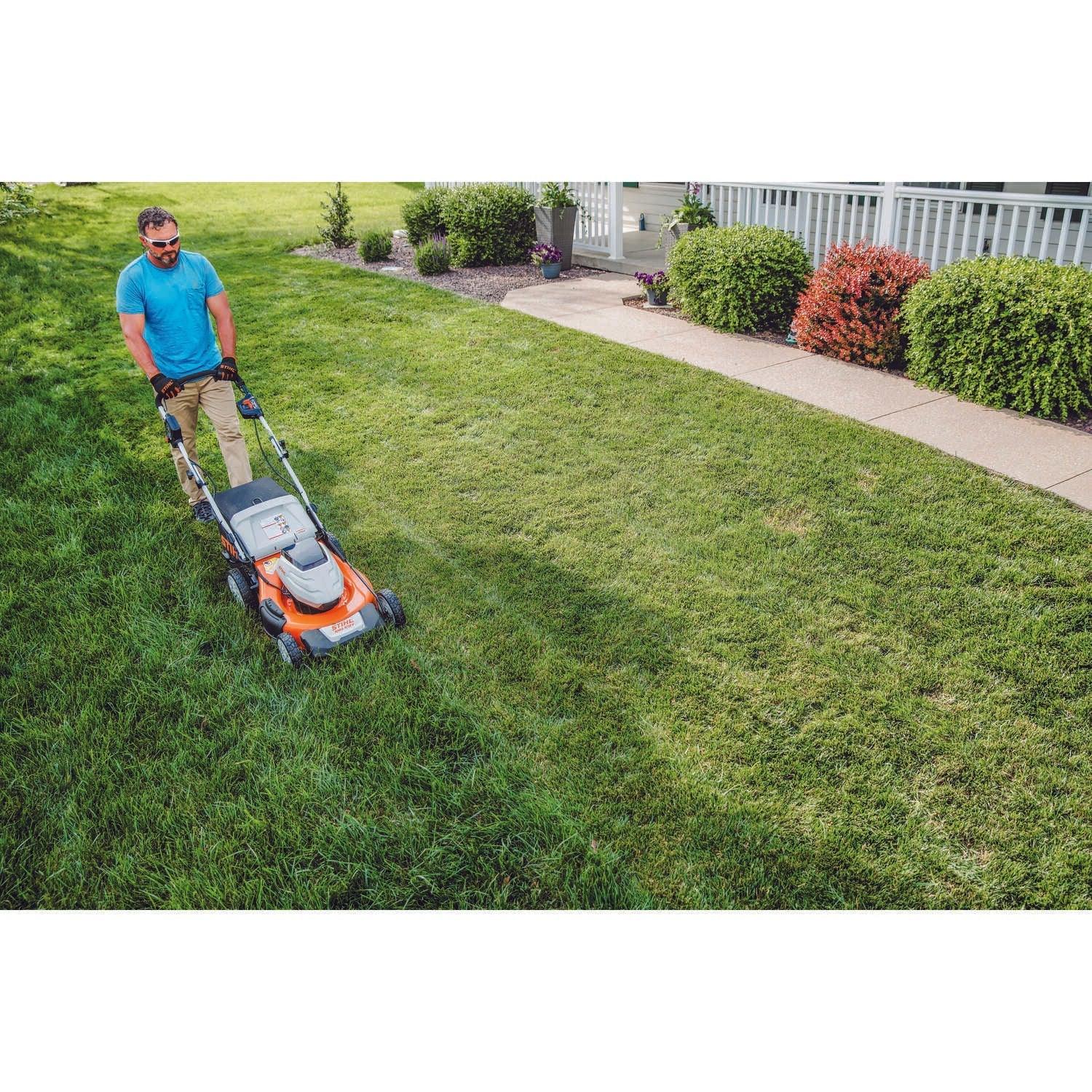 Just the squeeze of a lever engages the RMA 510 V battery-powered lawn mower’s efficiency driven performance, helping reduce user fatigue commonly caused by traditional push mowers. A 21-inch deck with a 20-inch cutting width makes the RMA 510 V highly maneuverable and able to quickly cover small-to-medium size yards. The mower’s self-propel function features a variable speed setting control, allowing the user to choose a mowing speed between 0.6 mph to 2.8 mph. With the 36-volt STIHL AP 300 battery, the RMA 510 V can mow up to 2,583 square feet on a single charge. For added convenience and customization, the deck of the RMA 510 V is adjustable to seven different cutting heights. The handlebar adjusts to three height positions for user comfort. Durable, 10-inch rear wheels and 8-inch front ball-bearing wheels allow for mowing over rough terrain. Run time may vary based on battery type, charge level and capacity, model, operating style and conditions. Batteries and chargers can be purchased separately or as a combined set with tool.