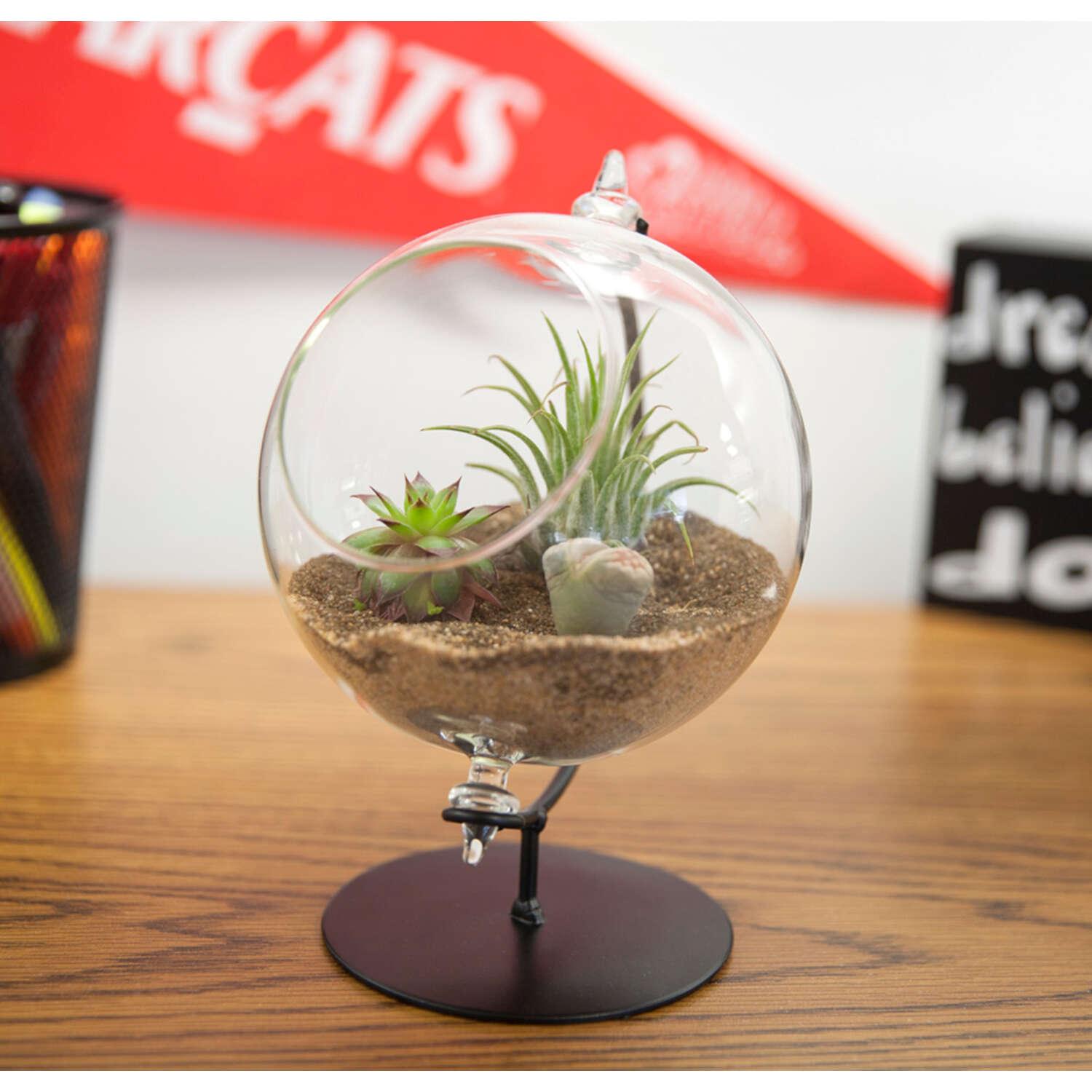 Enhance your desk with charming greenery using this Desktop Glass Terrarium with Metal Stand. This adorable, circular vessel sits in a custom metal holder easily and wonderfully showcases a few small plants. Finials at both the top and base of the vessel slide into openings on the artistic, metal stand, keeping the terrarium upright and resting levelly on your table or windowsill. Reach through the 2.75" diameter opening on the front of the piece to add plants and substrate, which remain visible through the clear glass. A 3.375" diameter disc forms the stable base for the metal stand and its single-arm arches perfectly behind the planter for a precise fit. The black color of the metal stand meshes with many settings and makes viewing and maintaining your plants simple.