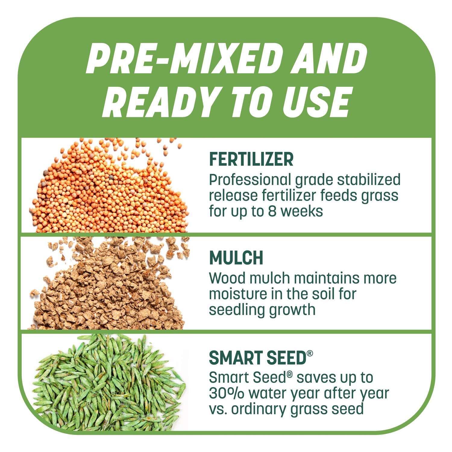 - Smart seed, fertilizer and mulch repairs bare spots in lawn