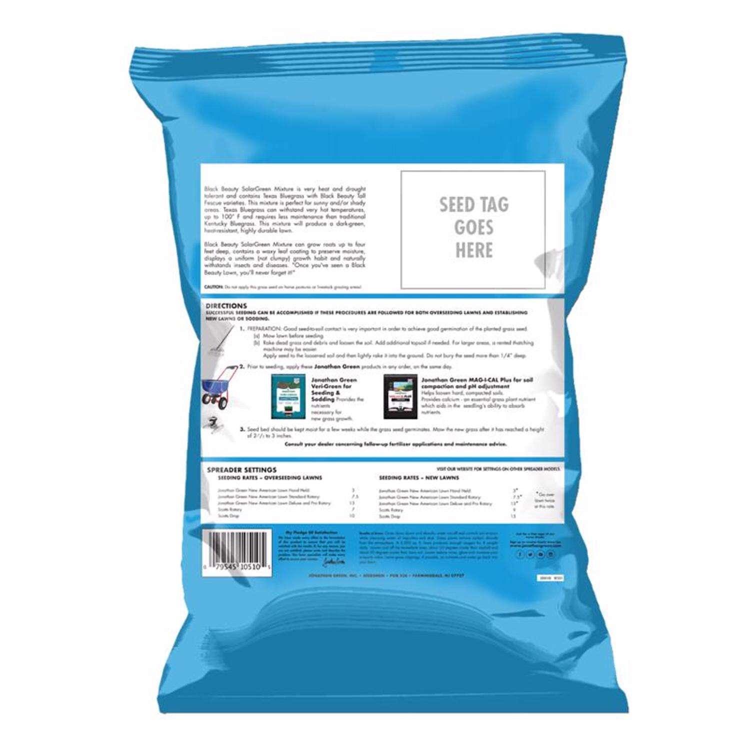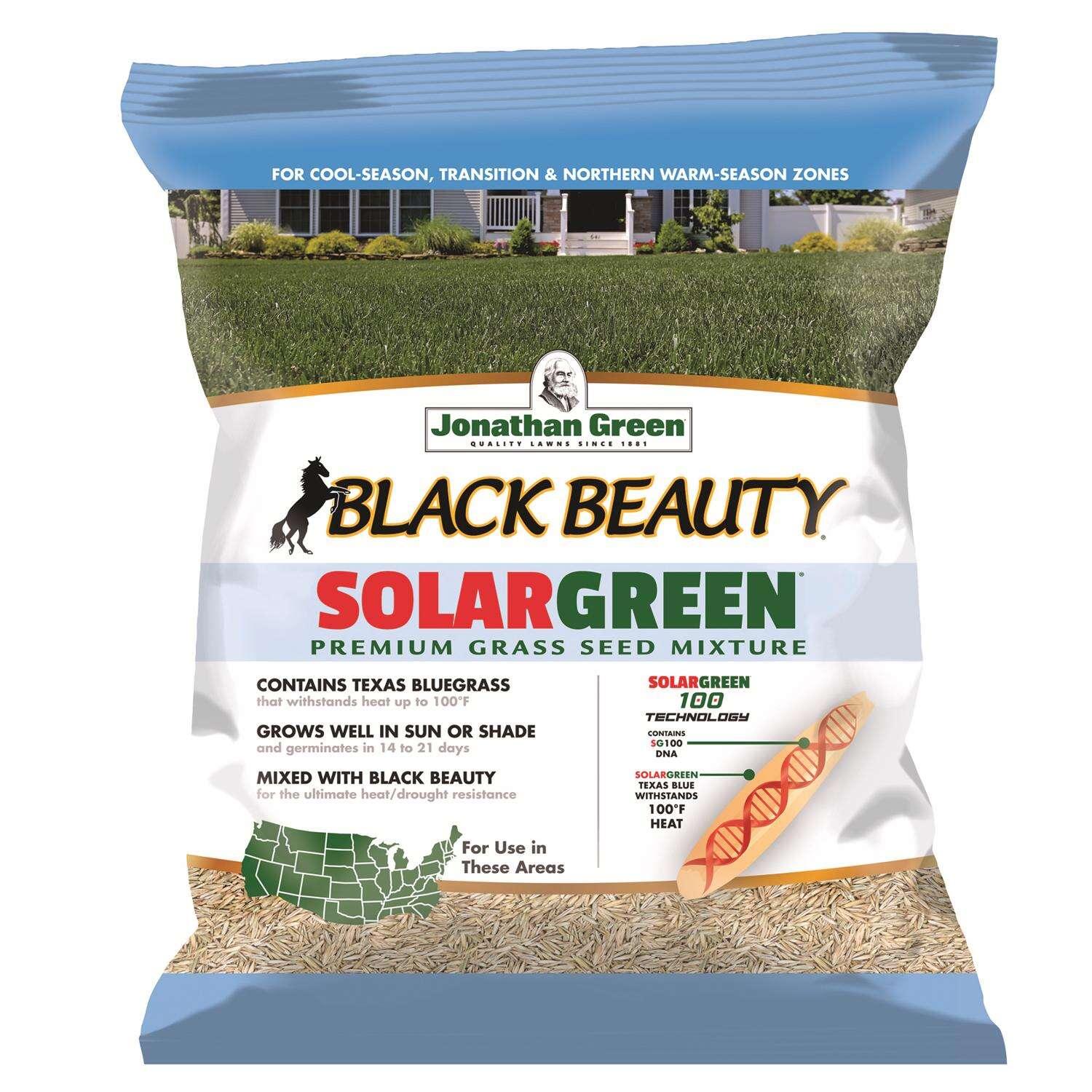 Jonathan Green Black Beauty SolarGreen Texas Bluegrass Grass Seed is our most heat and drought tolerant grass seed mixture yet. It contains Texas Bluegrass and Black Beauty turf-type tall fescues which makes it perfect for sunny and/or shady areas. SolarGreen Texas Bluegrass can withstand very hot temperatures, up to 100°F and requires less maintenance than traditional Kentucky Bluegrass.
