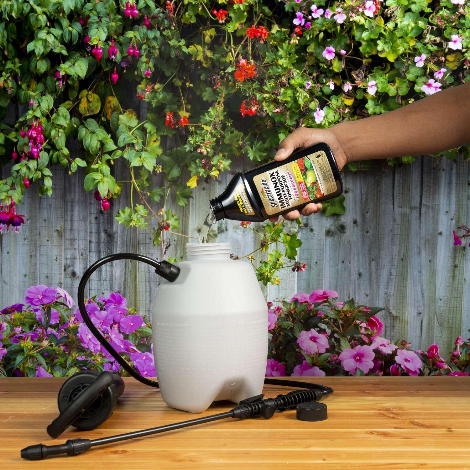 Spectracide Immunox Multi-Purpose Fungicide Spray Concentrate For Gardens cures and prevents all major diseases on roses, flowers and ornamental shrubs. One treatment protects for up to 2 weeks. This concentrate can’t be washed off by rain once dry. Use it to control brown patch, powdery mildew, black spot, rust, blights, leaf spot, mold, scab and more on ornamentals, lawns, trees, fruits, nuts and vegetables as listed. This concentrated formula is highly effective when used to prevent diseases or when applied at the first sign of disease. Consider treating early in the season. Apply once every two weeks throughout the season until conditions favoring disease development (hot, humid weather) are no longer present. For fruits, nuts, berries and vegetables, treat as directed on the label for your particular type. Mix with water in a garden sprayer (not included) at the rates directed on the label.